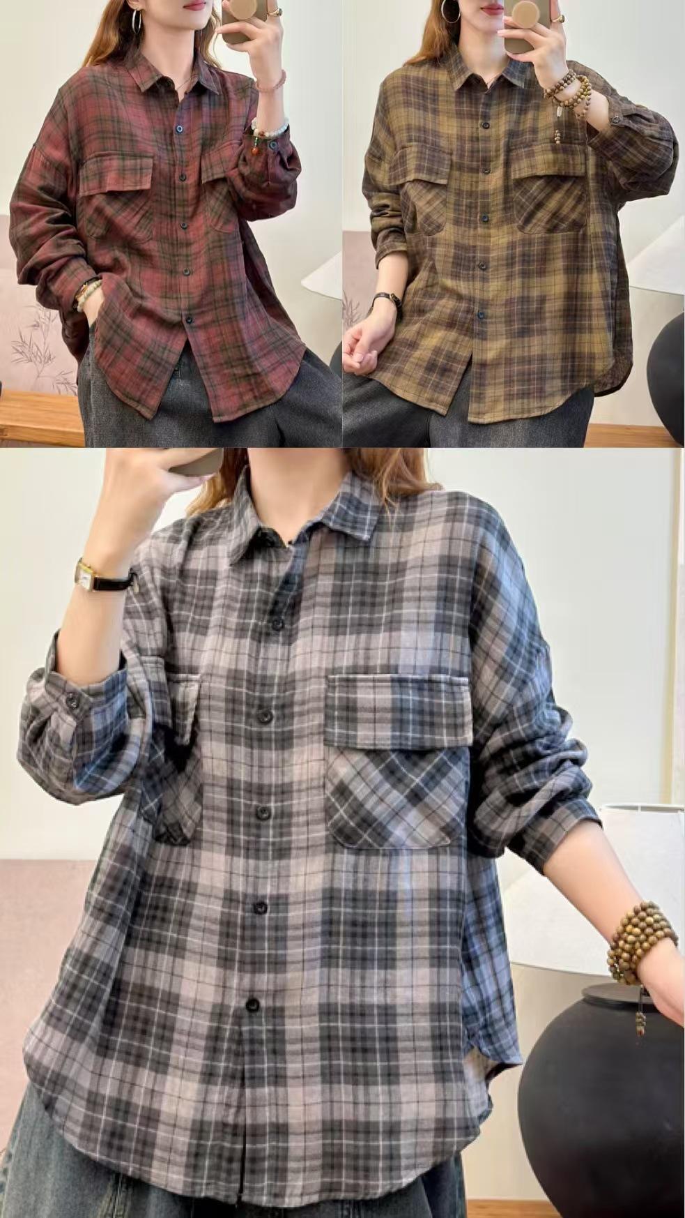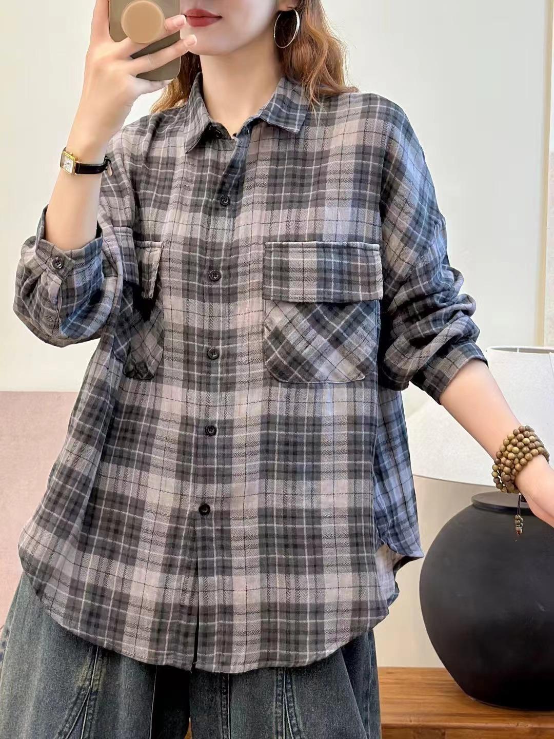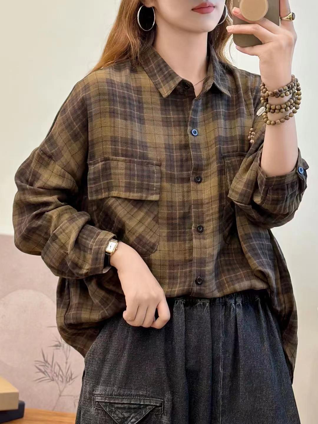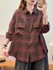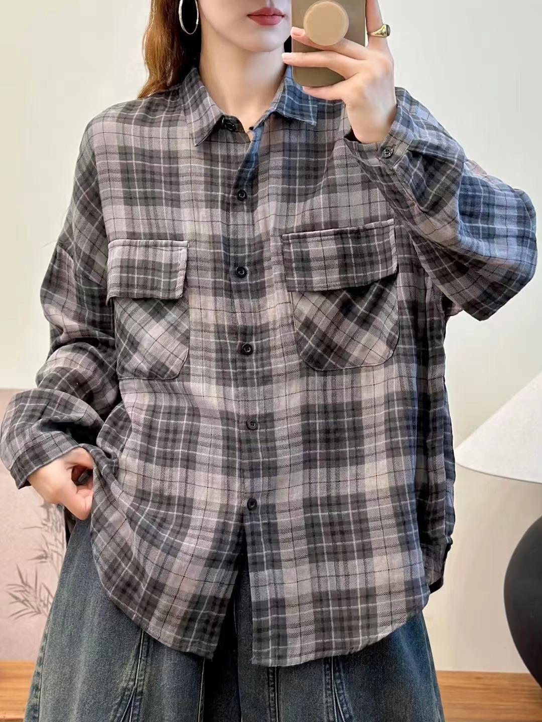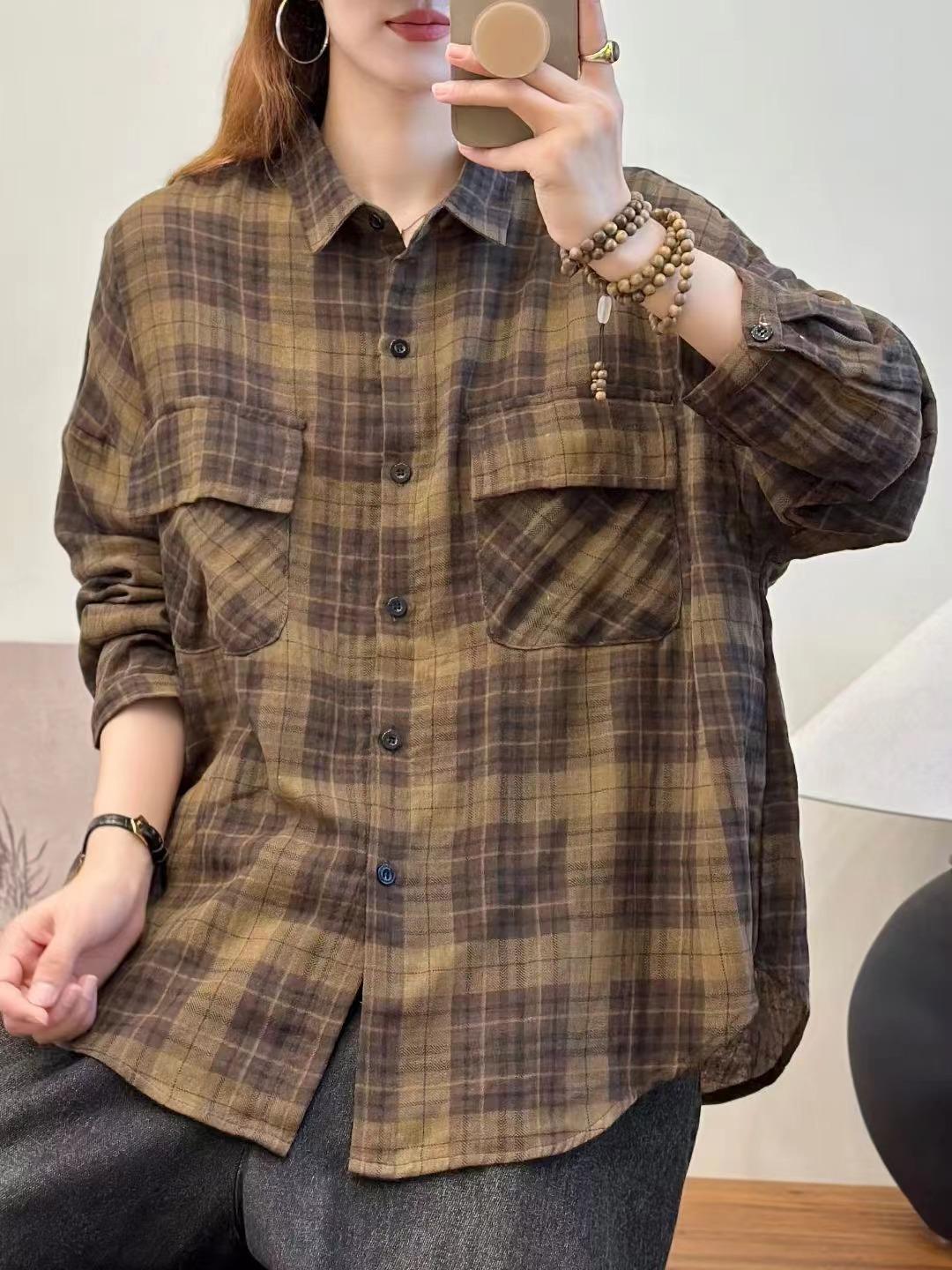 Camisa de otoño nueva informal de manga larga con doble capa de hilo de algodón a cuadros para mujer, ajustada, de talla grande