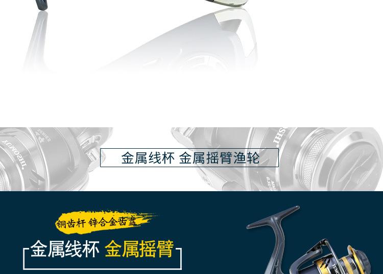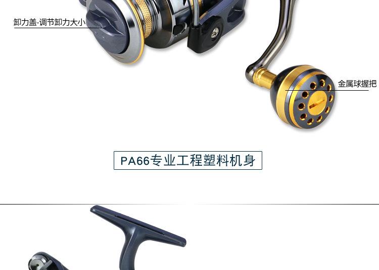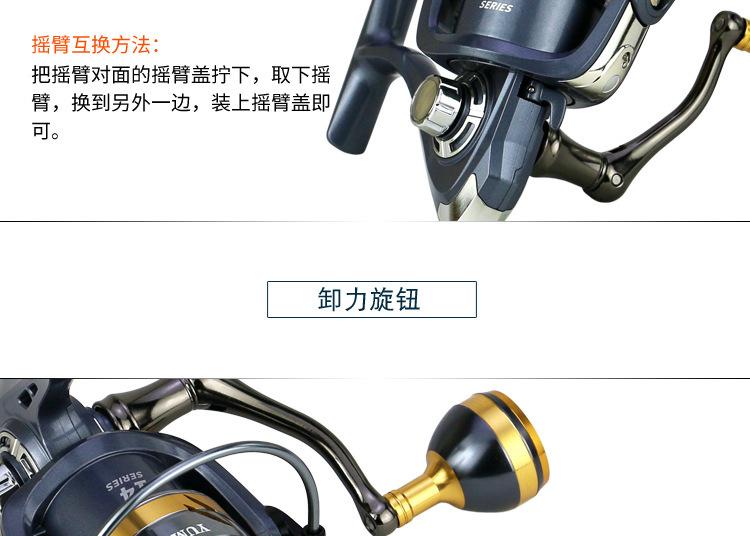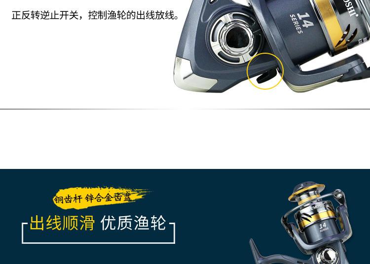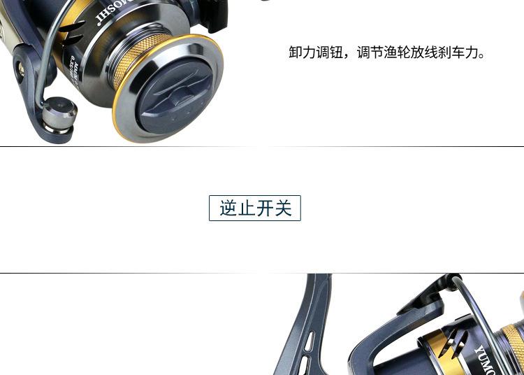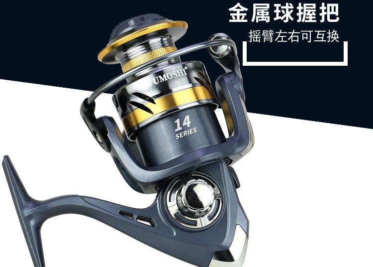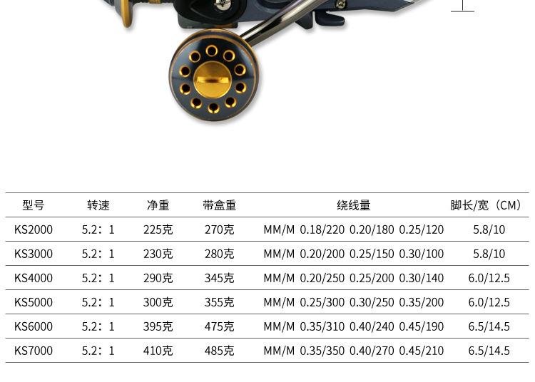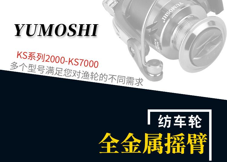 Configuración del modelo KS2000-7000 de la marca YUMOSHI: carrete metálico, cuerpo de plástico, línea de lance gruesa, balancín totalmente metálico, empuñadura de bola metálica. Placa de resonancia metálica, placa de engranajes de aleación de zinc, transmisión por varilla de engranajes de cobre.