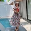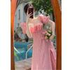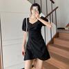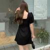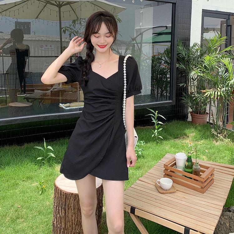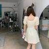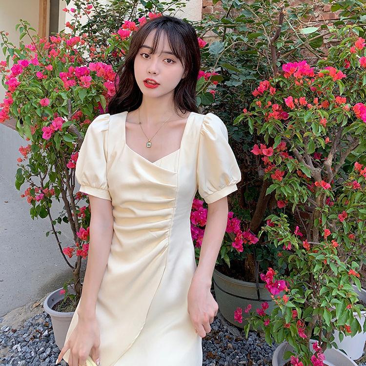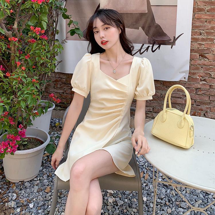 Falda francesa de verano 2025 con mangas abullonadas, cuello cuadrado, cintura irregular, plisada, manga corta, vestido de longitud media