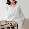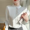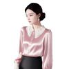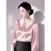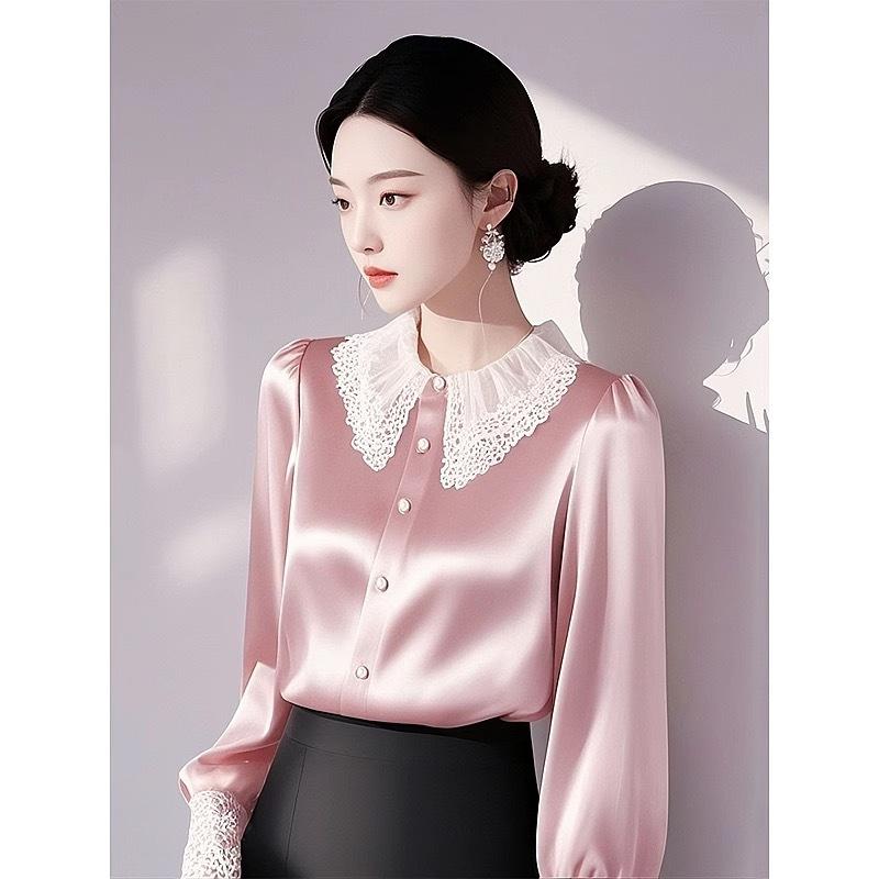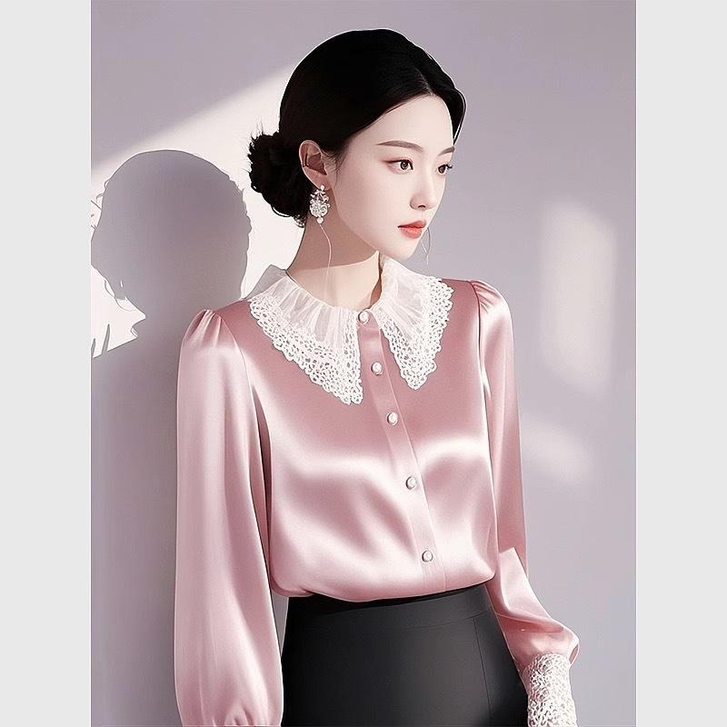 Camisa elegante de satén rosa con borde de encaje para mujer, primavera 2025, nuevo estilo, camisa de manga larga con solapa francesa y cintura moderna