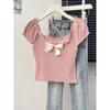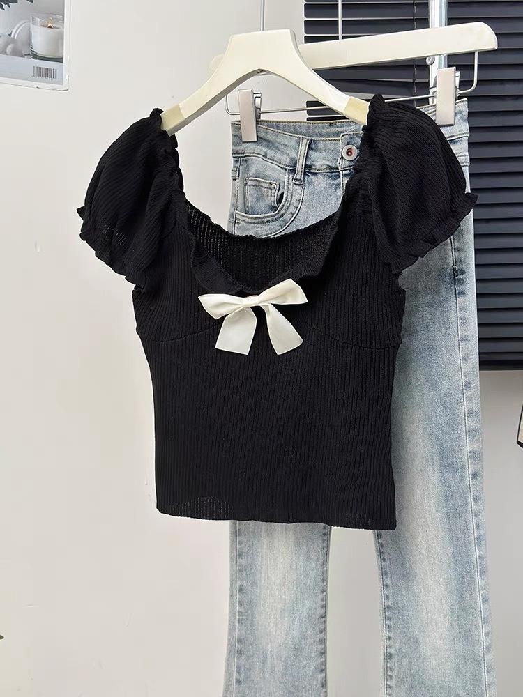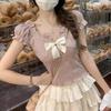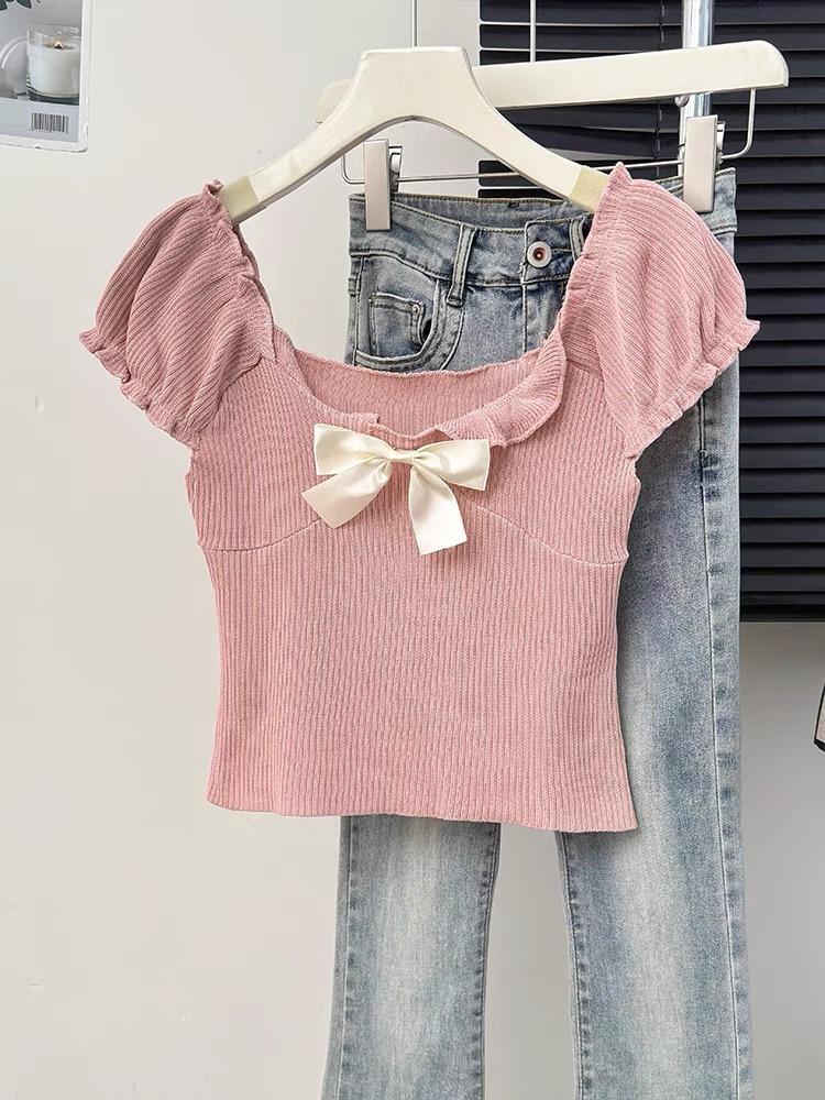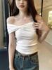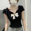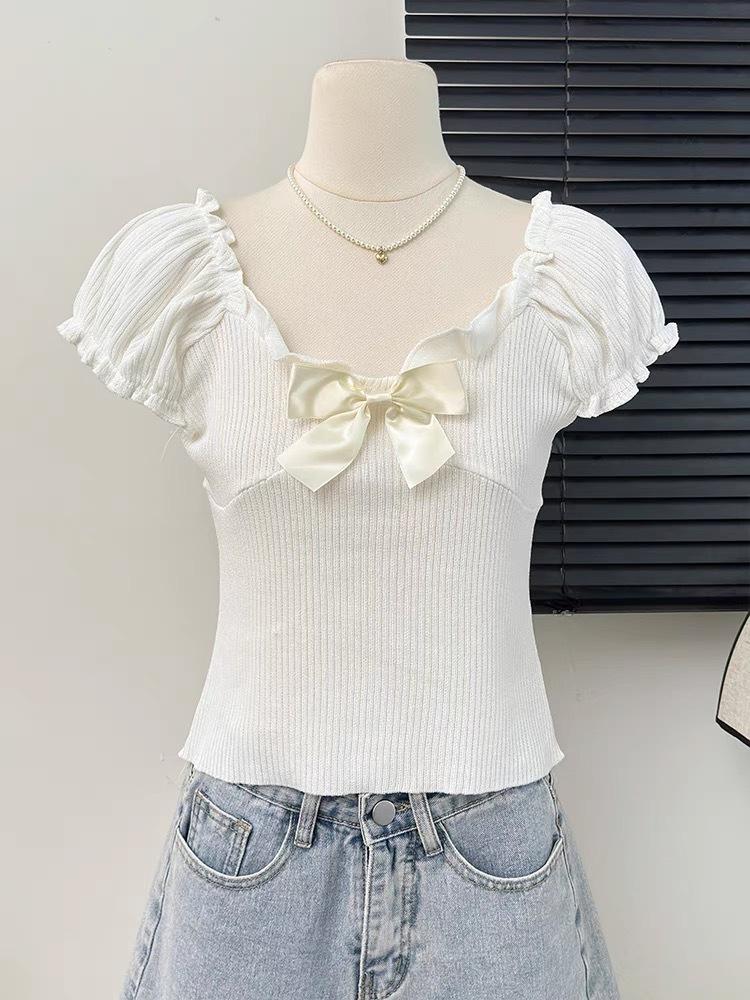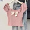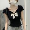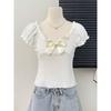 Camisa de manga corta con lazo en los hombros para mujer, nuevo diseño de verano 2025, top corto ajustado con hombros descubiertos