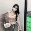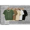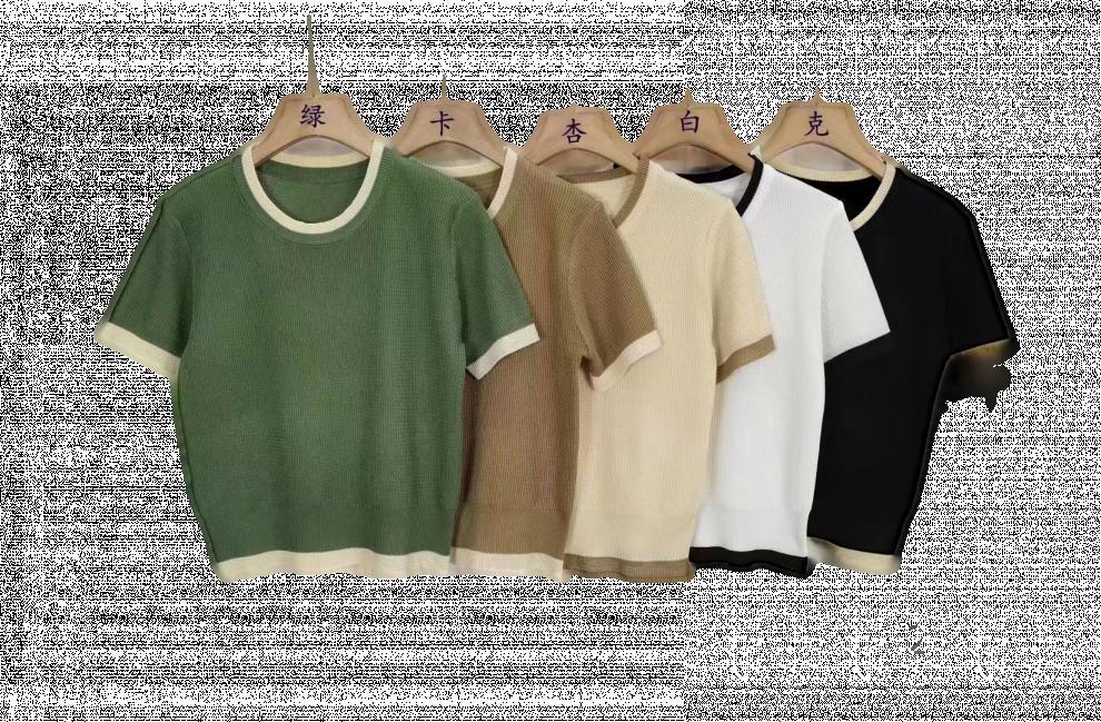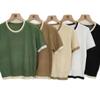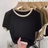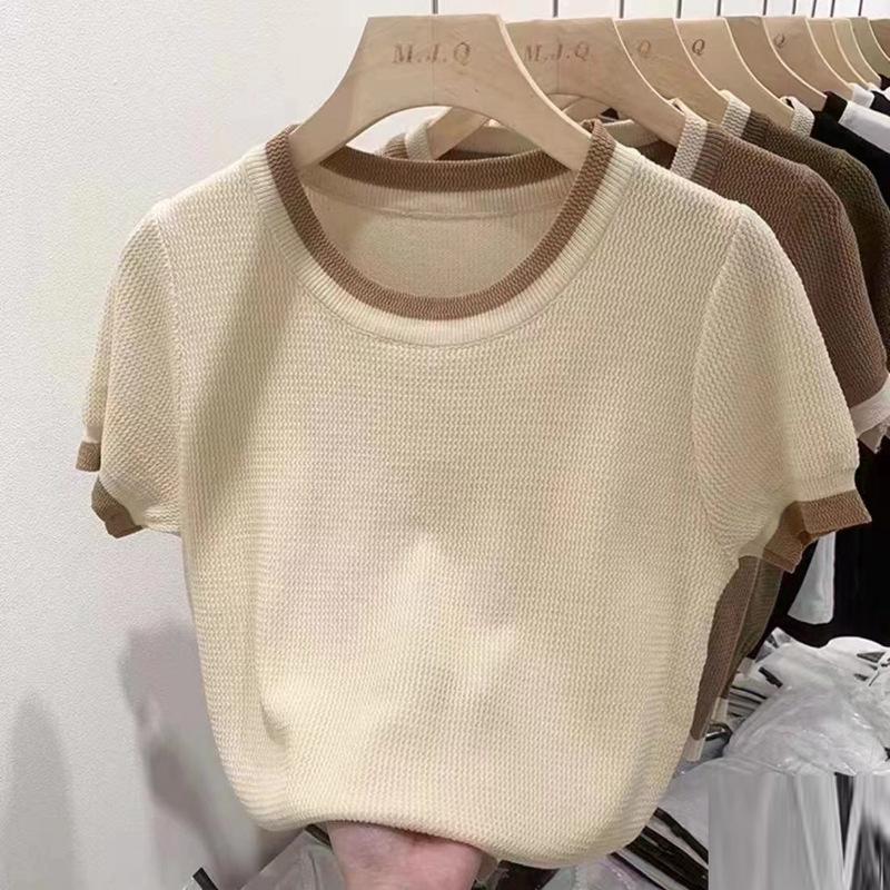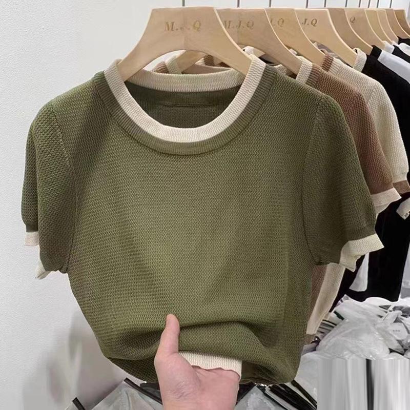 Suéter liso de manga corta para mujer, cuello redondo y hombros descubiertos, top chic de verano 2025 con base francesa en contraste.