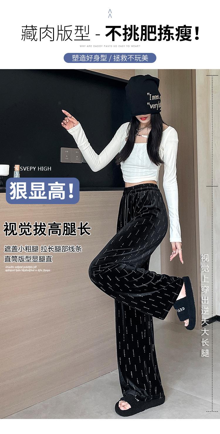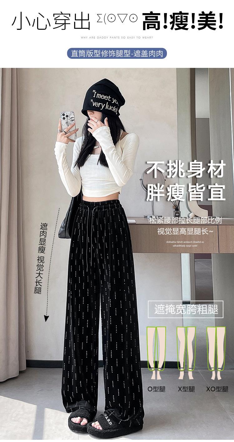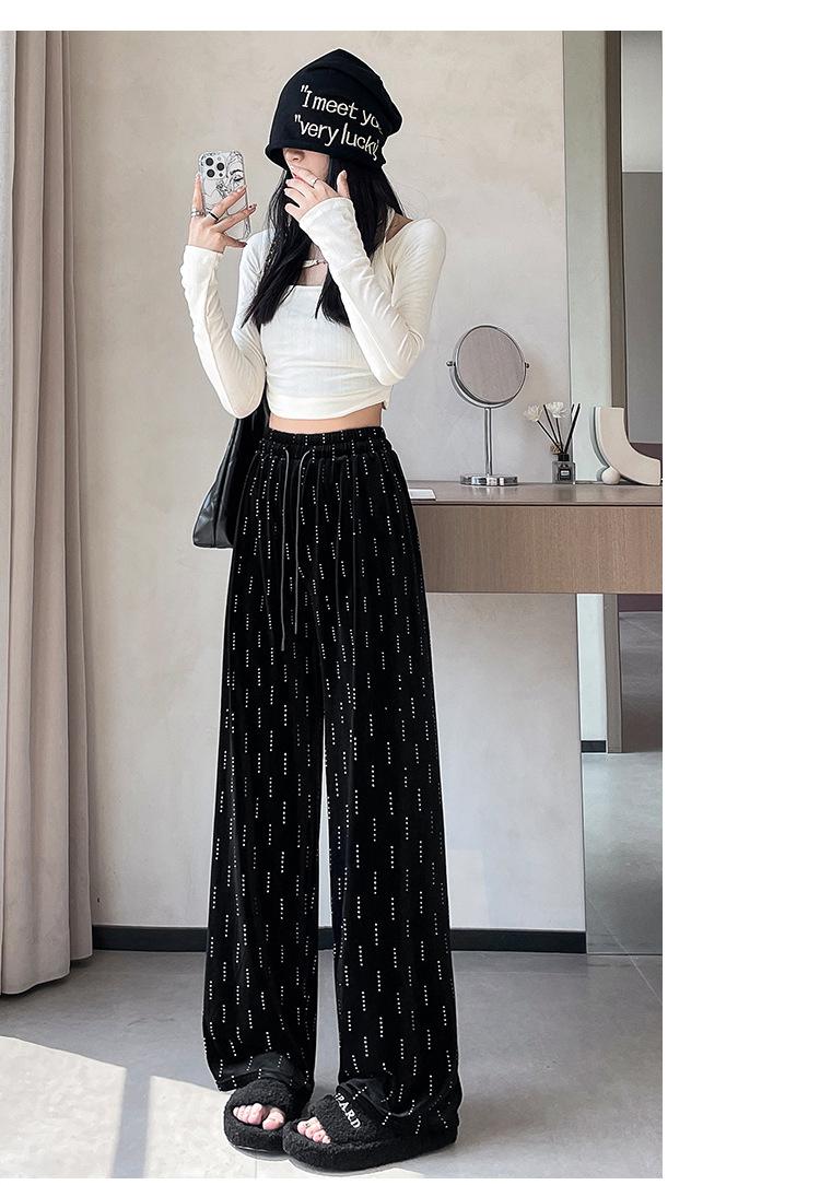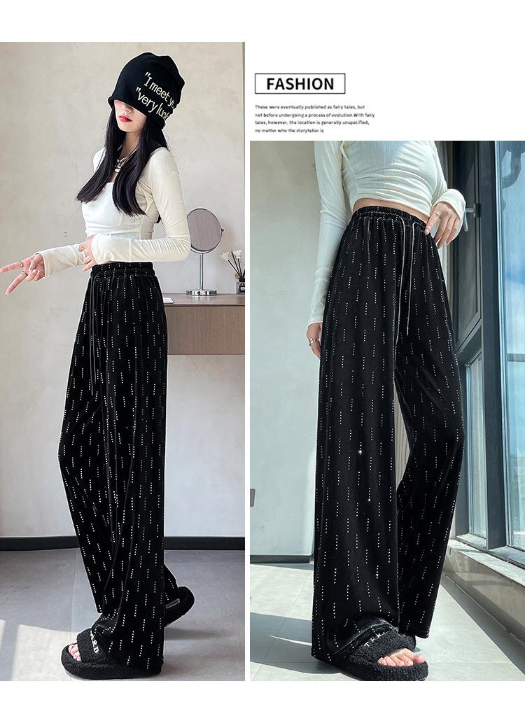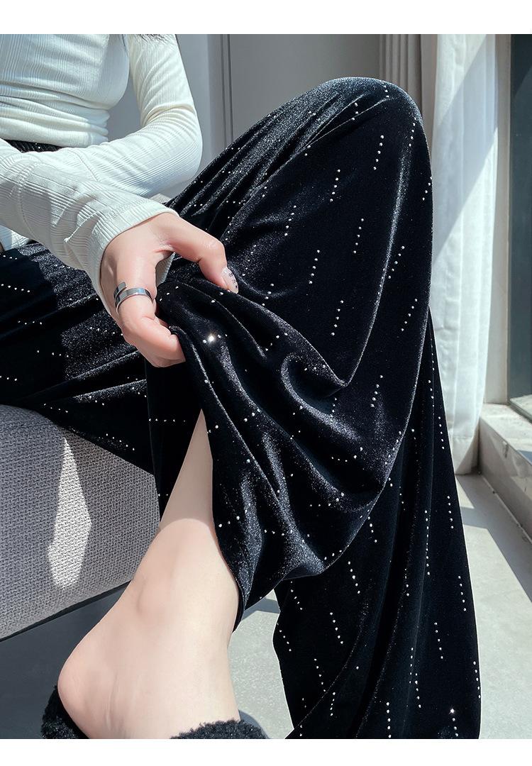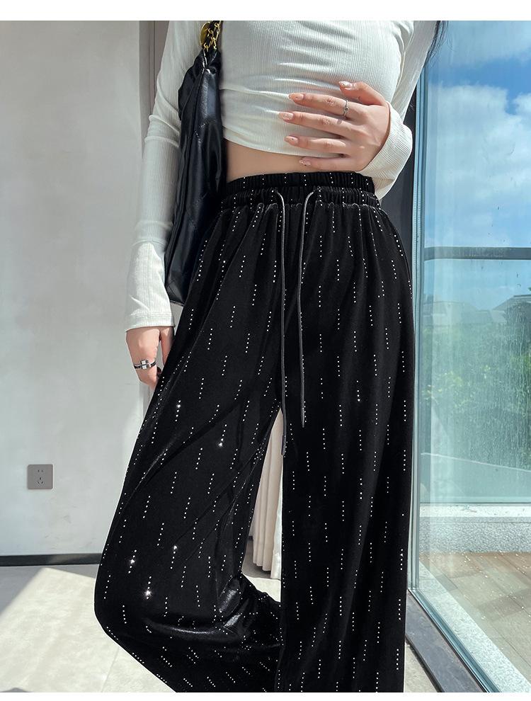 Pantalones Casuales de Terciopelo Negro con Pedrería para Mujer, Otoño 2025, Pantalones Rectos Drapeados con Cordón, Pantalones Adelgazantes de Cintura Alta de Pierna Ancha