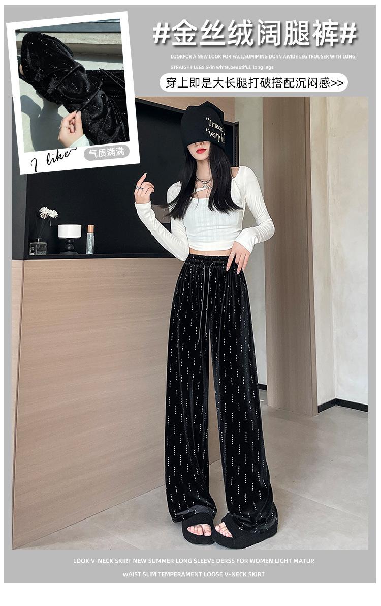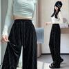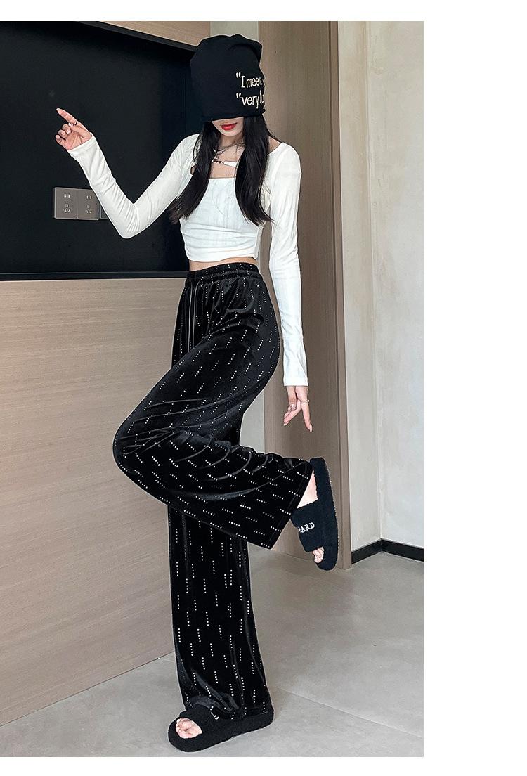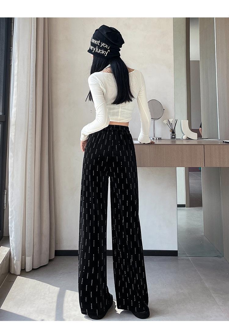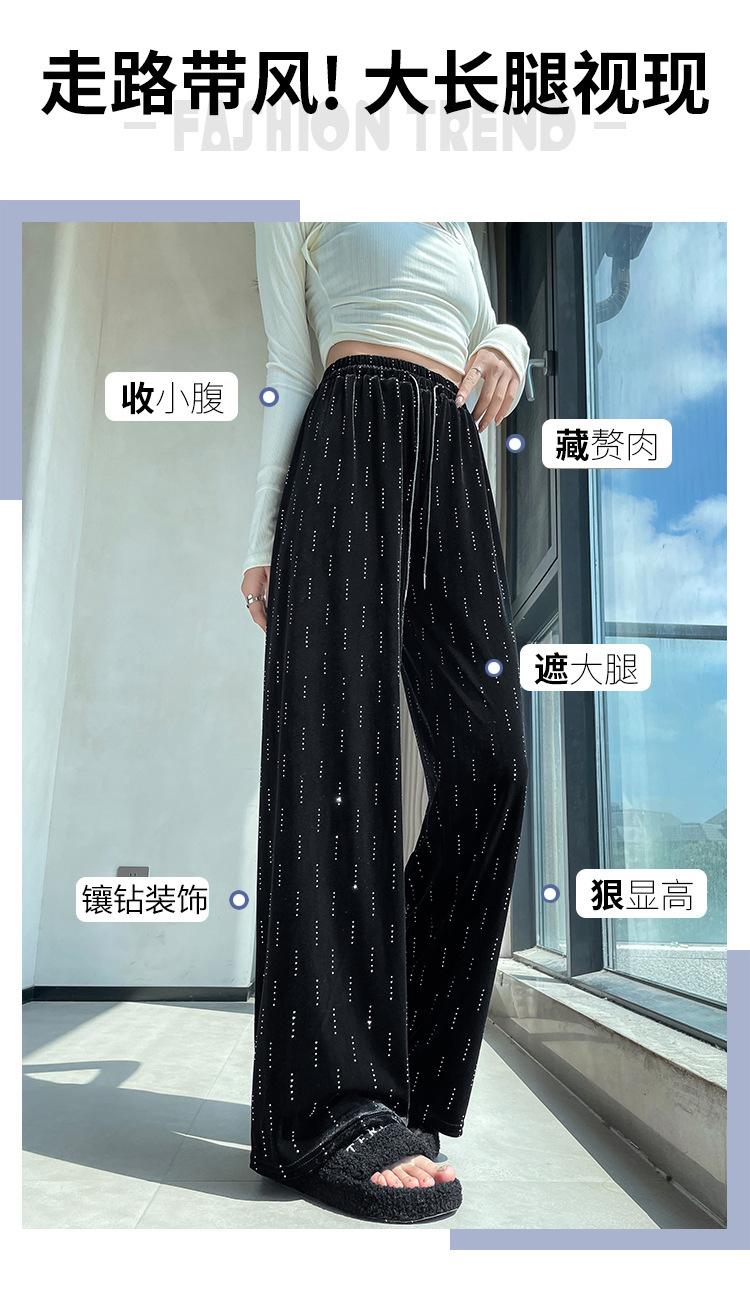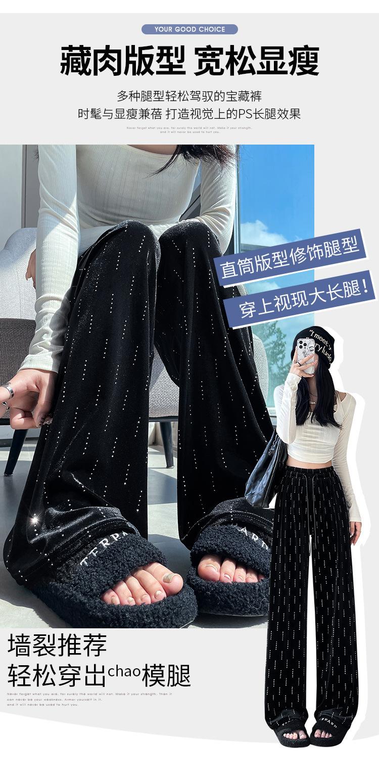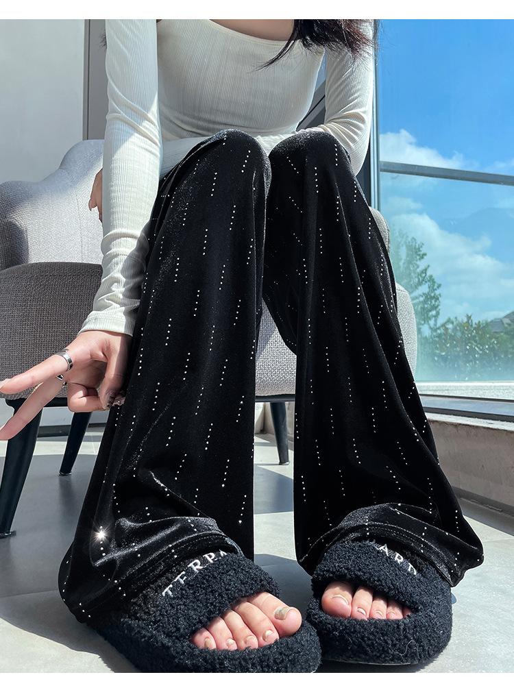 Pantalones Casuales de Terciopelo Negro con Pedrería para Mujer, Otoño 2025, Pantalones Rectos Drapeados con Cordón, Pantalones Adelgazantes de Cintura Alta de Pierna Ancha