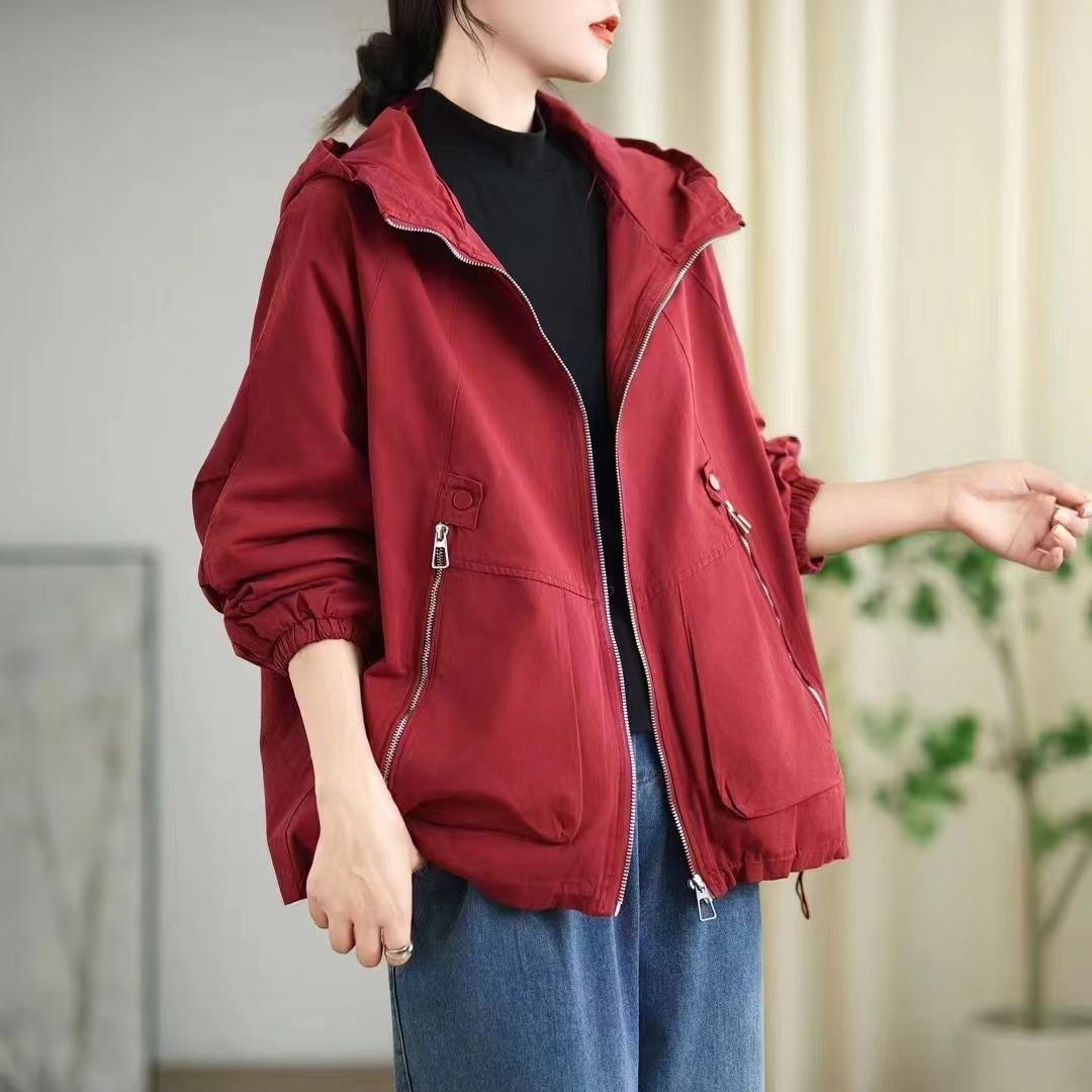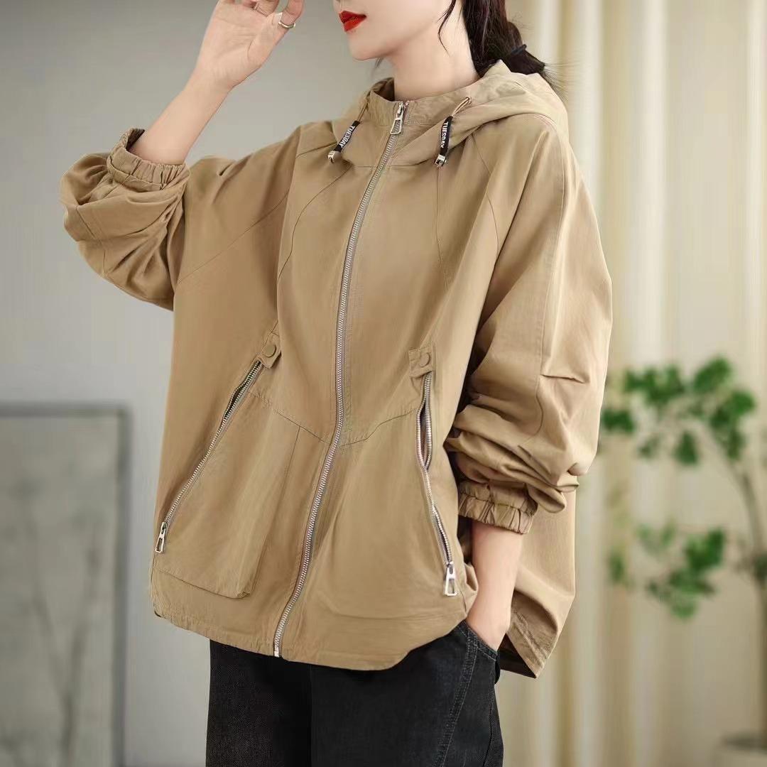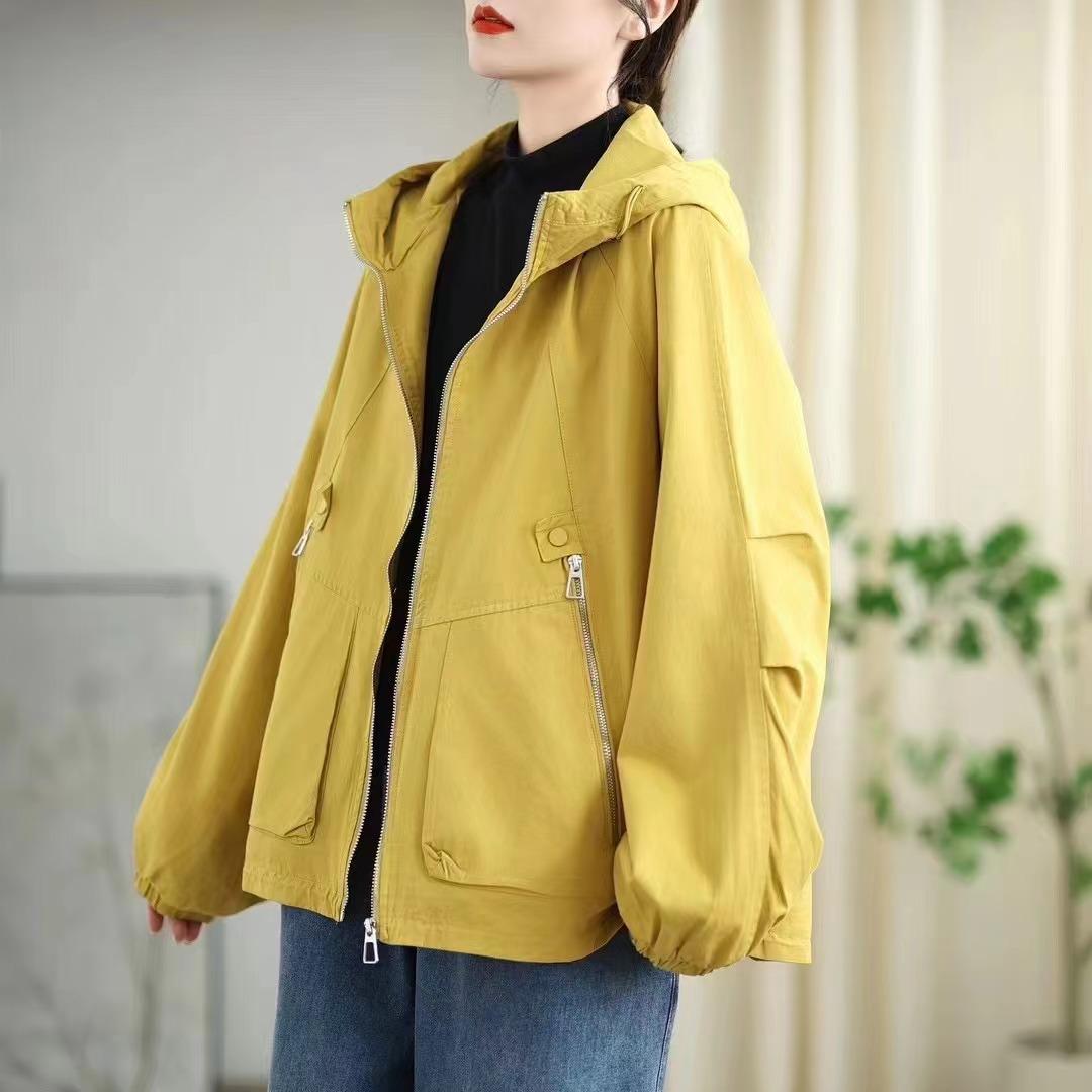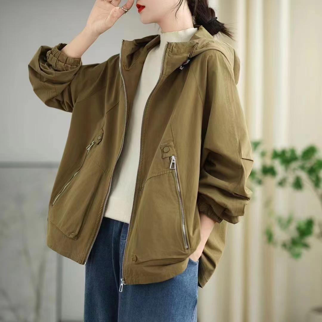 Abrigo con capucha y cremallera corta para mujer, cortavientos, otoño 2024, nuevo, de algodón, color sólido, chaqueta holgada a la moda