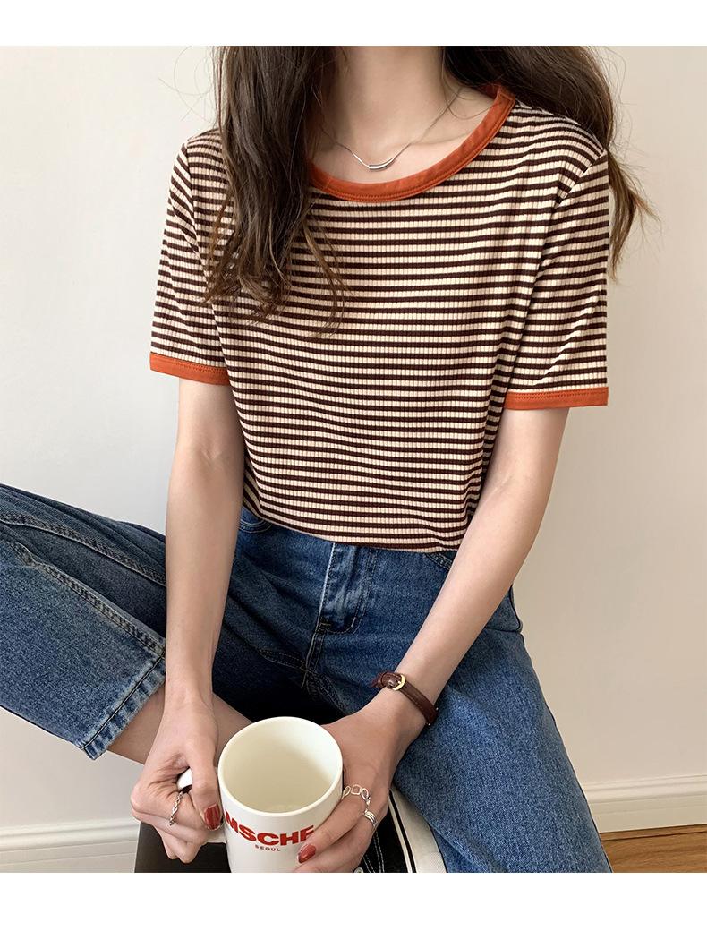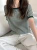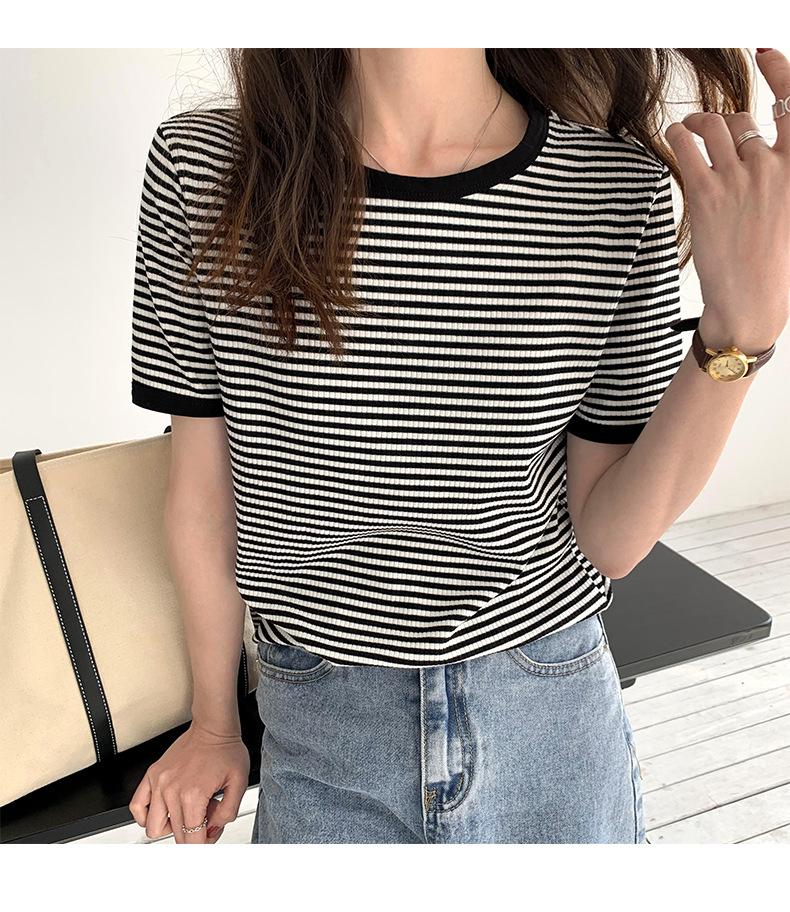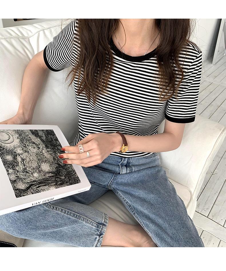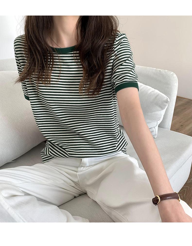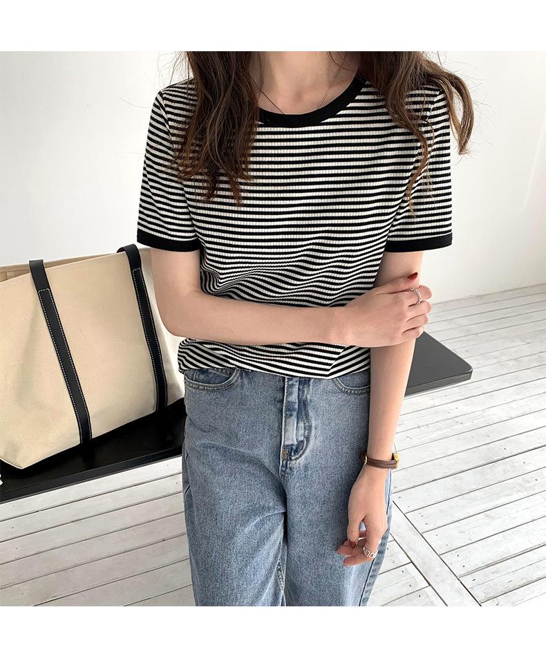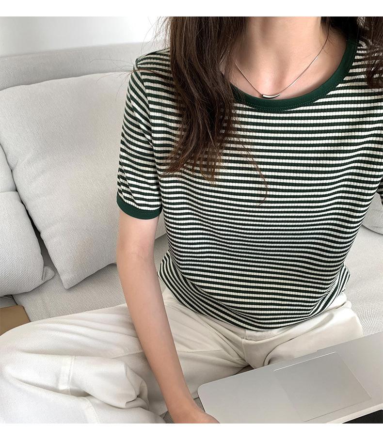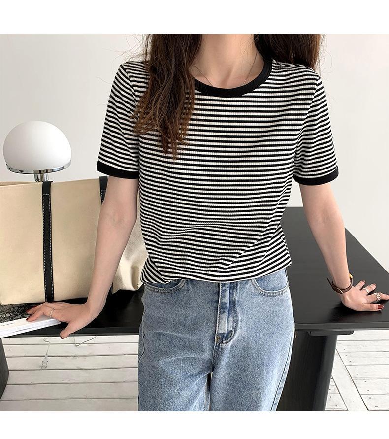Camiseta básica de manga corta a rayas con cuello redondo para mujer, verano 2025, nuevo estilo coreano, diseño de nicho, top informal interior