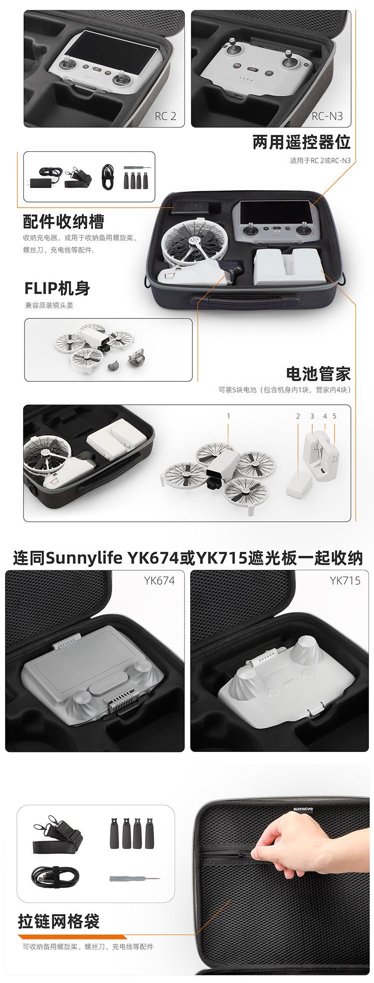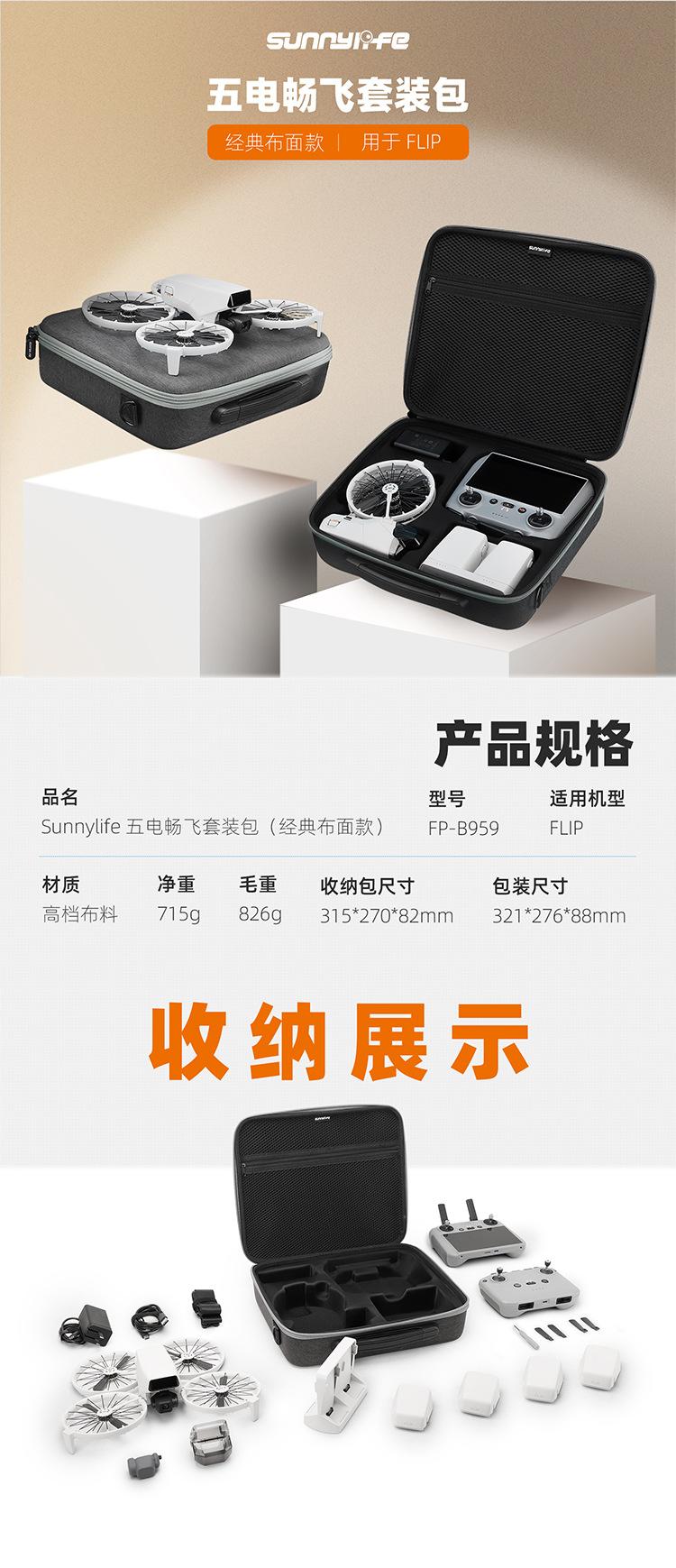 Puede guardar el cuerpo del FLIP, el control remoto RC-N3 o el control remoto RC 2, el administrador de baterías, 5 baterías (incluida 1 en el cuerpo y 4 en el administrador), el cargador, hélices de repuesto, destornillador, cable de carga y otros accesorios.