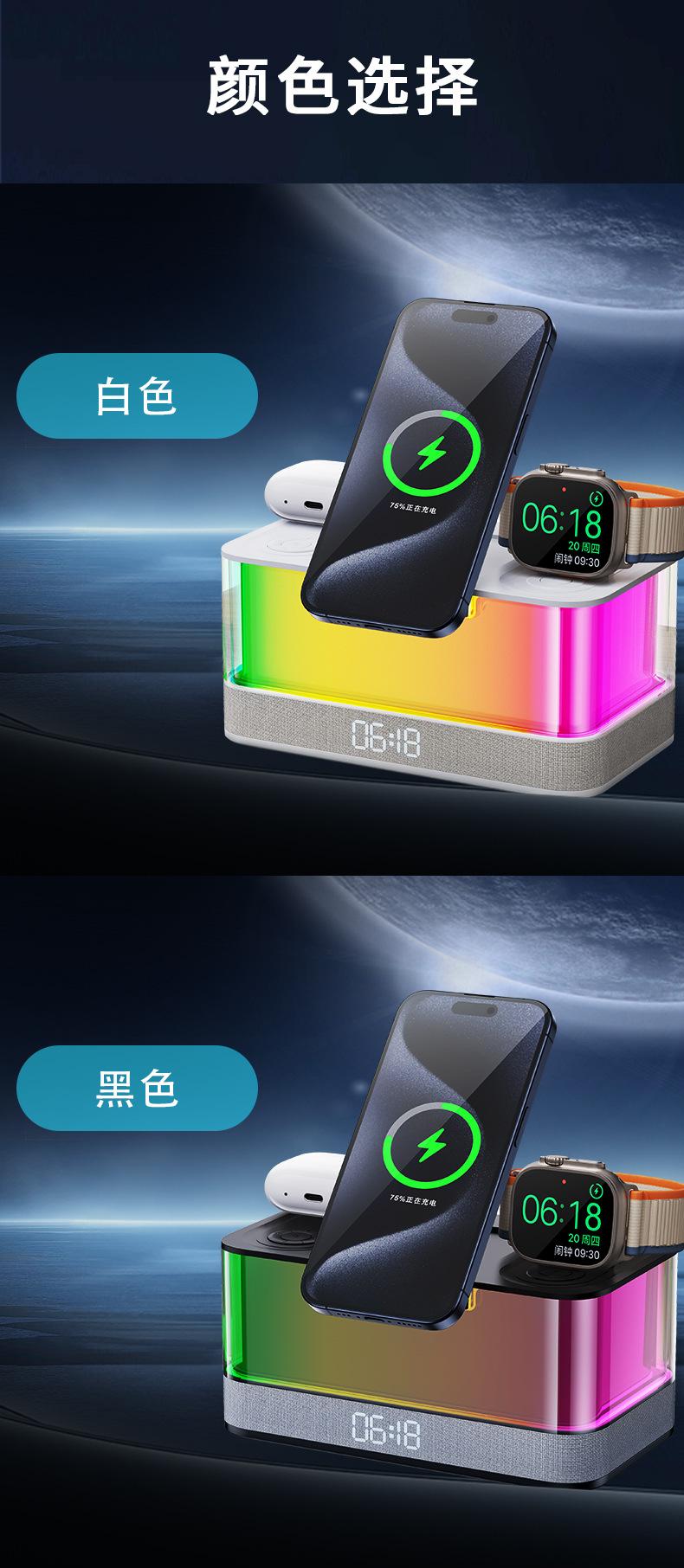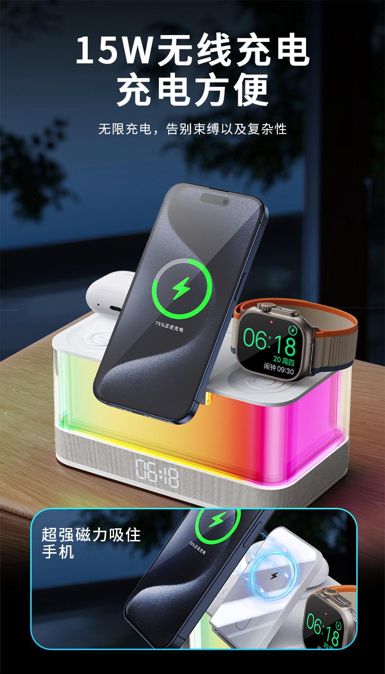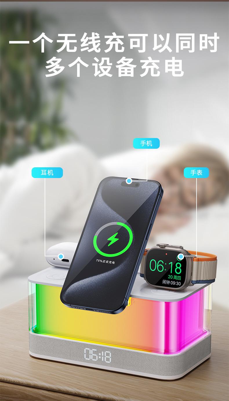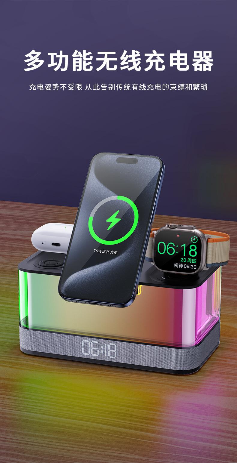 Cargador inalámbrico seis en uno transfronterizo luz nocturna colorida audio carga rápida de teléfono móvil audífonos reloj carga inalámbrica venta al por mayor