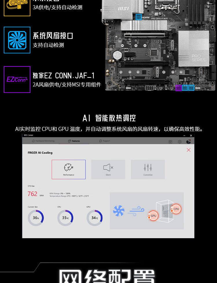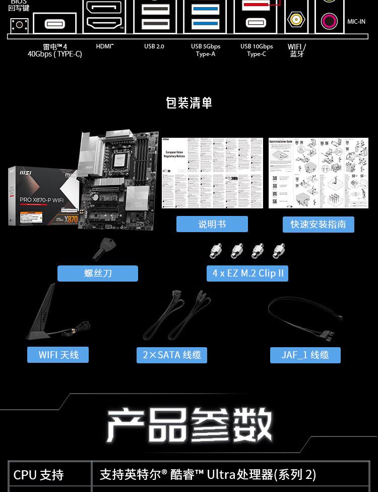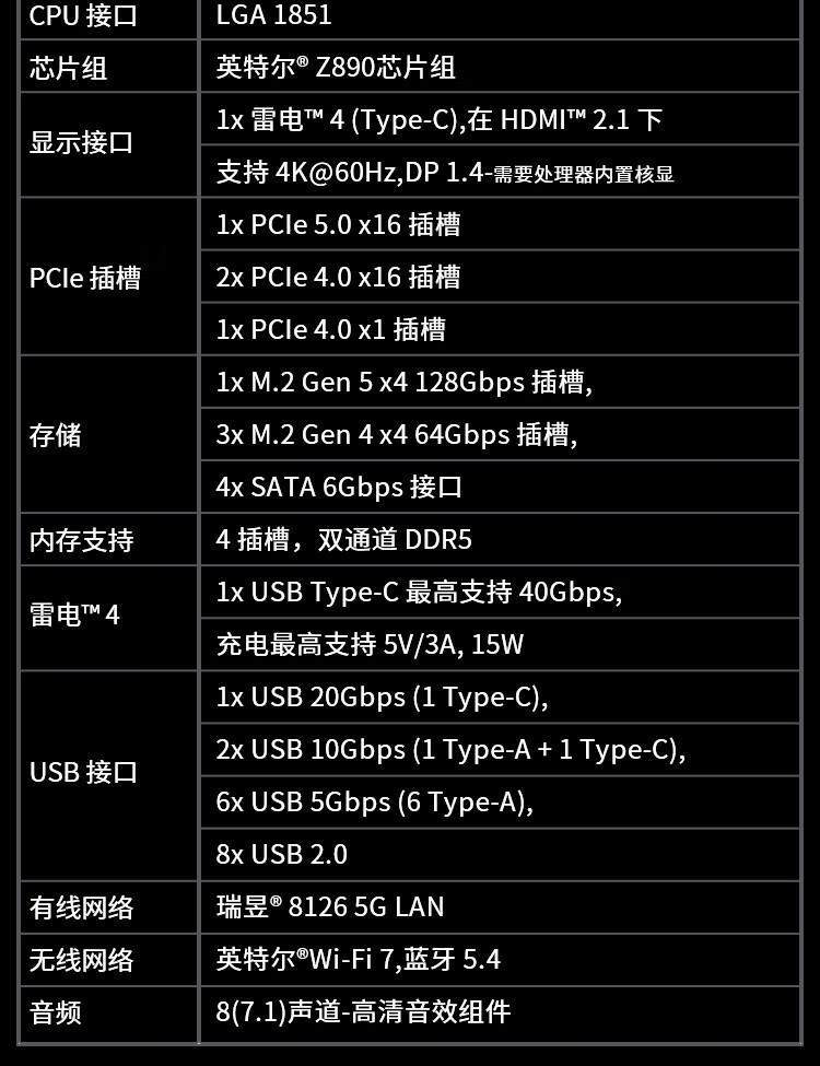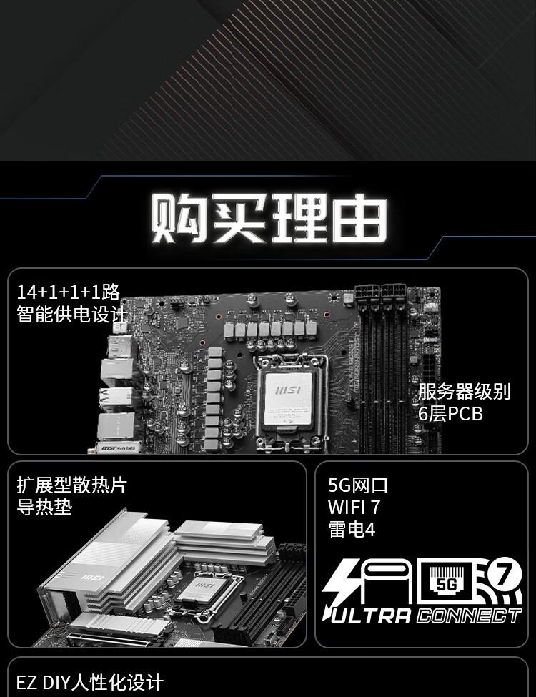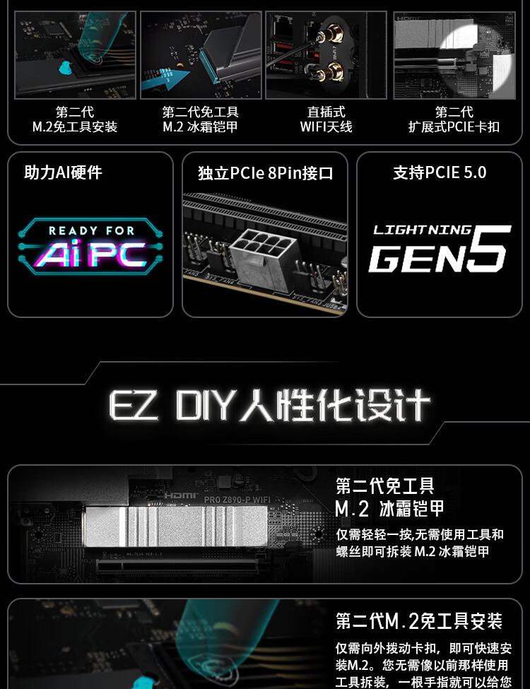 - Características del chipset: Equipado con el chipset Intel Z890, posicionado en el segmento principal de gama media, soporta PCIe 5.0 (ranura para tarjeta gráfica), memoria DDR5/DDR4 (dependiendo del factor de forma específico, el PRO Z890-P WIFI generalmente soporta DDR5), overclocking de CPU (exclusivo para series K/KF) y Thunderbolt 4 (algunas versiones).