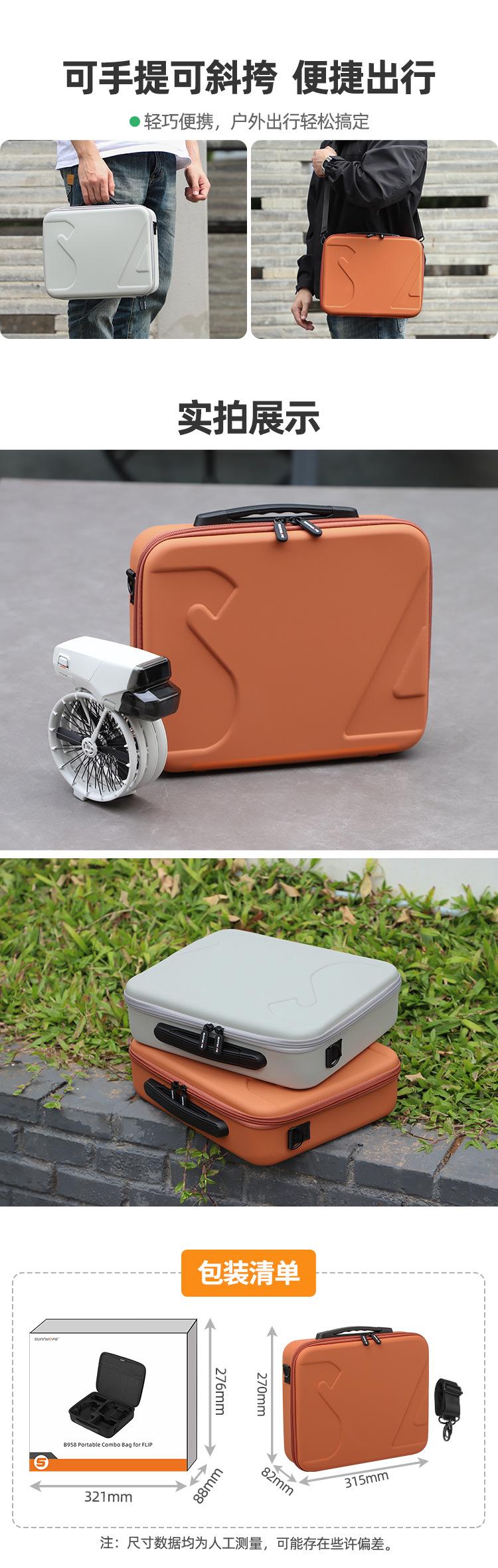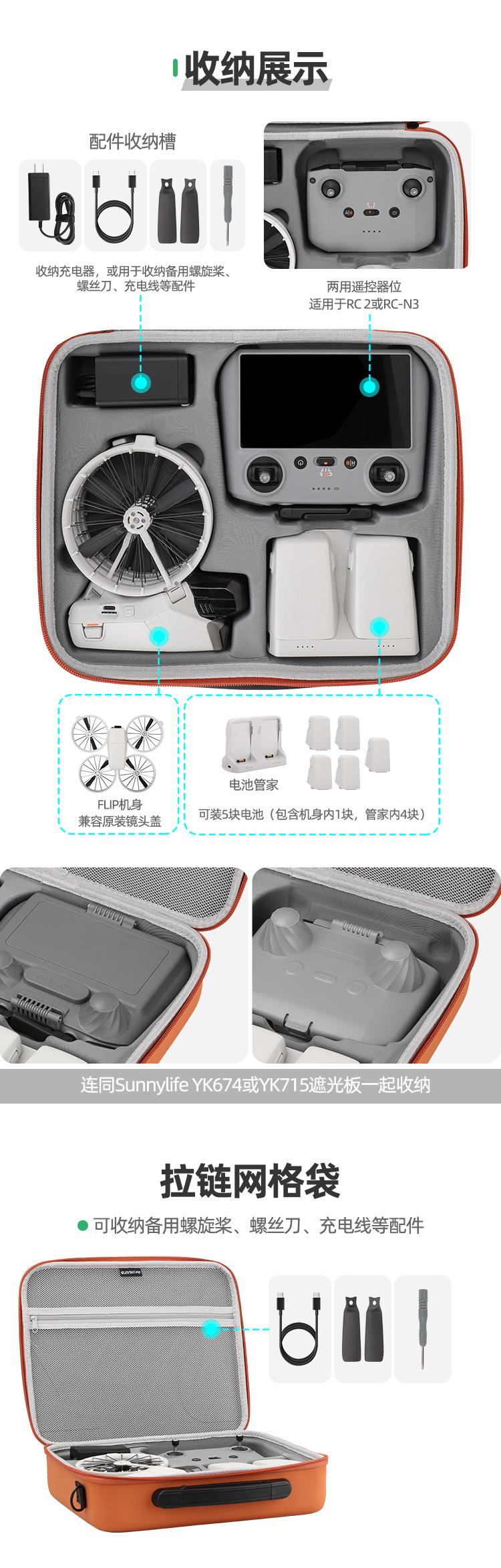 Puede guardar el cuerpo del FLIP, el control remoto RC-N3 o el control remoto RC 2, el administrador de baterías, 5 baterías (incluida 1 en el cuerpo y 4 en el administrador), el cargador, hélices de repuesto, destornillador, cable de carga y otros accesorios.