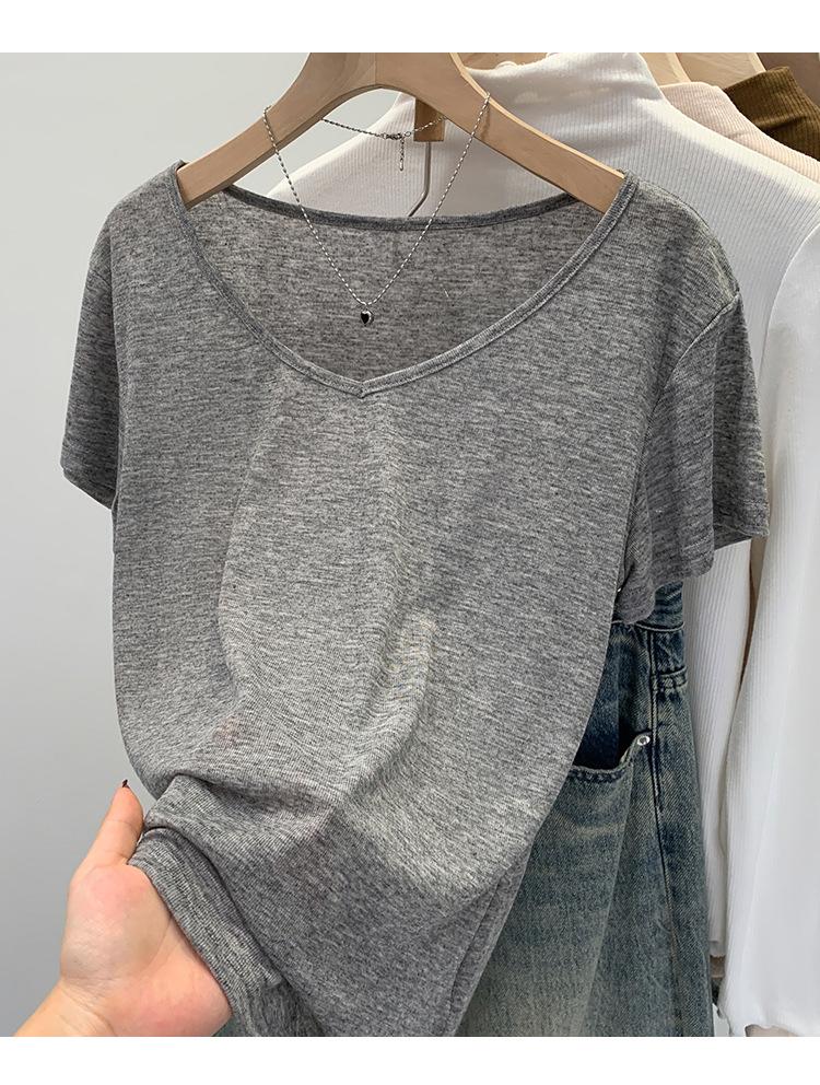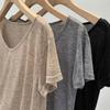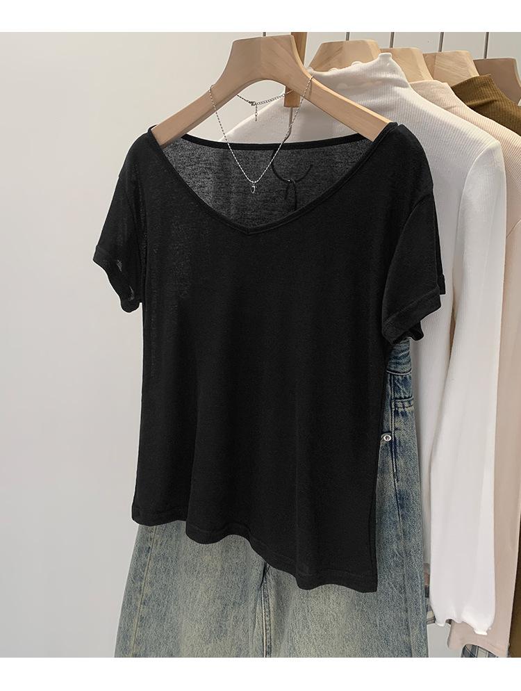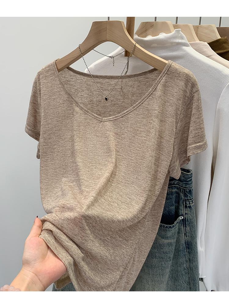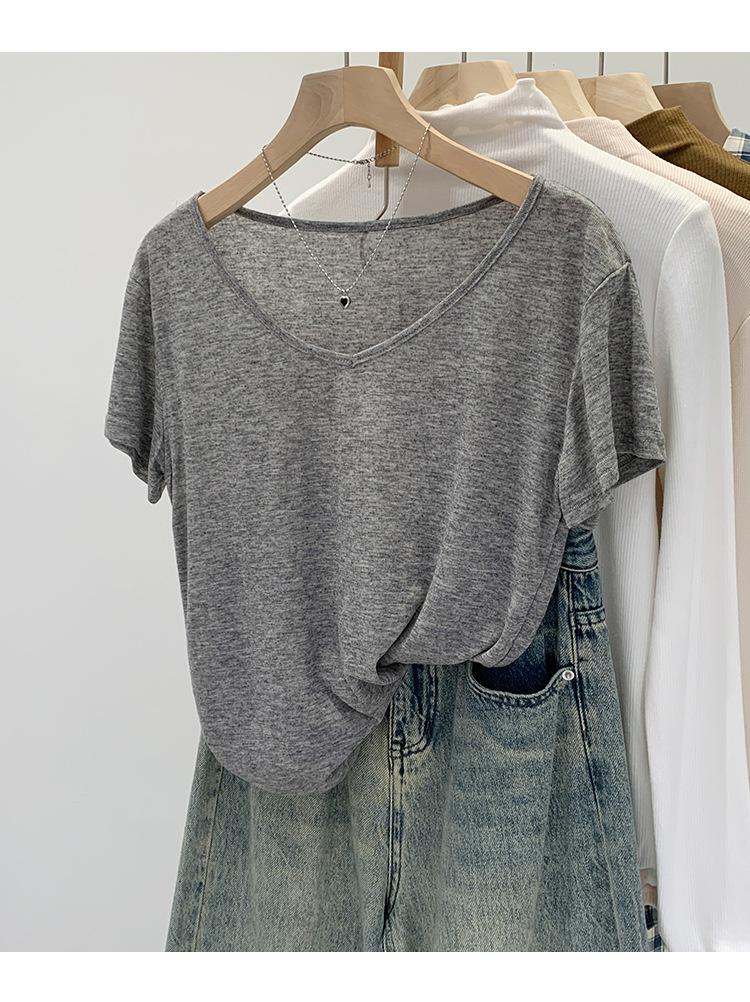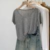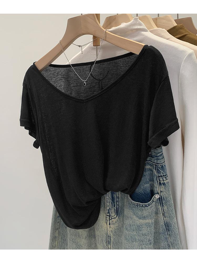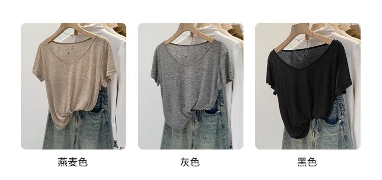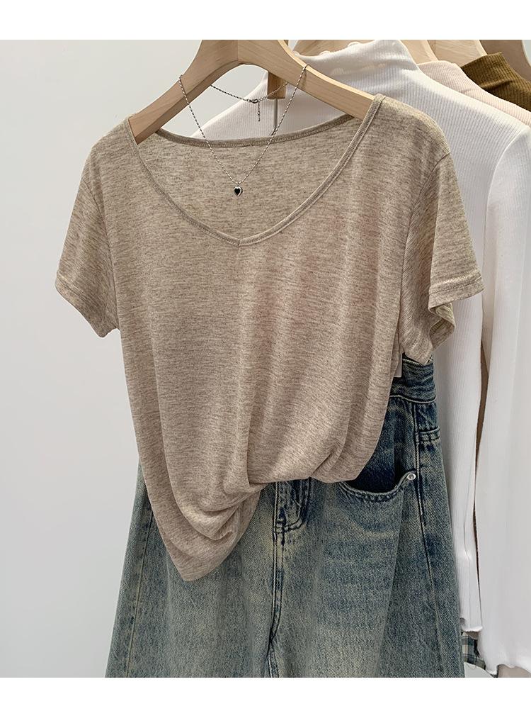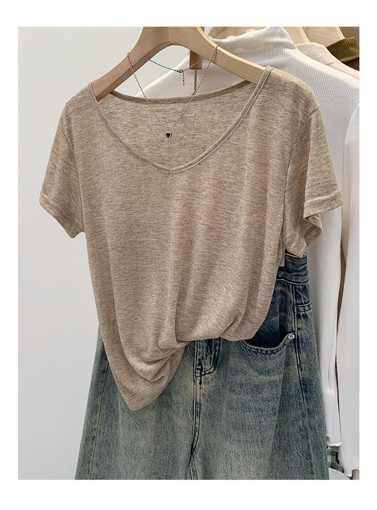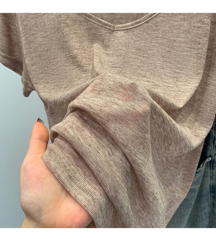Camiseta holgada de manga corta con cuello en V y diseño adelgazante para mujer, estilo coreano, estilo Pure Desire, para verano de 2025.