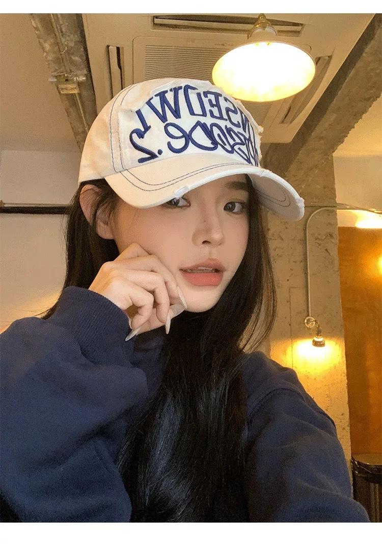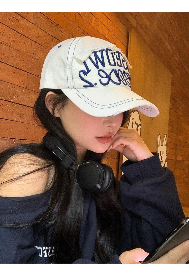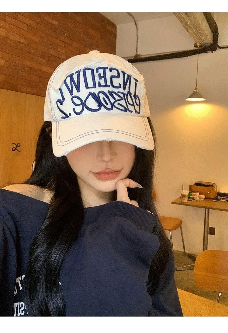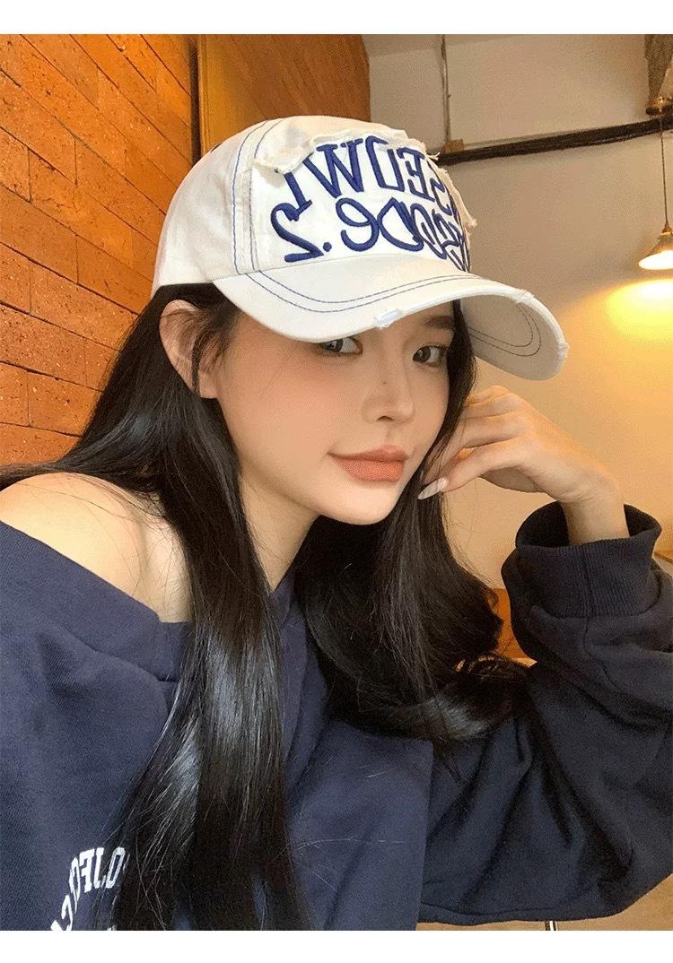 Gorra de béisbol bordada con letras negras para mujer, de ala ancha, con cara grande, estilo vintage americano, estilo gorra pequeña