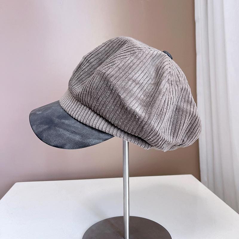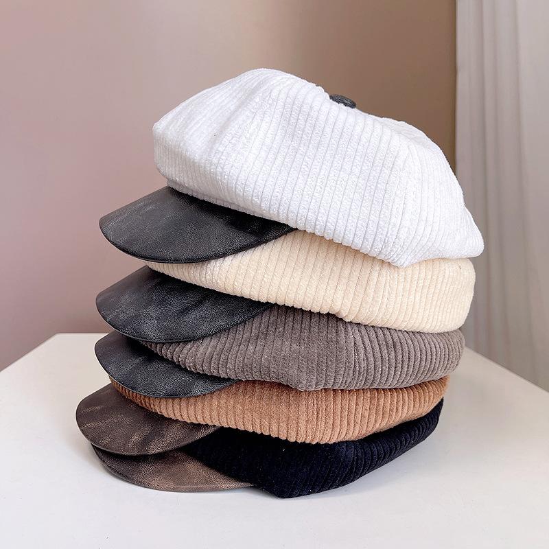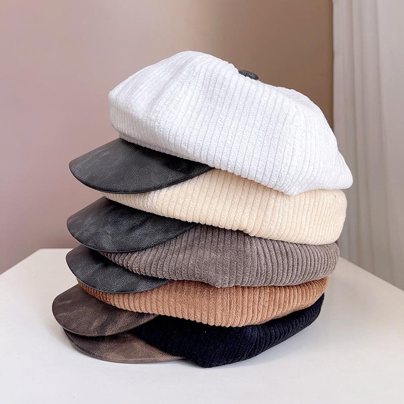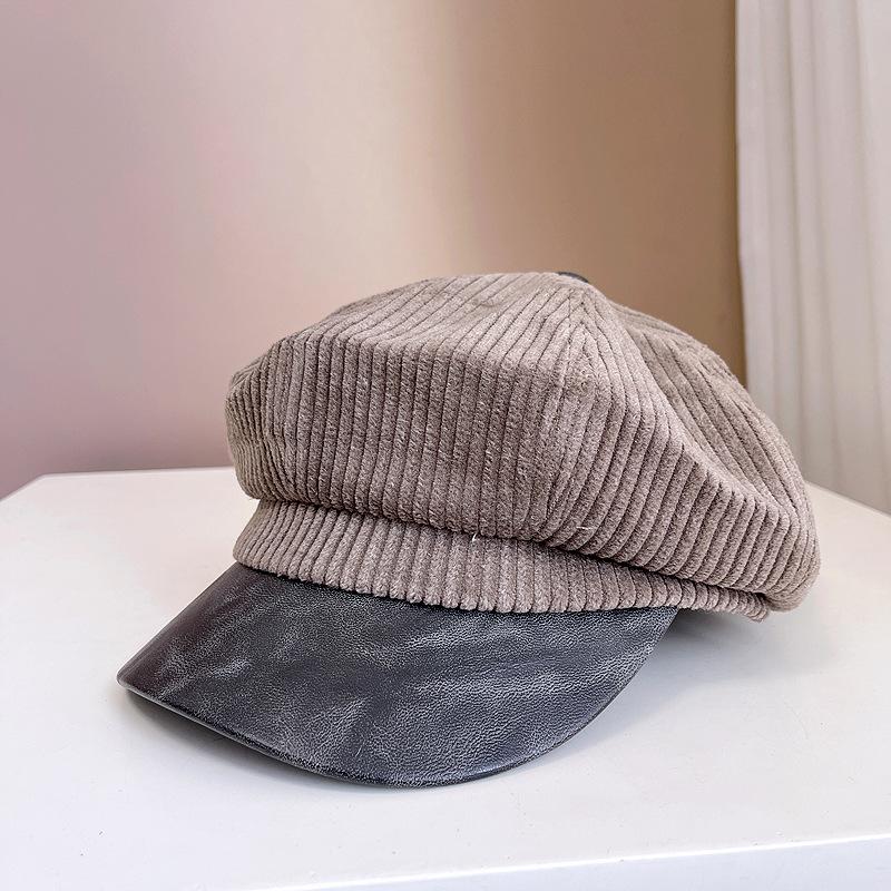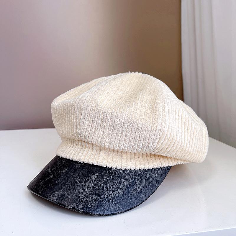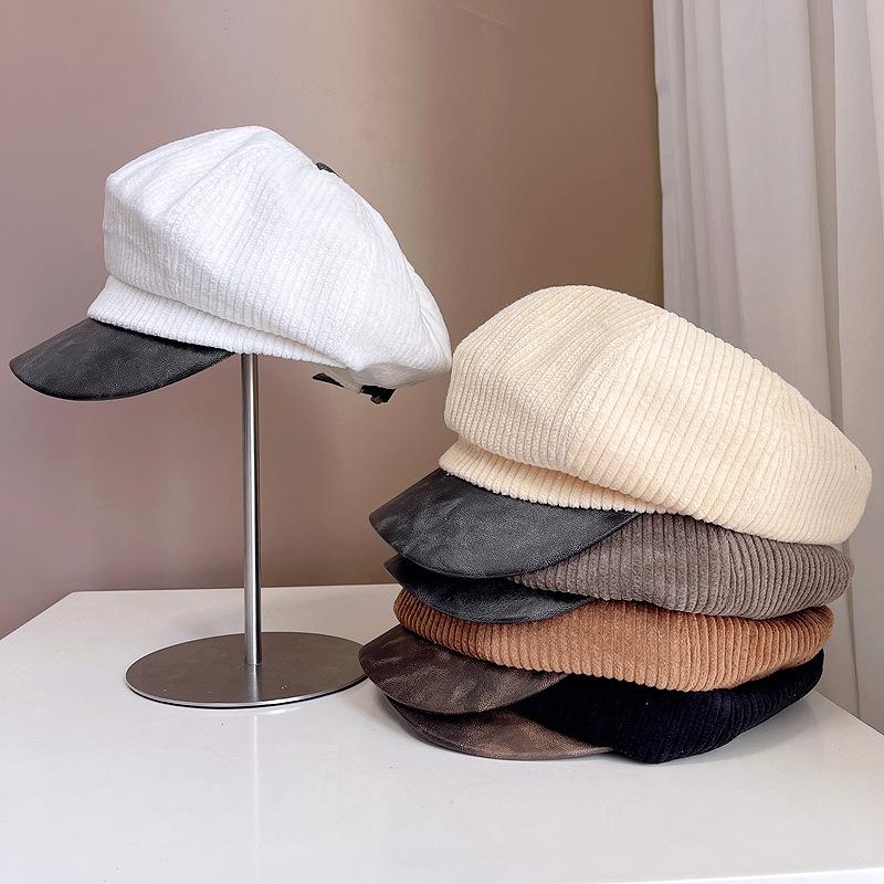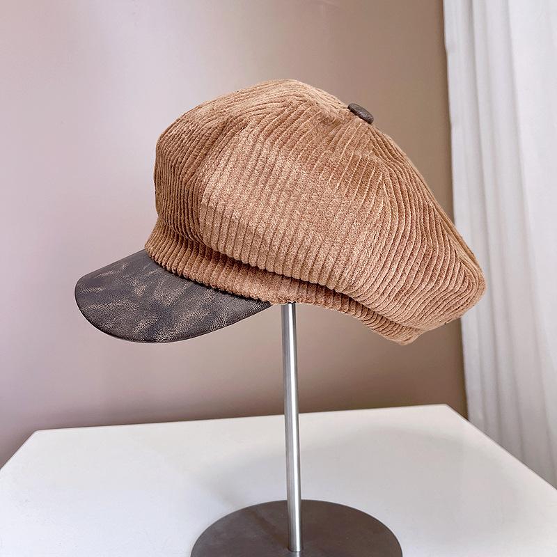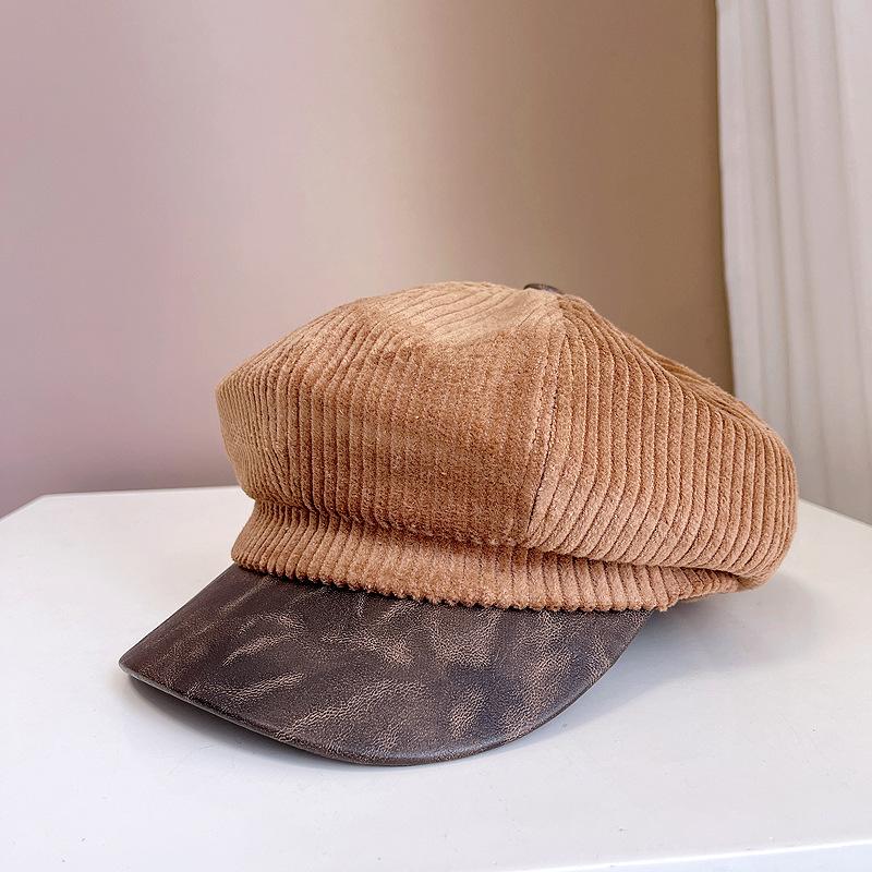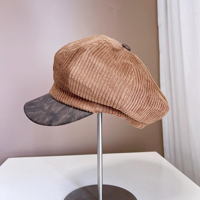 Gorra octogonal japonesa retro de pana con costuras de cuero para mujer, otoño e invierno, artística, combinable, pequeña, para exhibir en el rostro, gorra de vendedor de periódicos