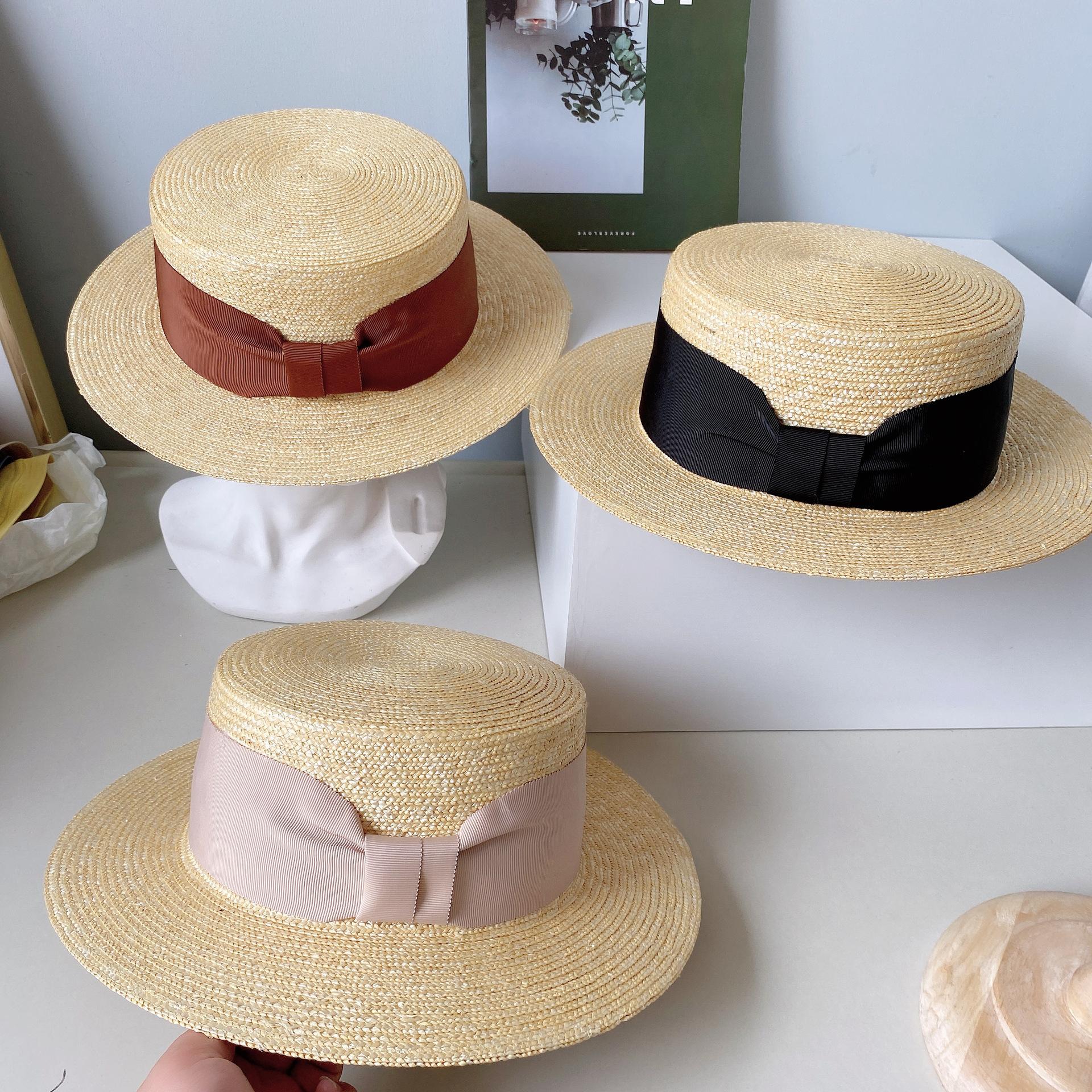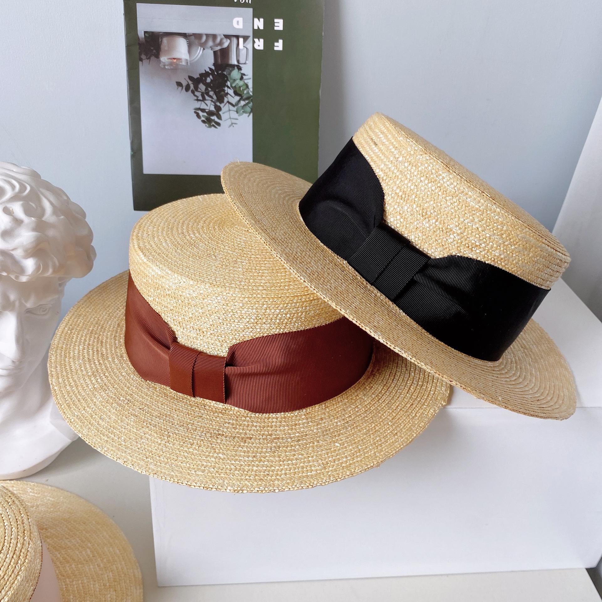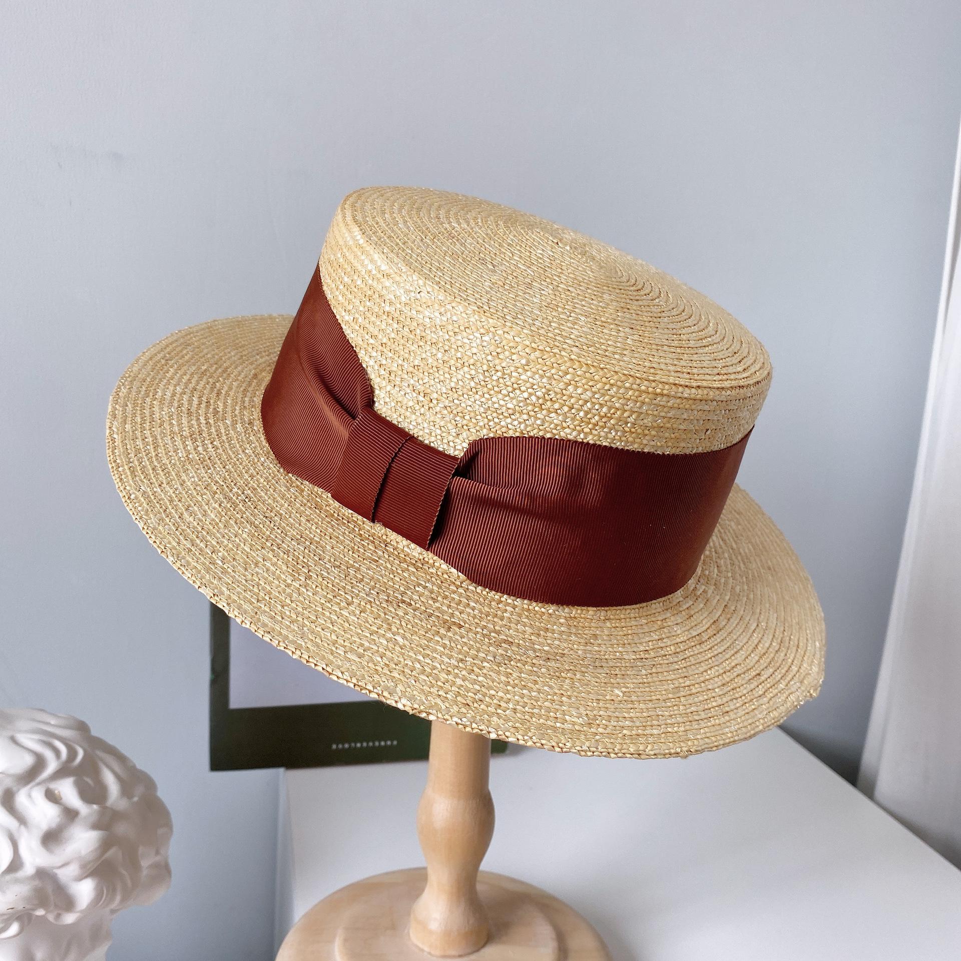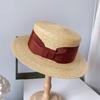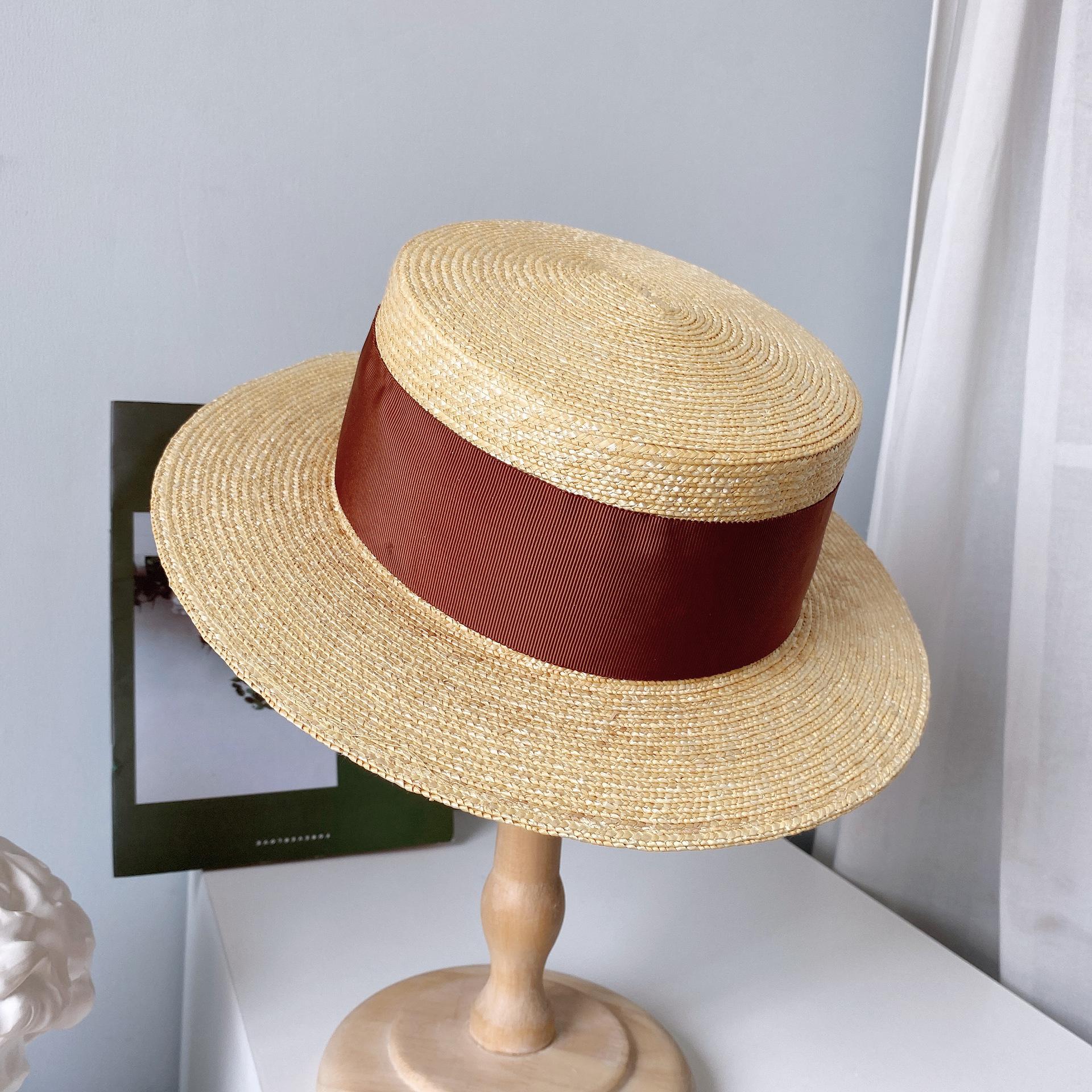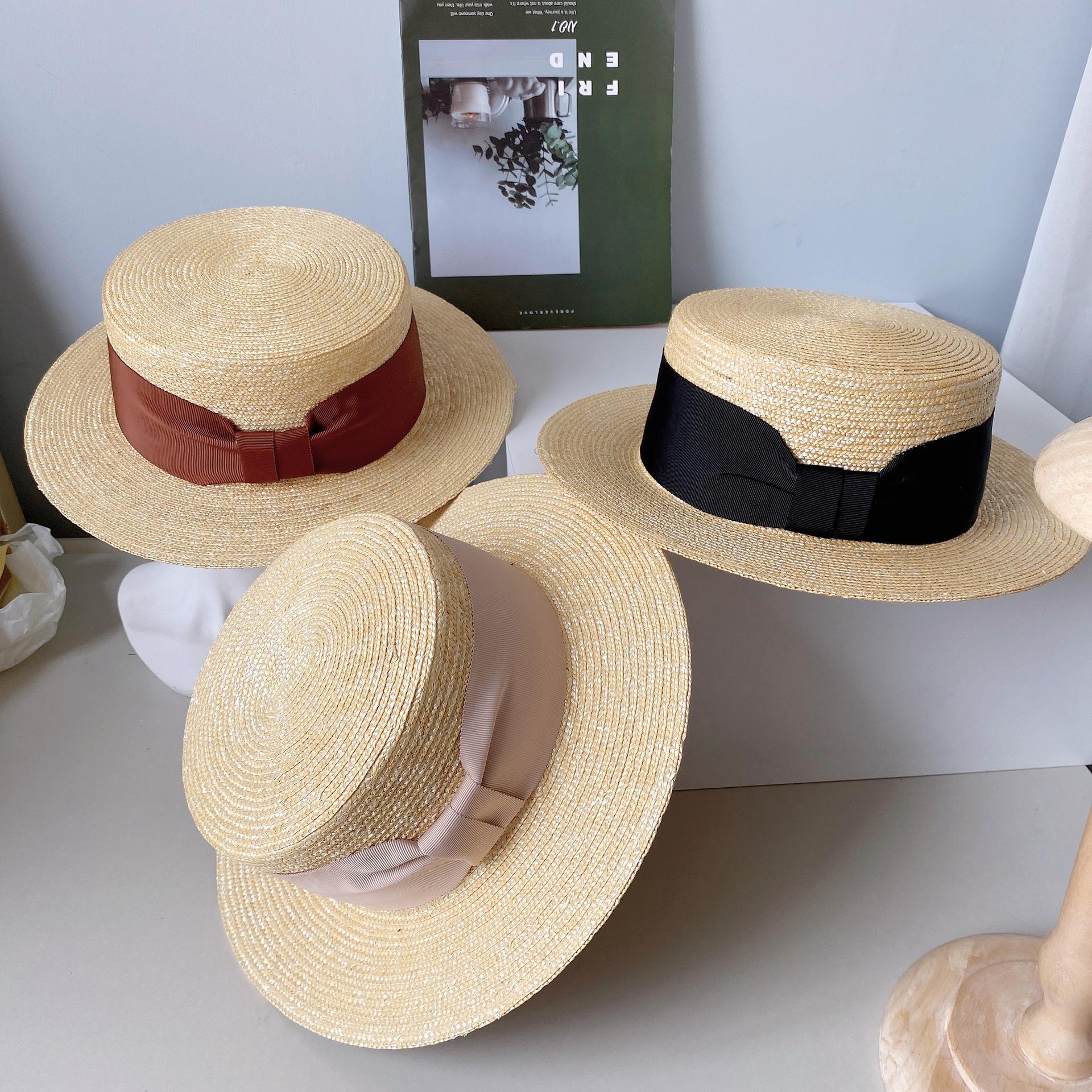 Sombrero plano de paja alta retro europeo y americano para mujer, sombrero de paja de verano para la playa con protección solar, sombrero de copa simple con cinta, sombrero de moda