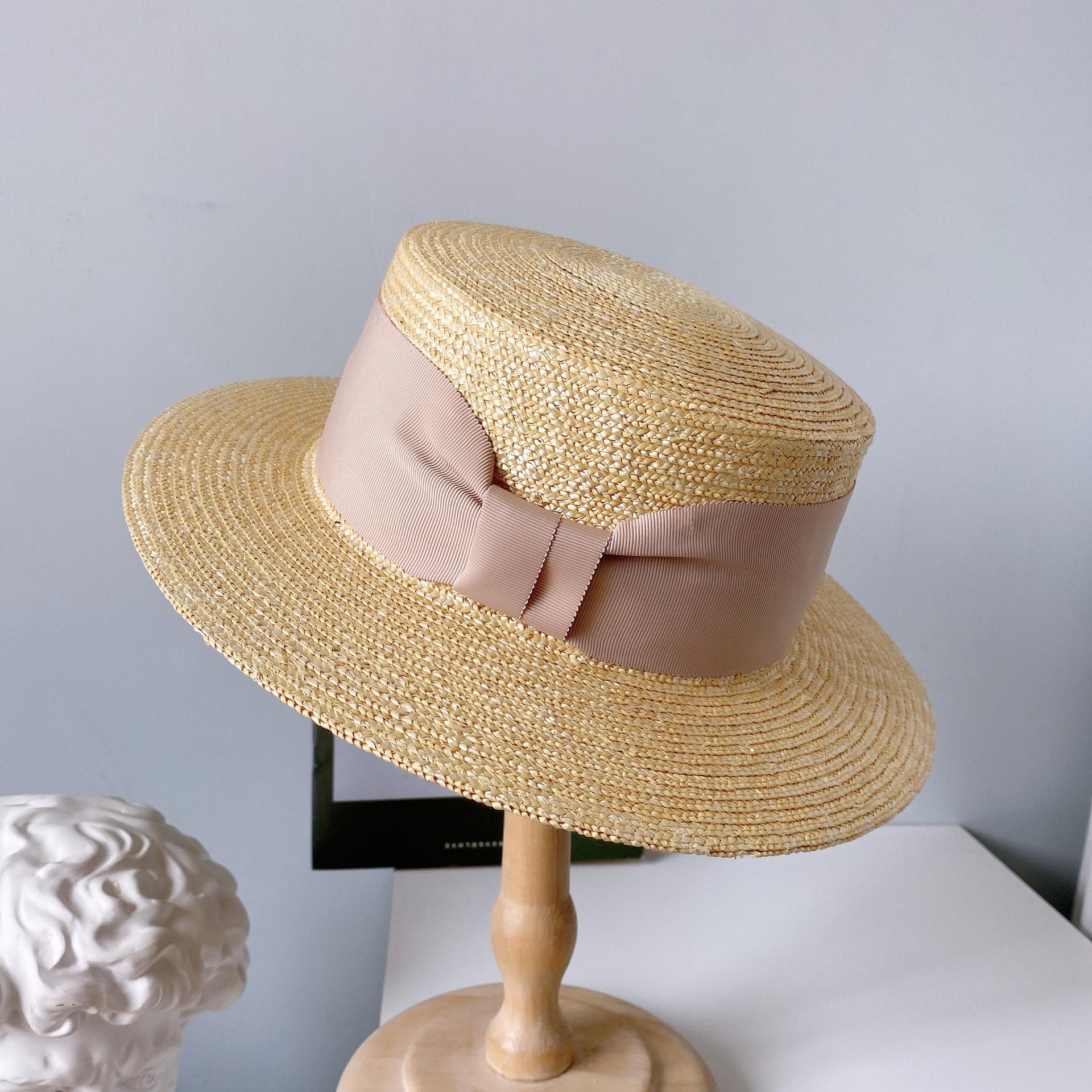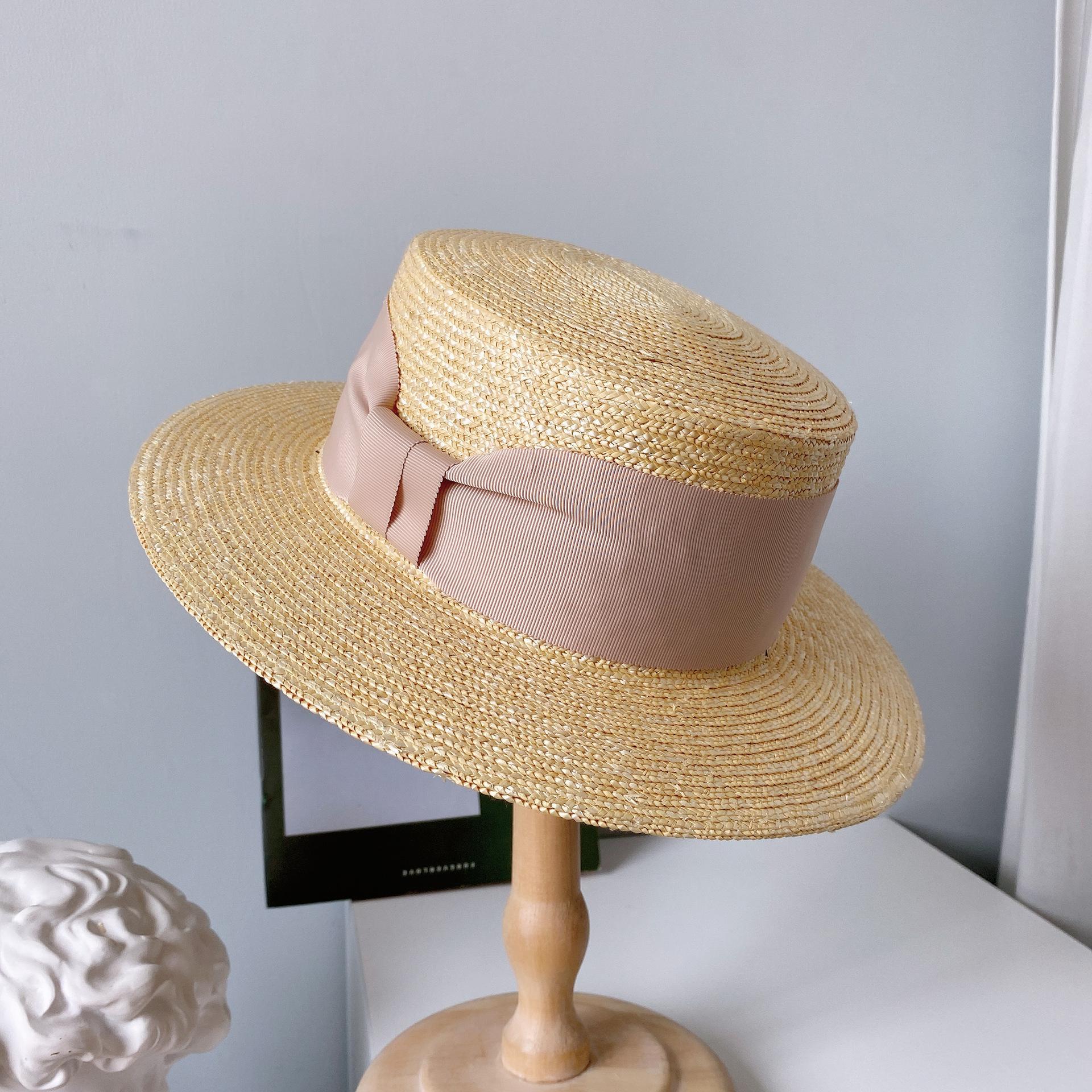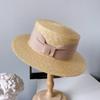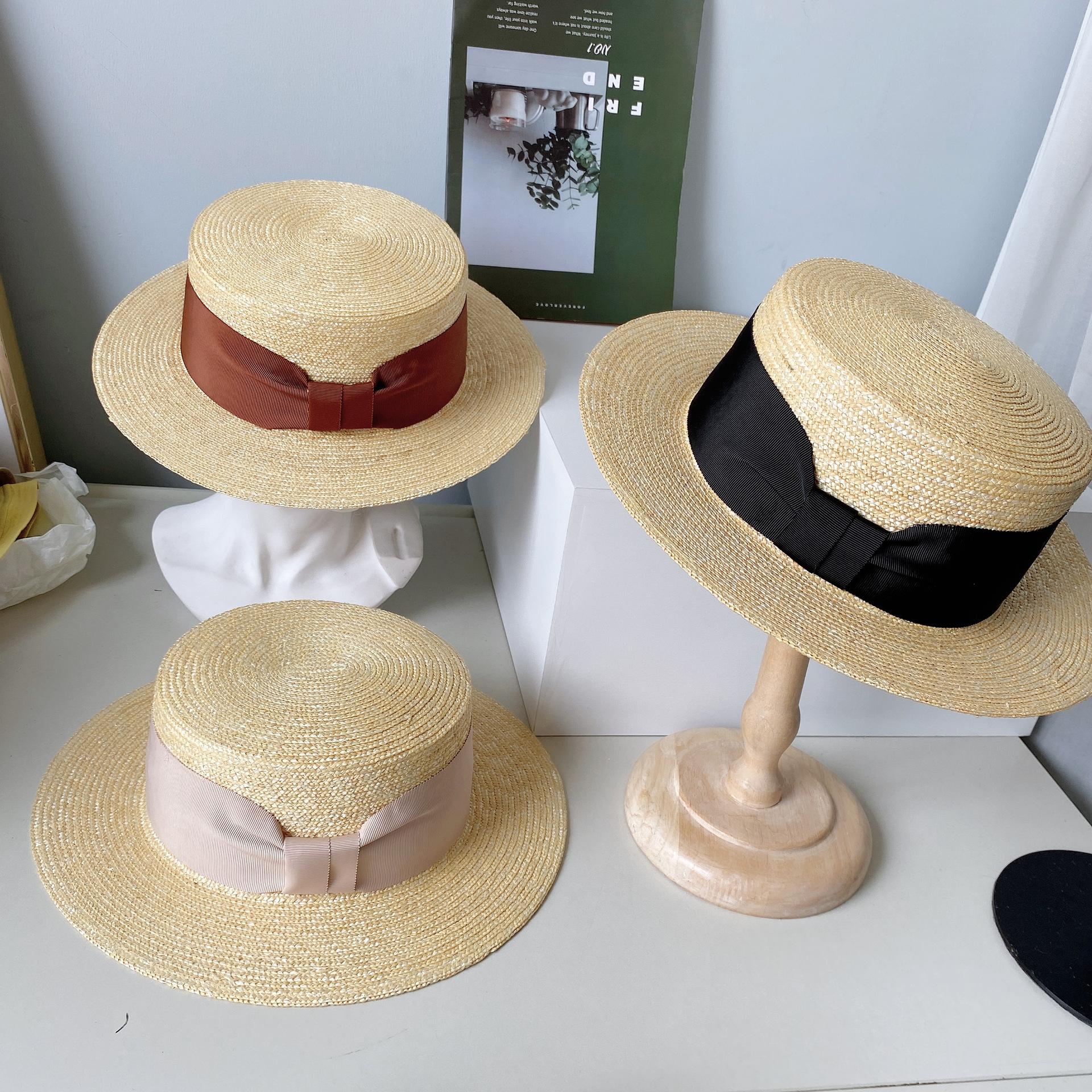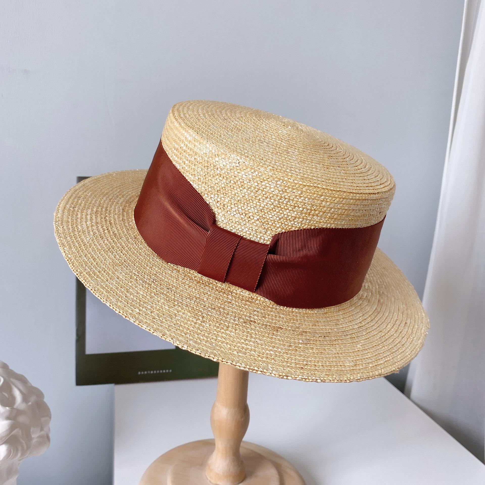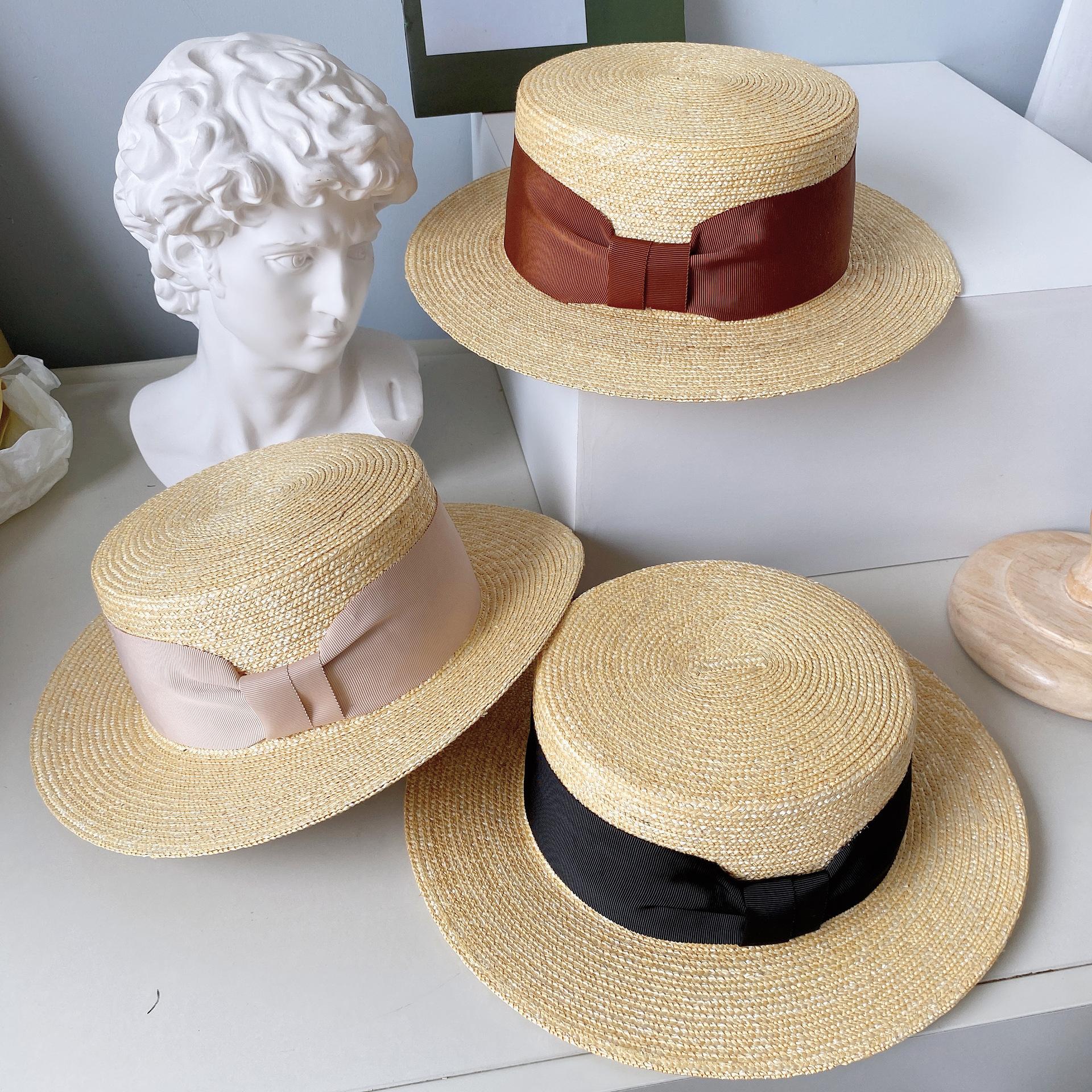Sombrero plano de paja alta retro europeo y americano para mujer, sombrero de paja de verano para la playa con protección solar, sombrero de copa simple con cinta, sombrero de moda