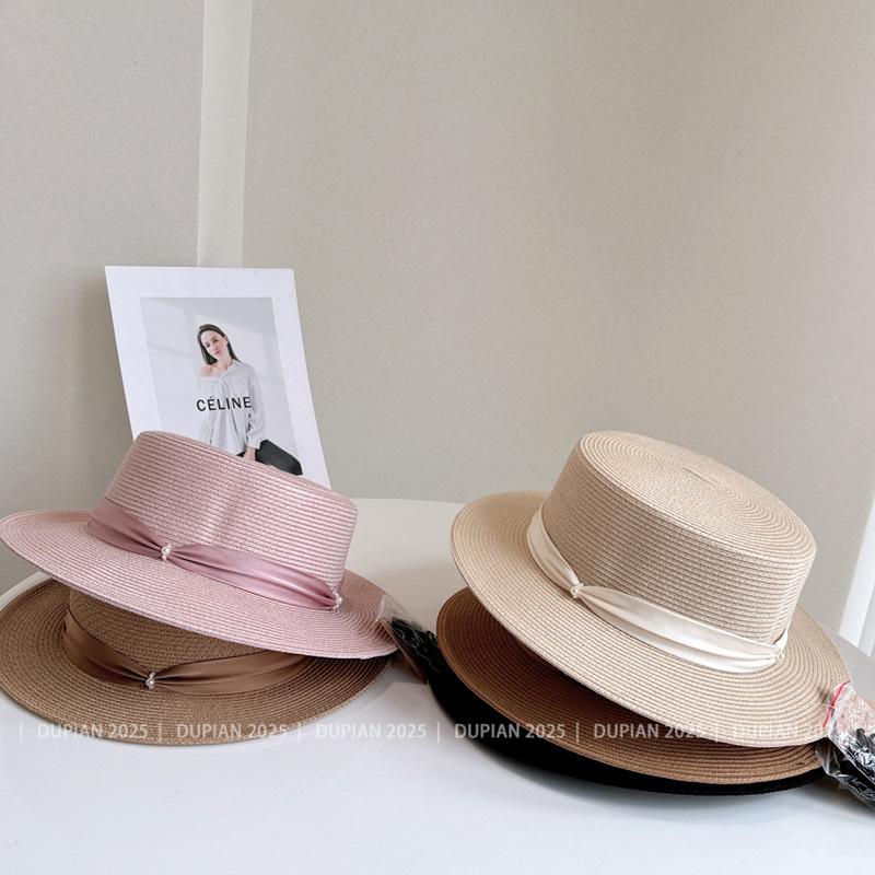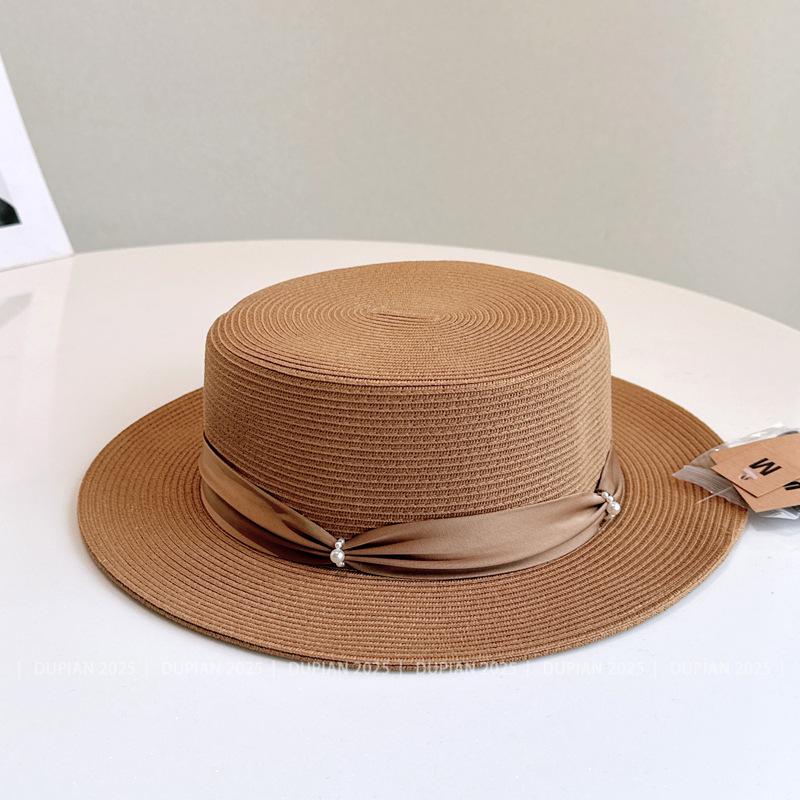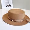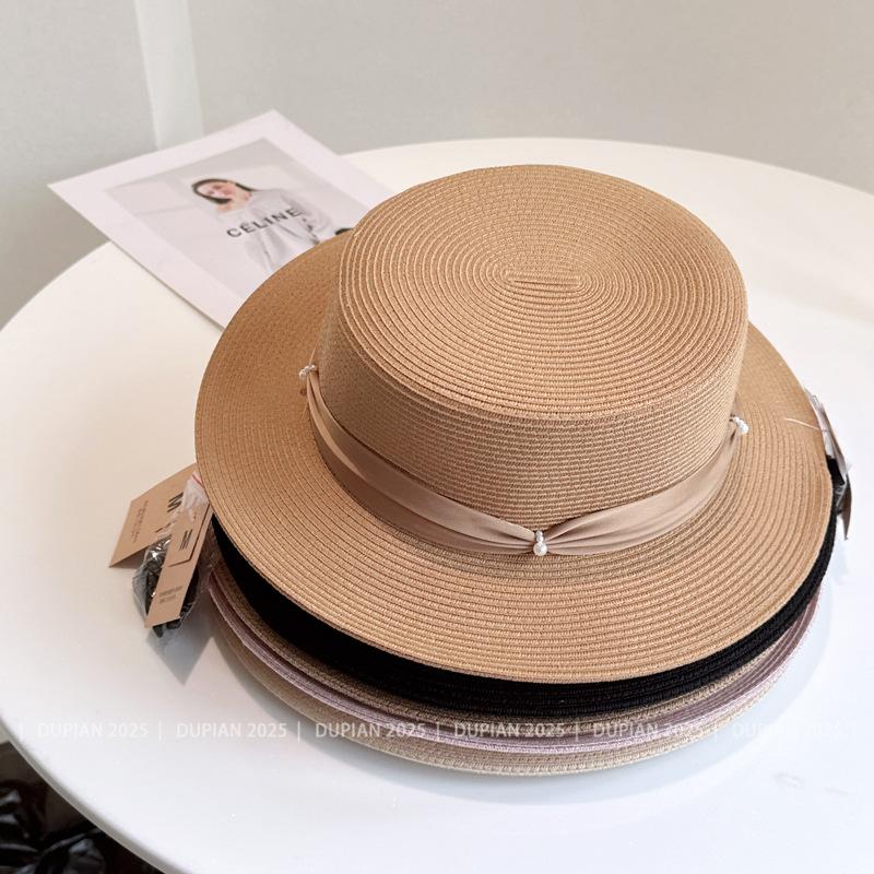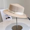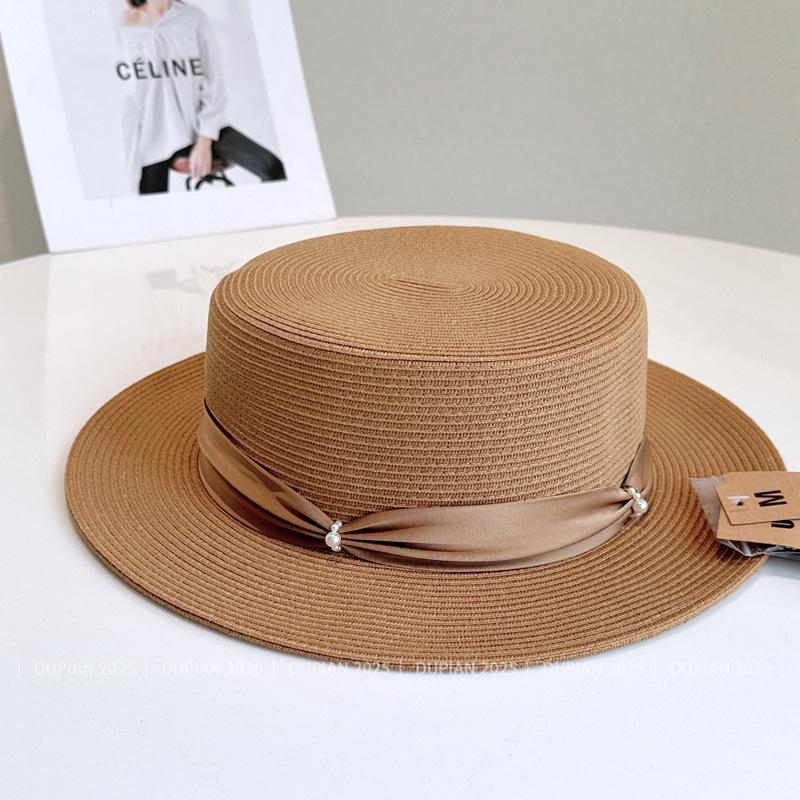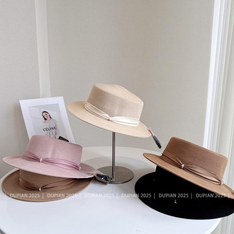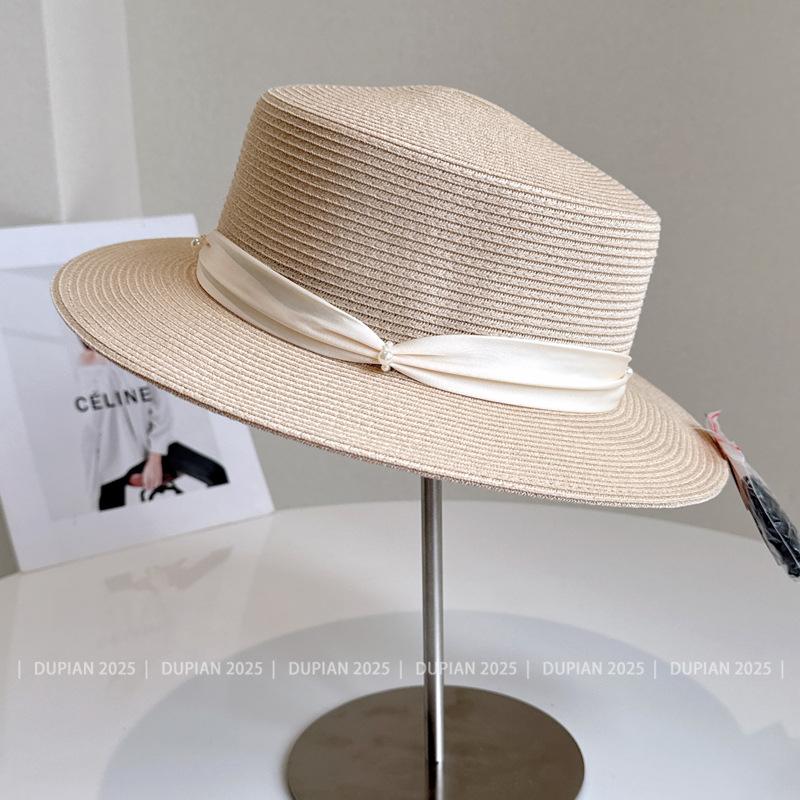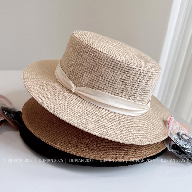 Sombrero de copa plana de lino sintético con lazo de perla estilo hada para mujer, sombrero de verano para viaje, protector solar, sombrero de playa francés para la costa.