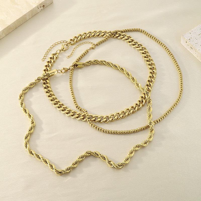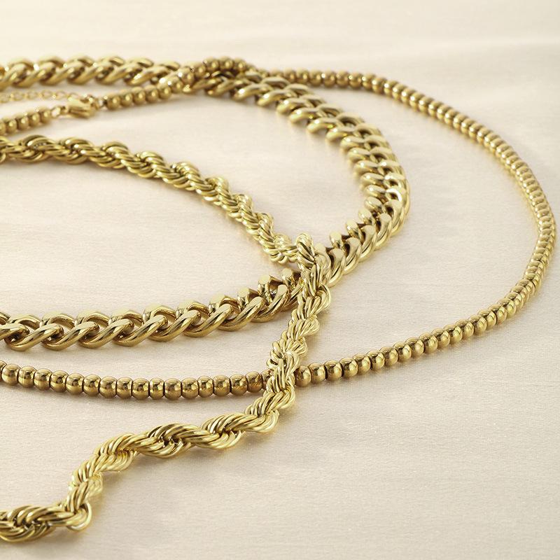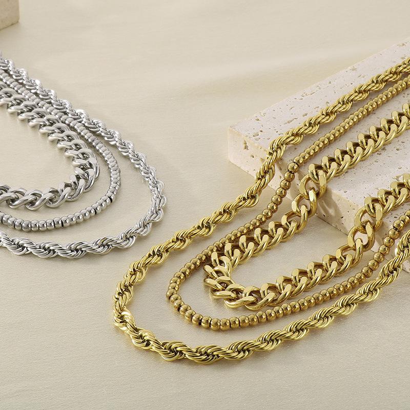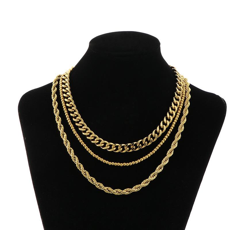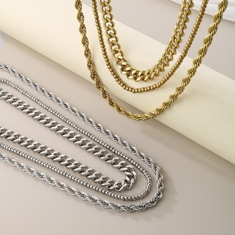 Collar de tres piezas, estilo europeo y americano, de acero inoxidable, cadena cubana, cadena torcida, cadena de cuentas, collar multicapa apilado para mujer