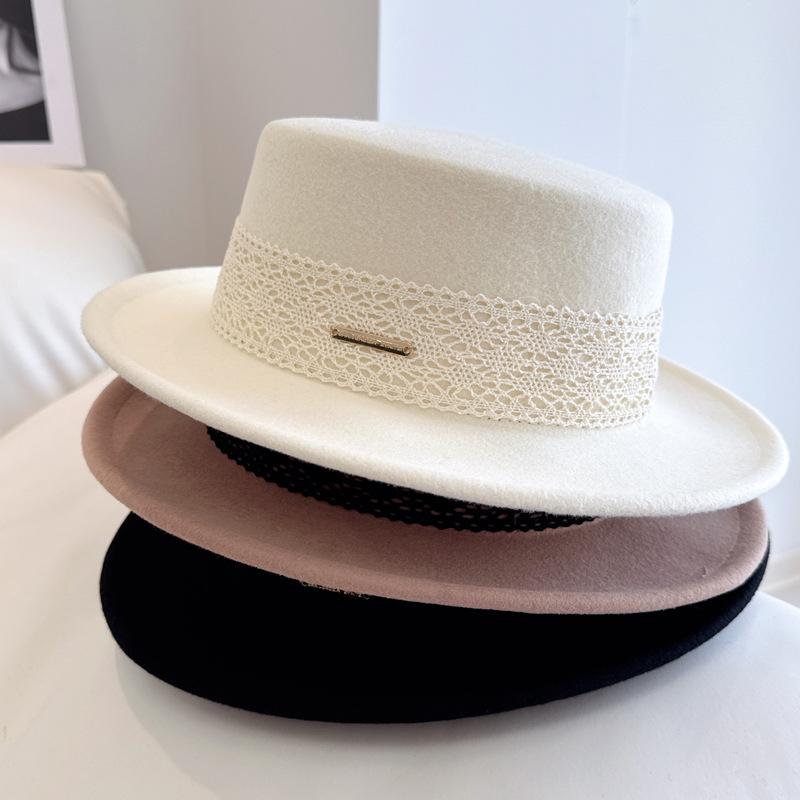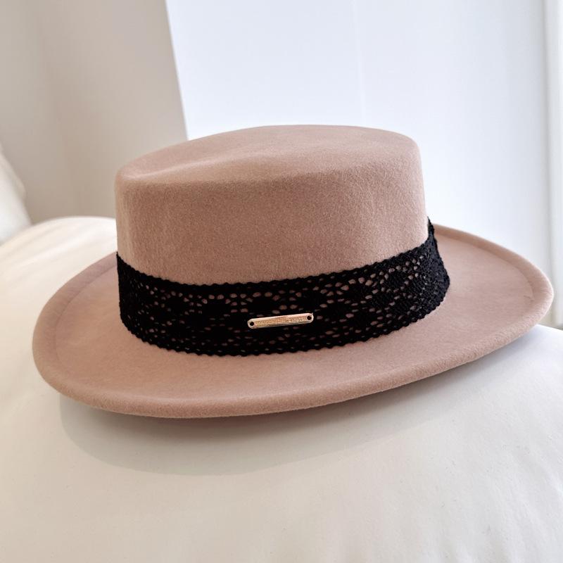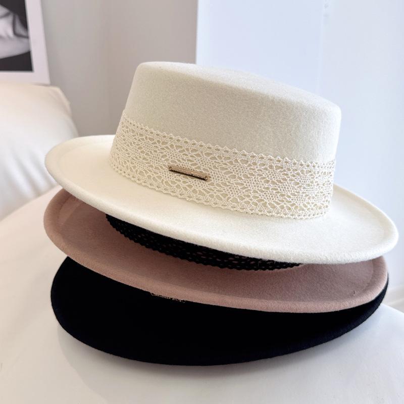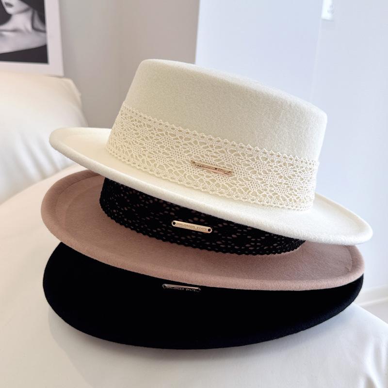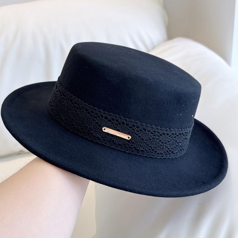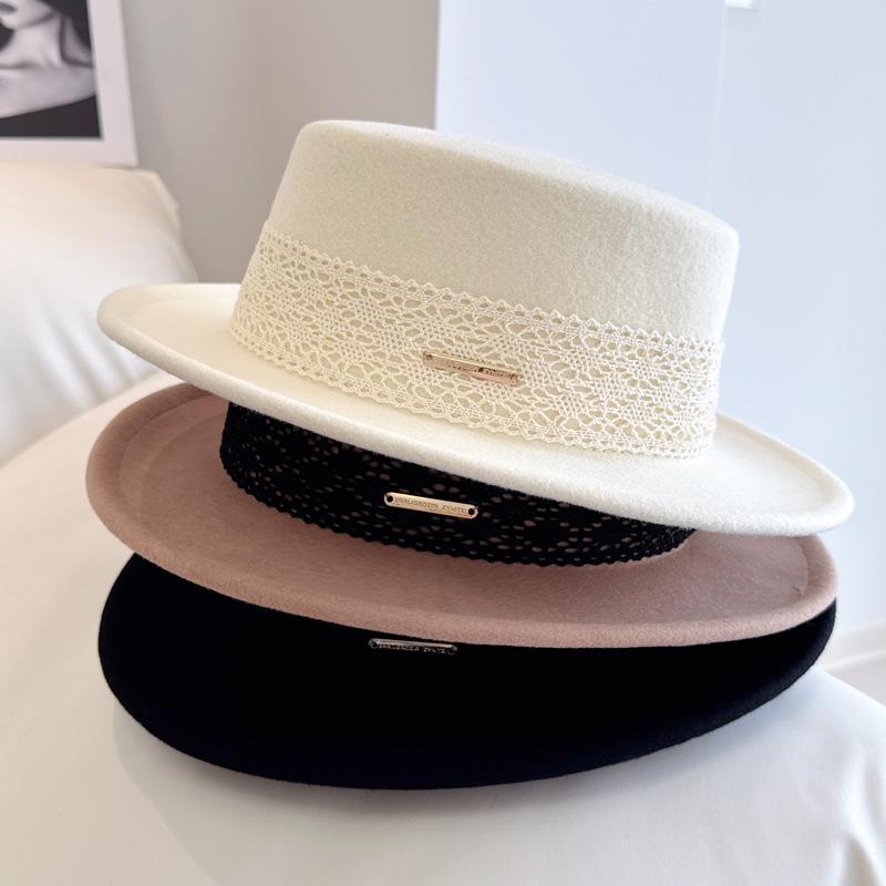 Sombrero plano con cinta de encaje estilo mil dorados para mujer, sombrero de fieltro de lana australiano para otoño e invierno, sombrero de fieltro con etiqueta larga de metal, sombrero de moda.