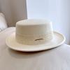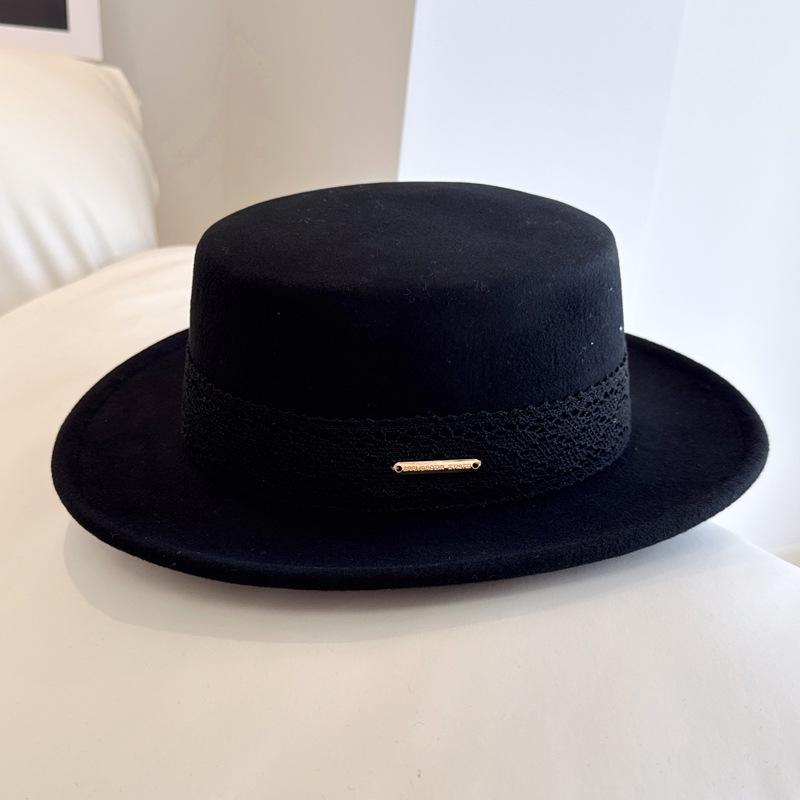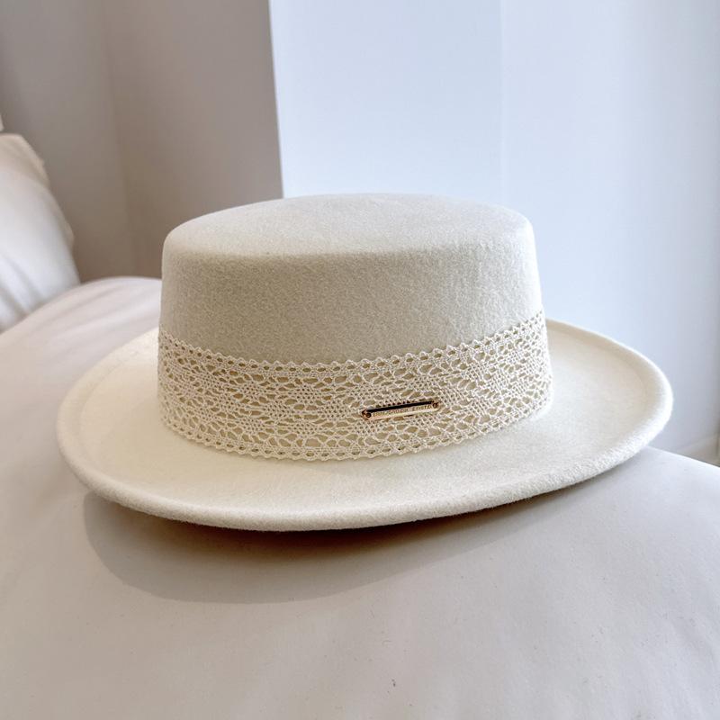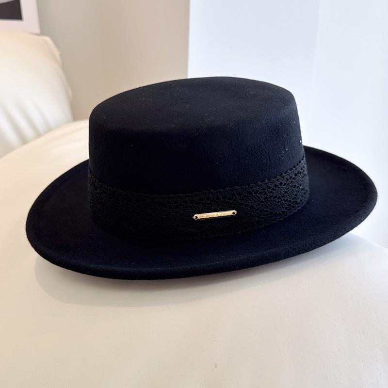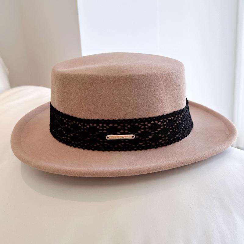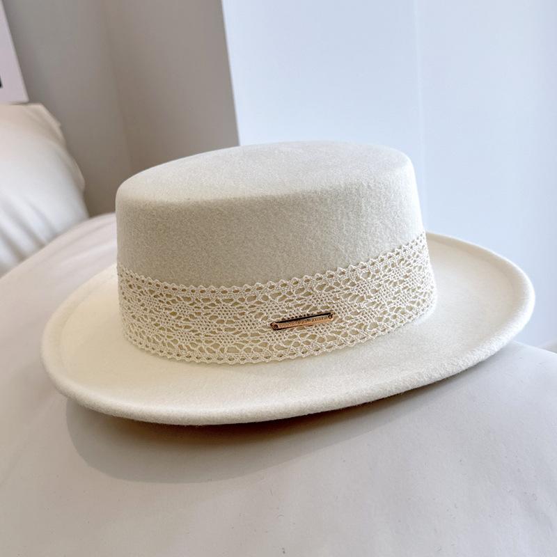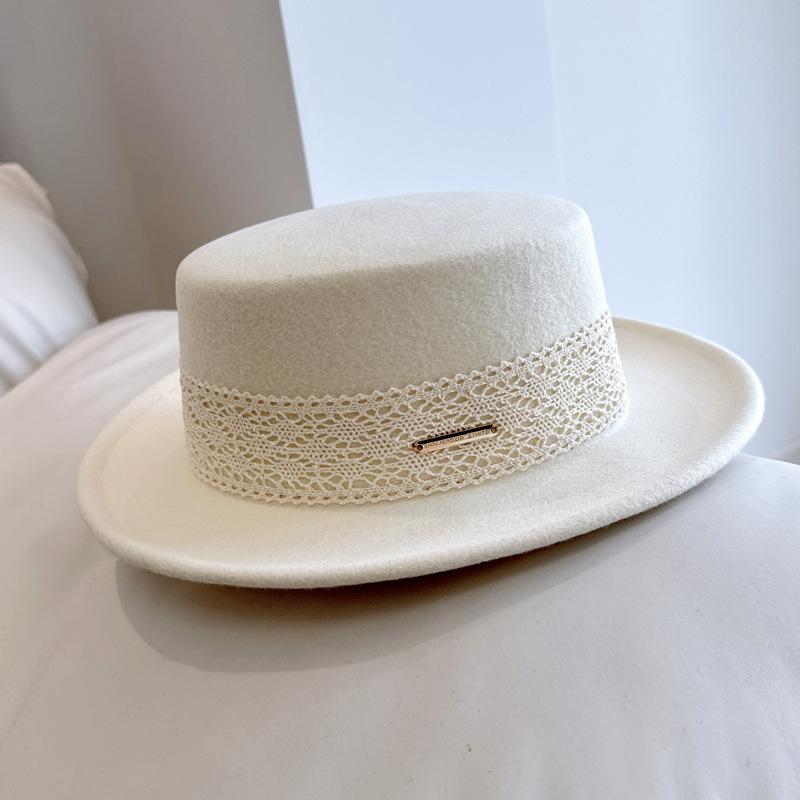 Sombrero plano con cinta de encaje estilo mil dorados para mujer, sombrero de fieltro de lana australiano para otoño e invierno, sombrero de fieltro con etiqueta larga de metal, sombrero de moda.