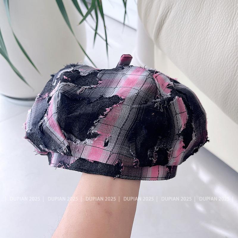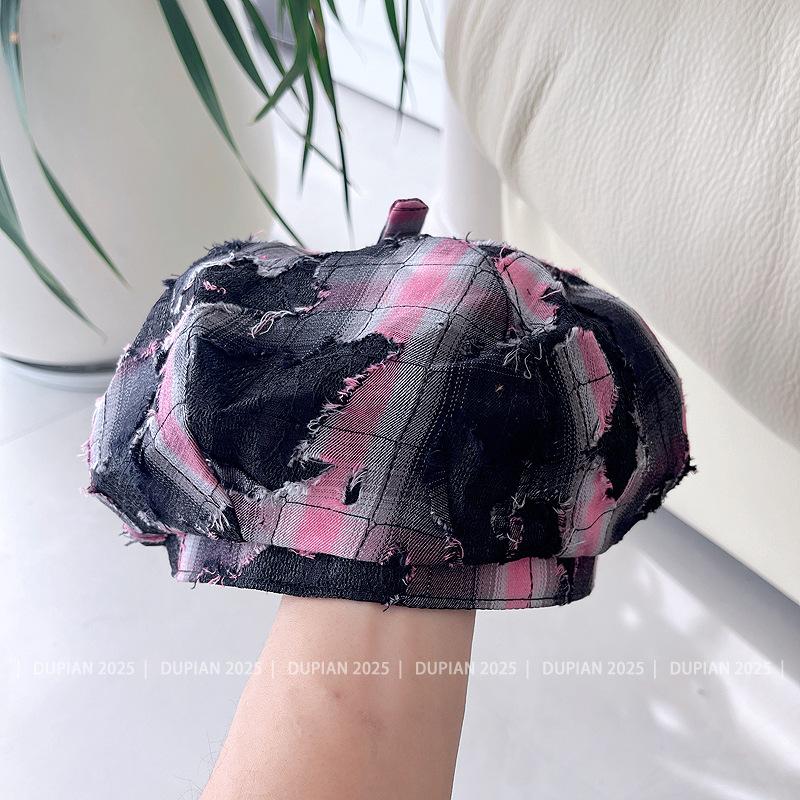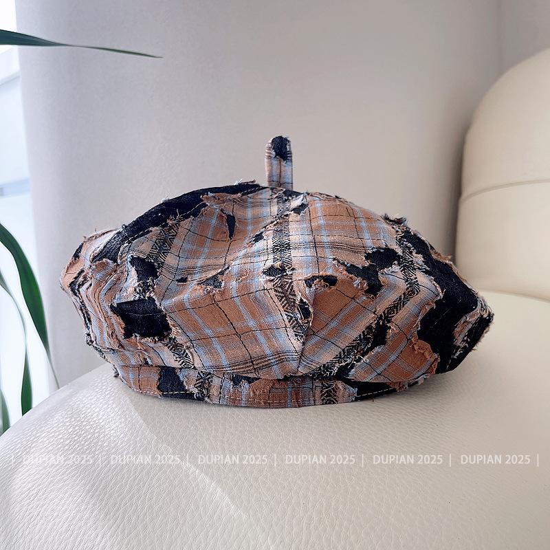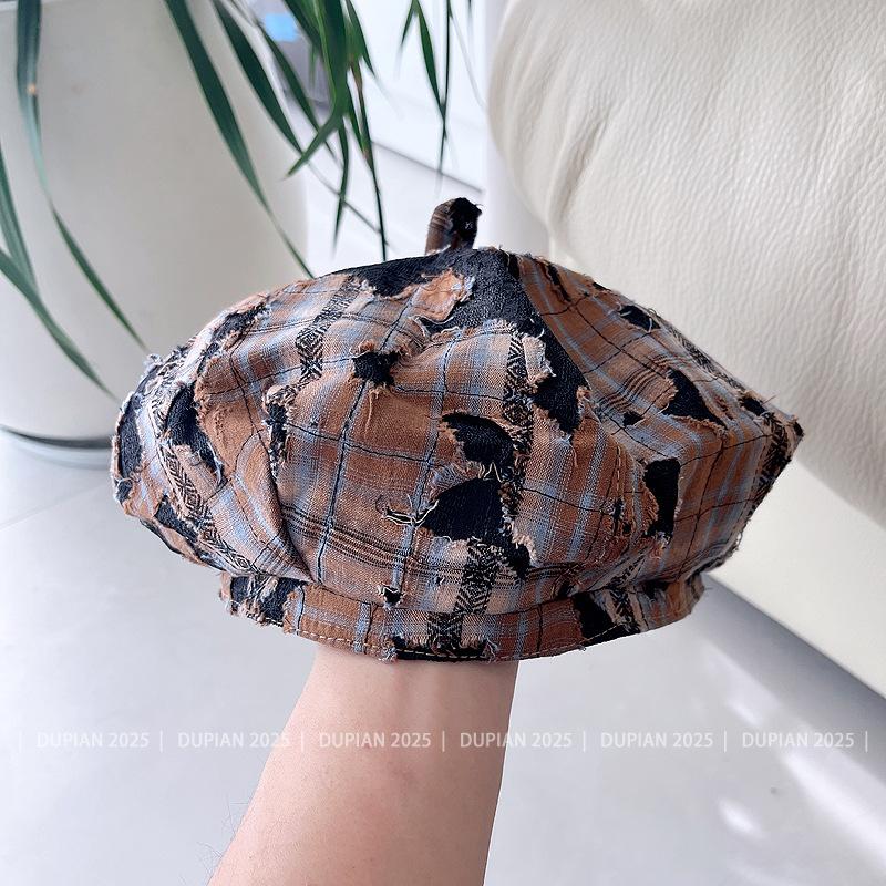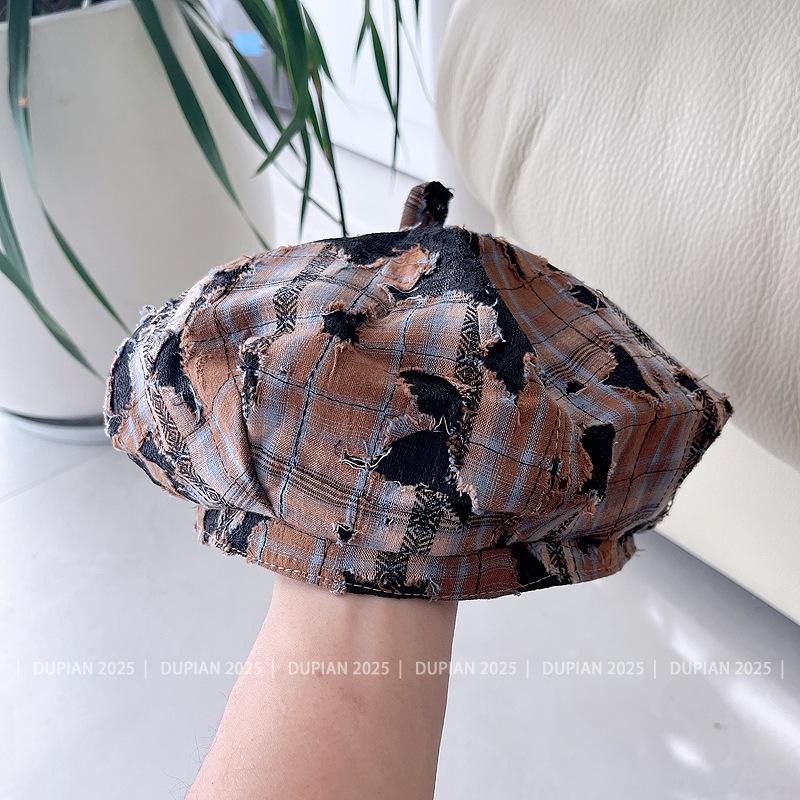 Boina de Moda a Cuadros de Encaje Roto 2025 para Mujer Primavera y Verano Nicho Versátil Sombrero de Pintor Elegante a la Moda Sombrero de Calabaza