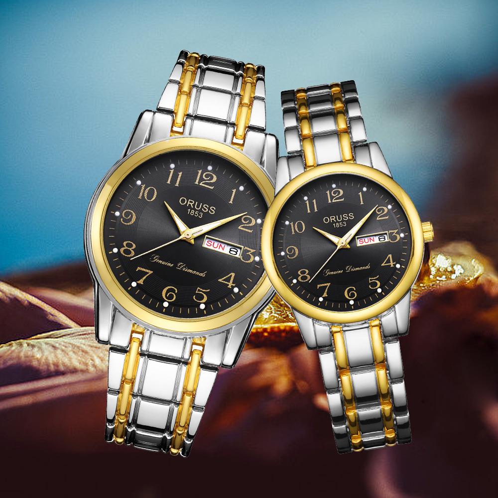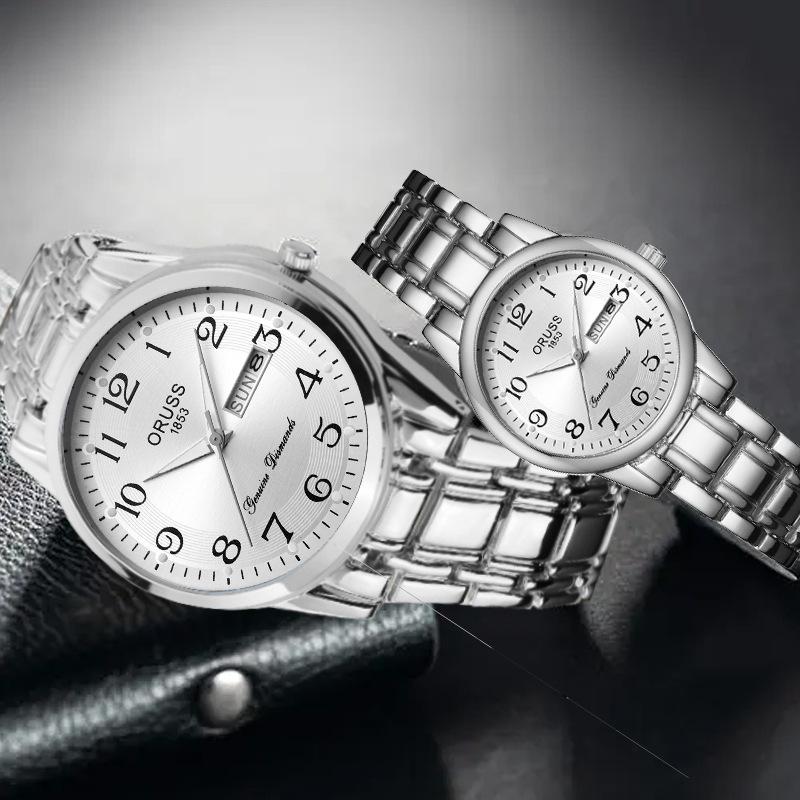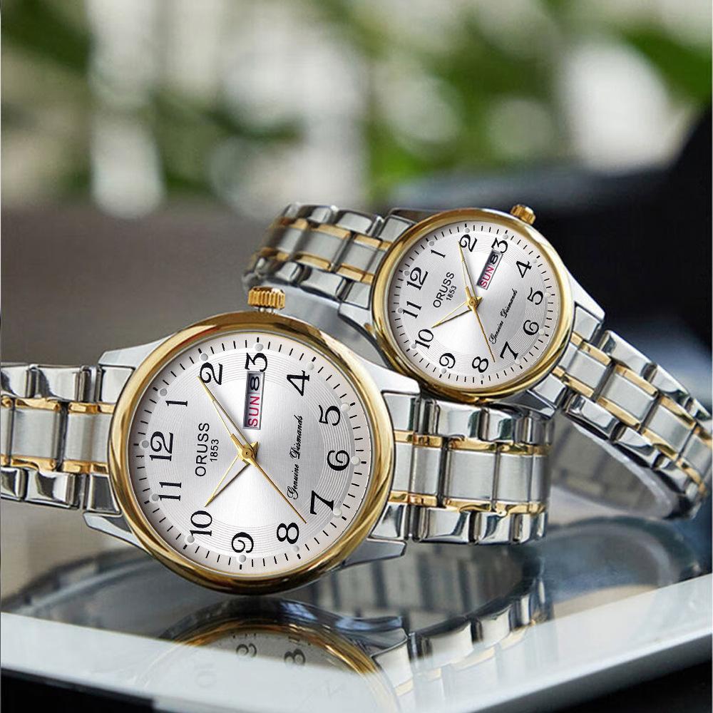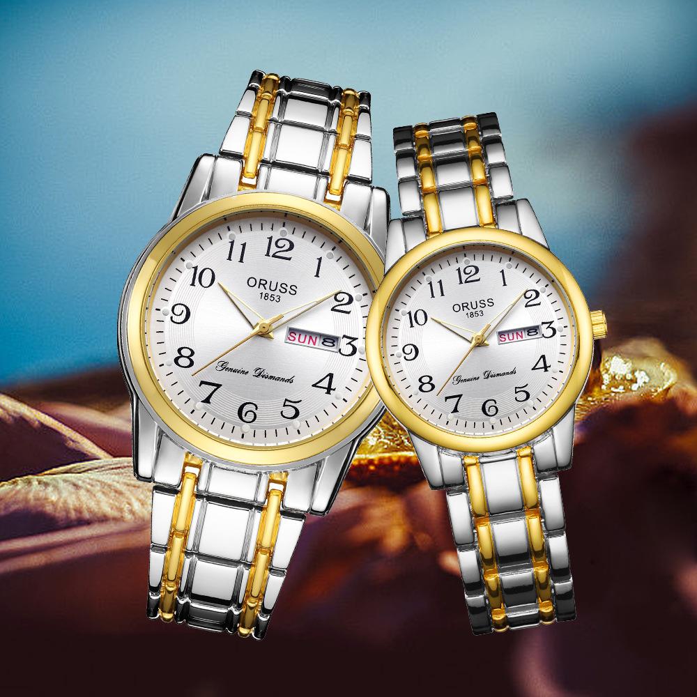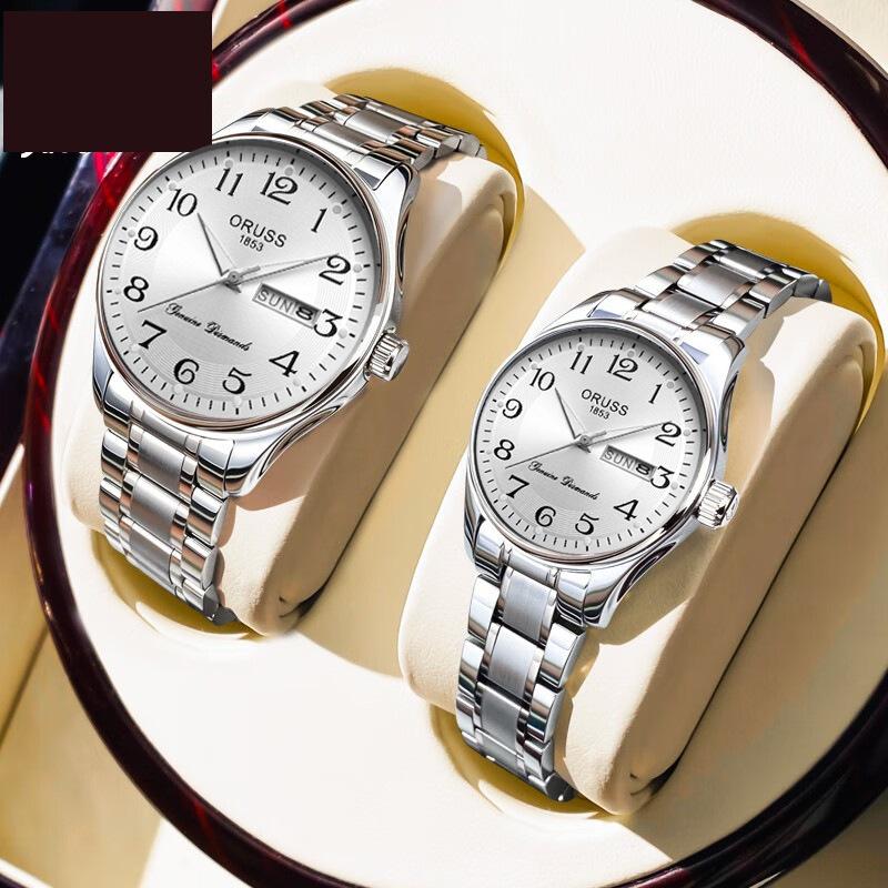Una generación de explosiones rojas netas digitales de parejas de mediana edad y mayores miran un par de relojes de cuarzo resistentes al agua con calendario y correa de acero.