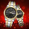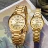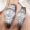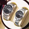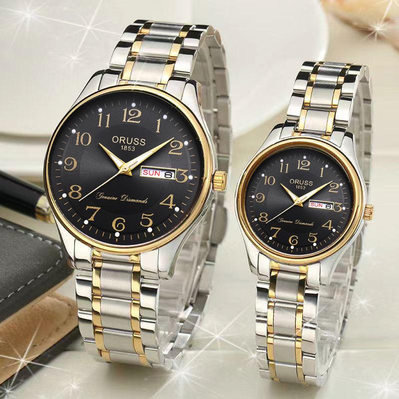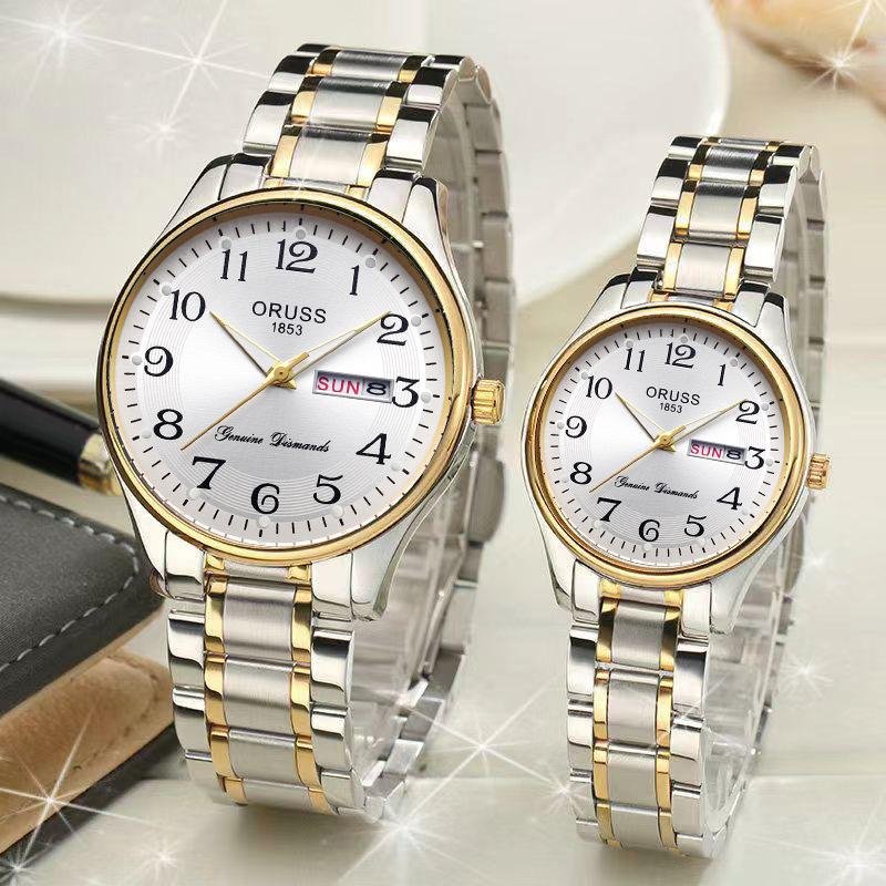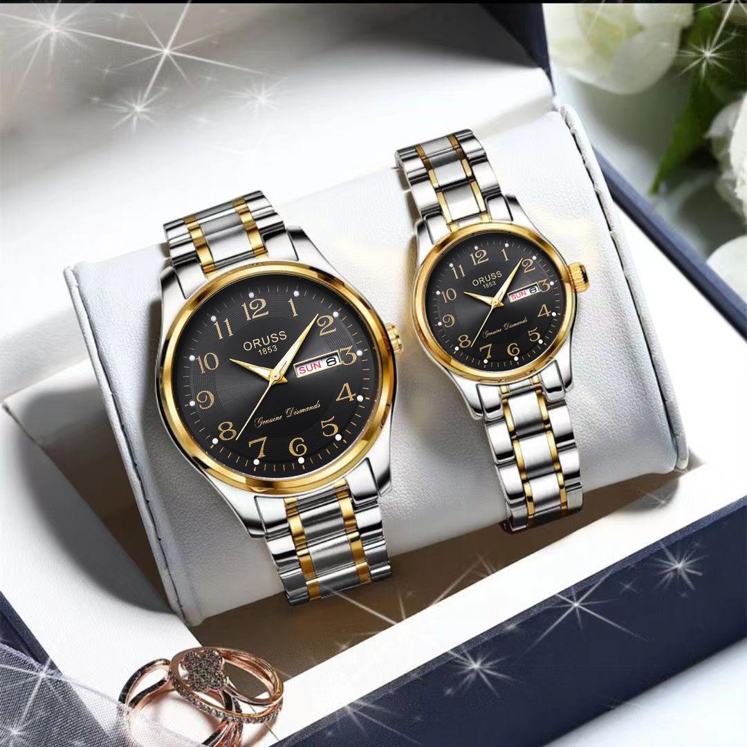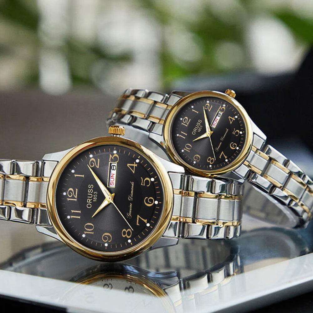 Una generación de explosiones rojas netas digitales de parejas de mediana edad y mayores miran un par de relojes de cuarzo resistentes al agua con calendario y correa de acero.