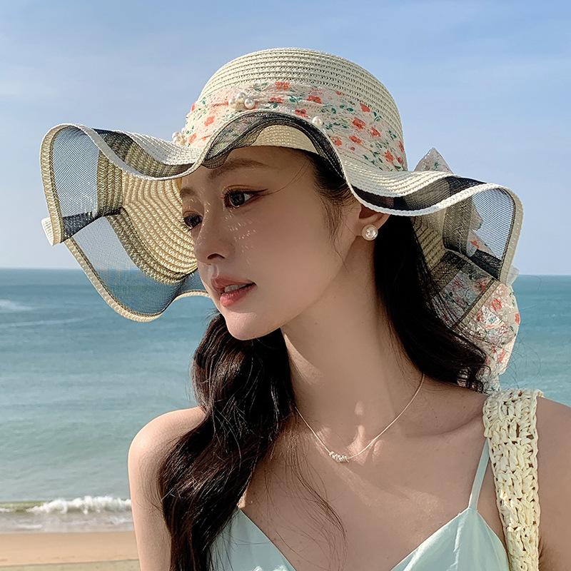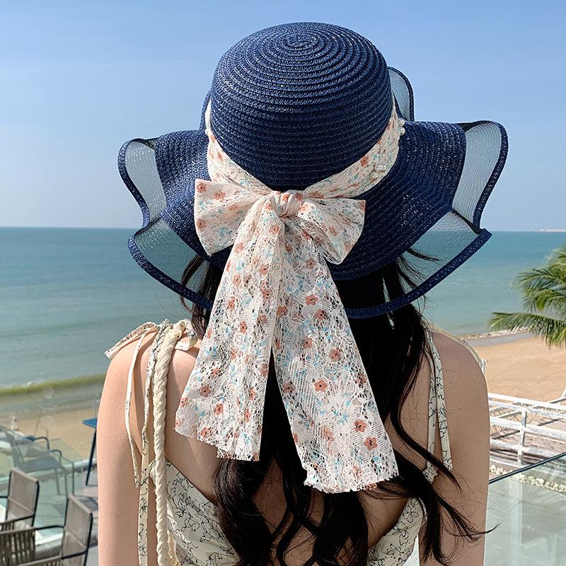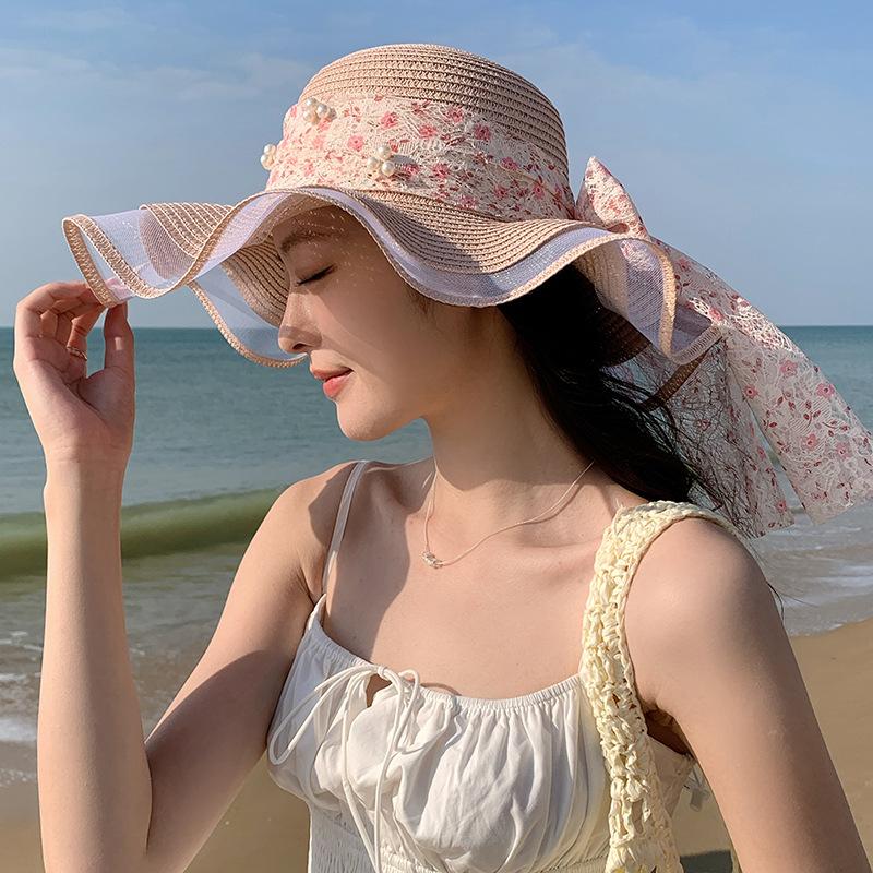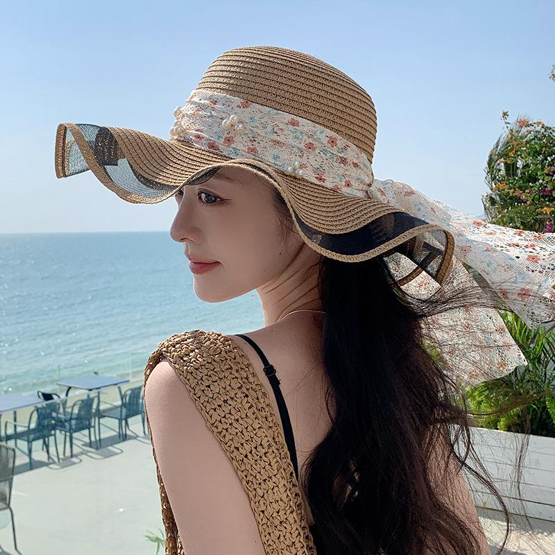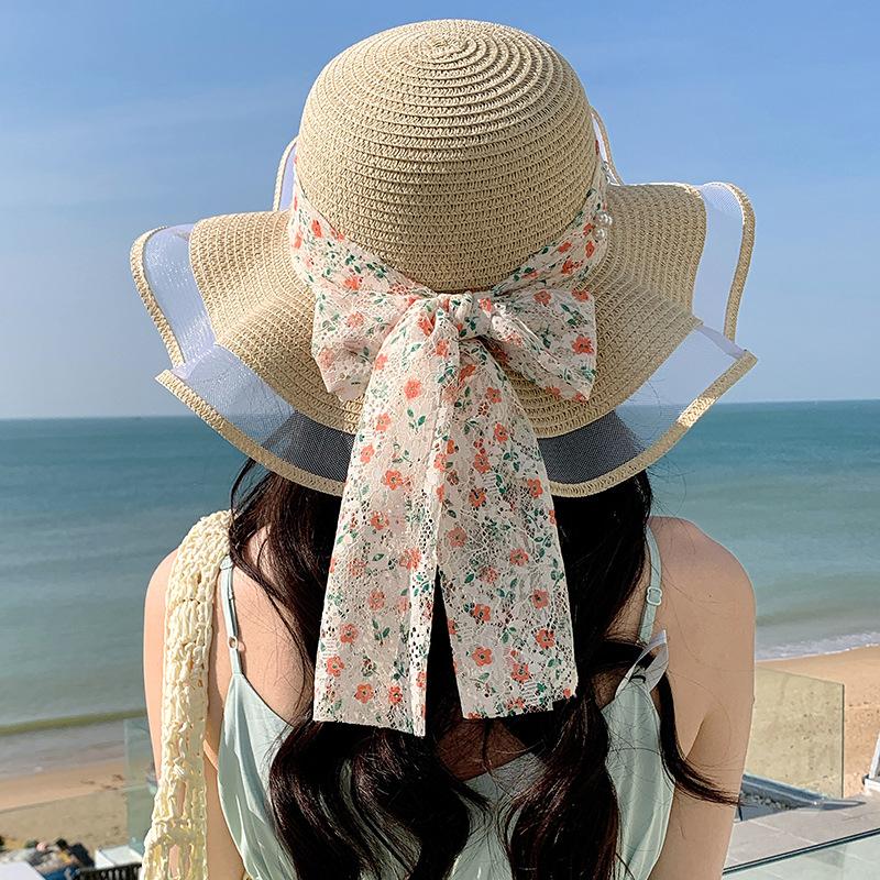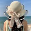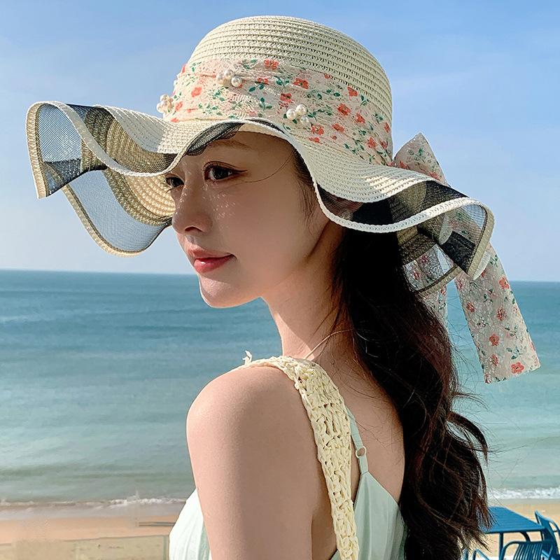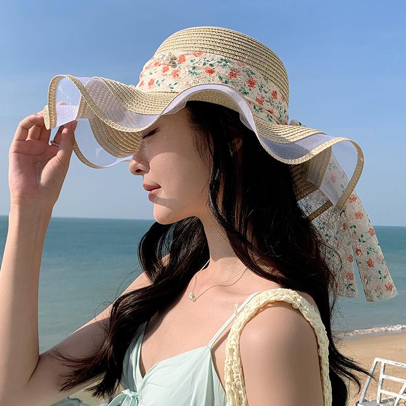 Sombrero de Paja de Verano Dulce Elegante para Mujer Estilo Coreano Pequeño Cinta Floral Sombrero para el Sol Lazo Ala Ancha Sombrero Protección Solar