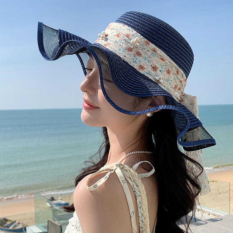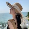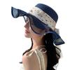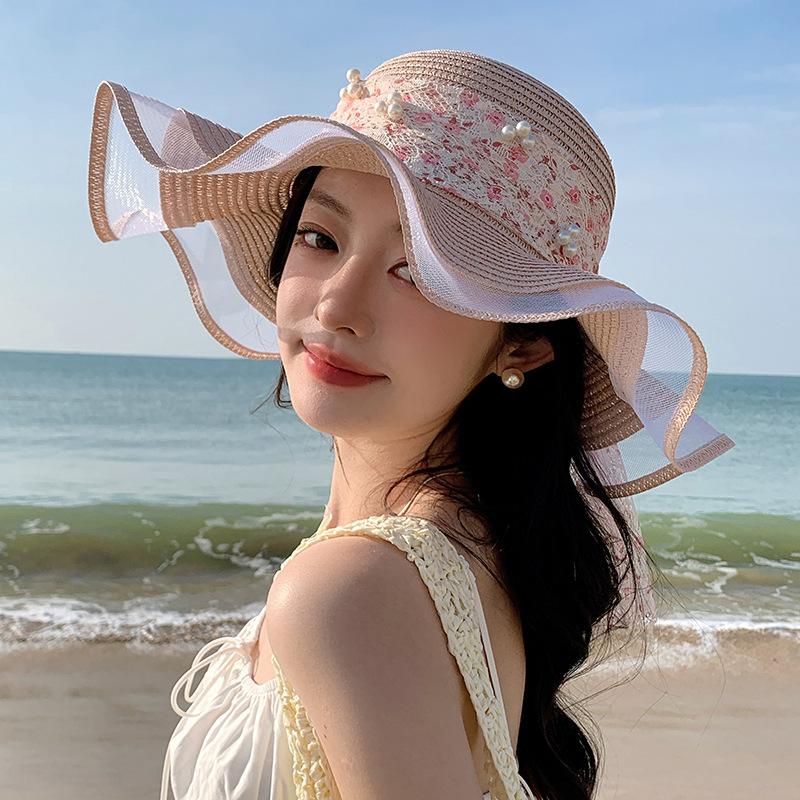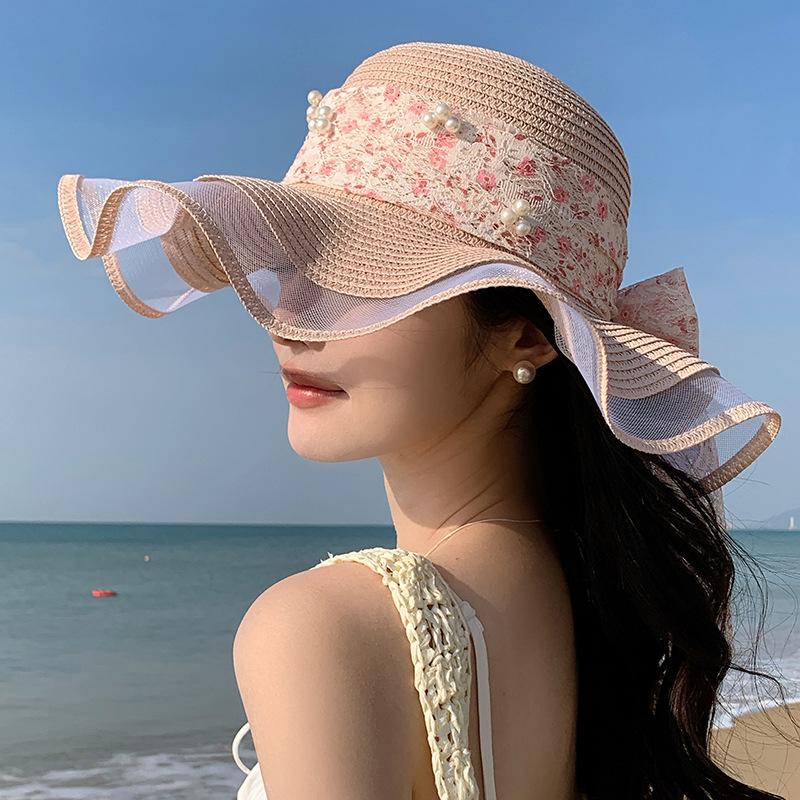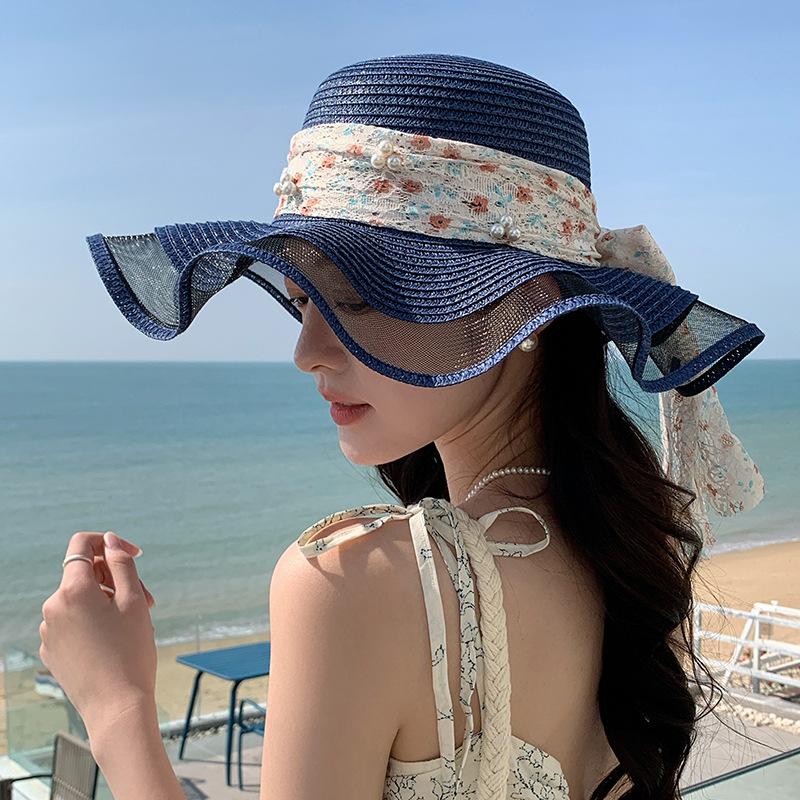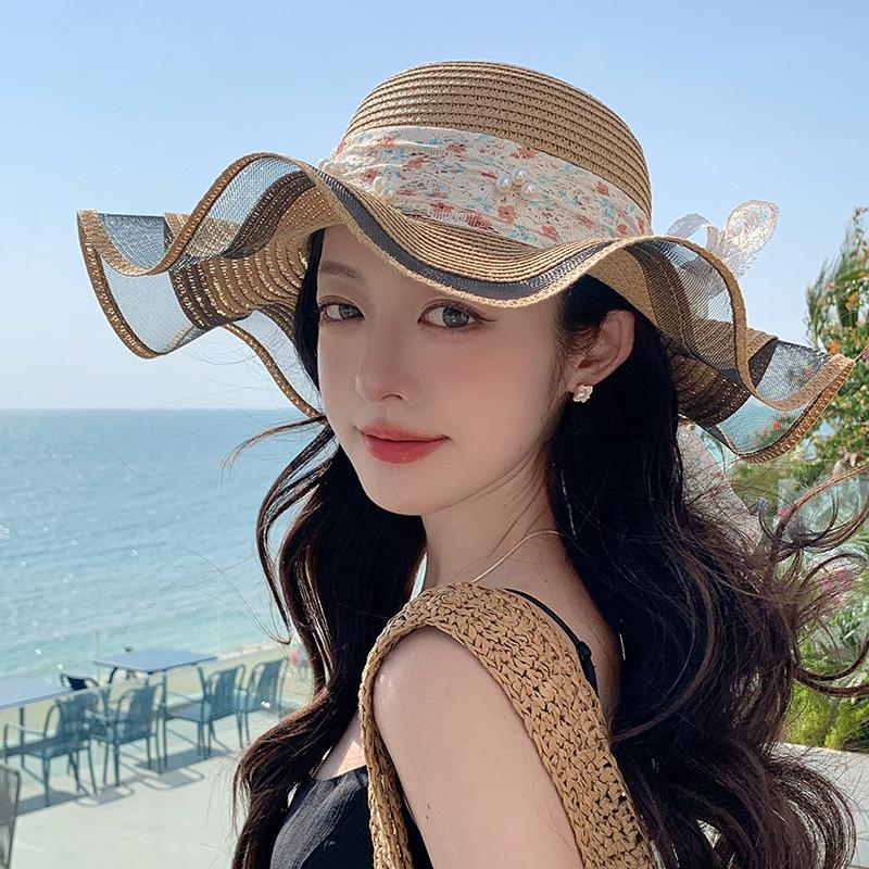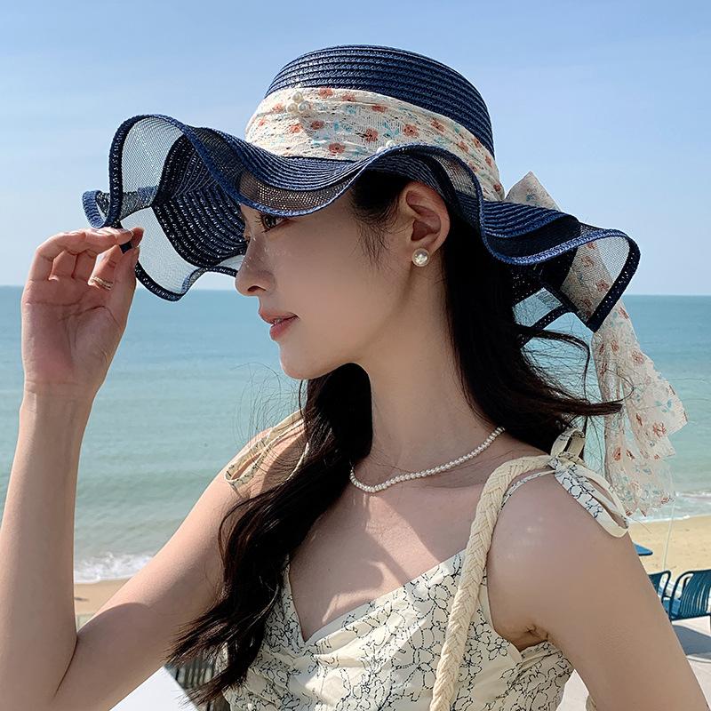 Sombrero de Paja de Verano Dulce Elegante para Mujer Estilo Coreano Pequeño Cinta Floral Sombrero para el Sol Lazo Ala Ancha Sombrero Protección Solar