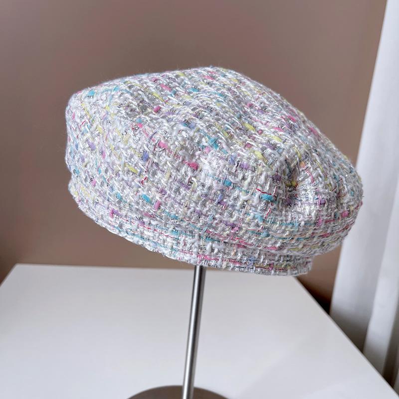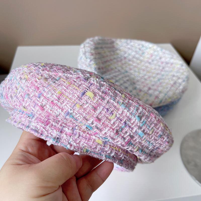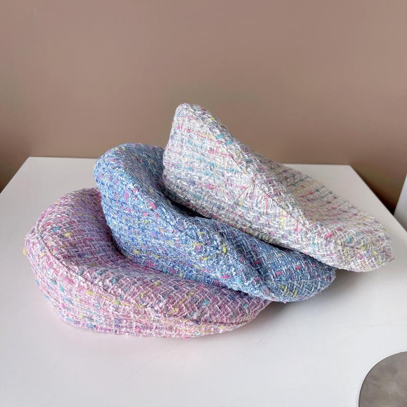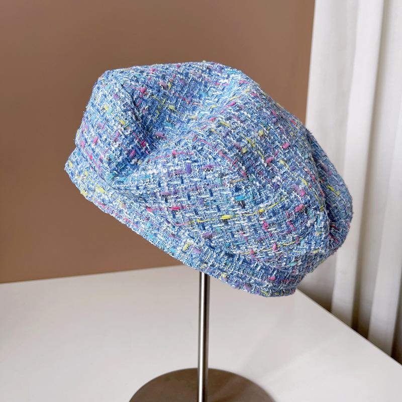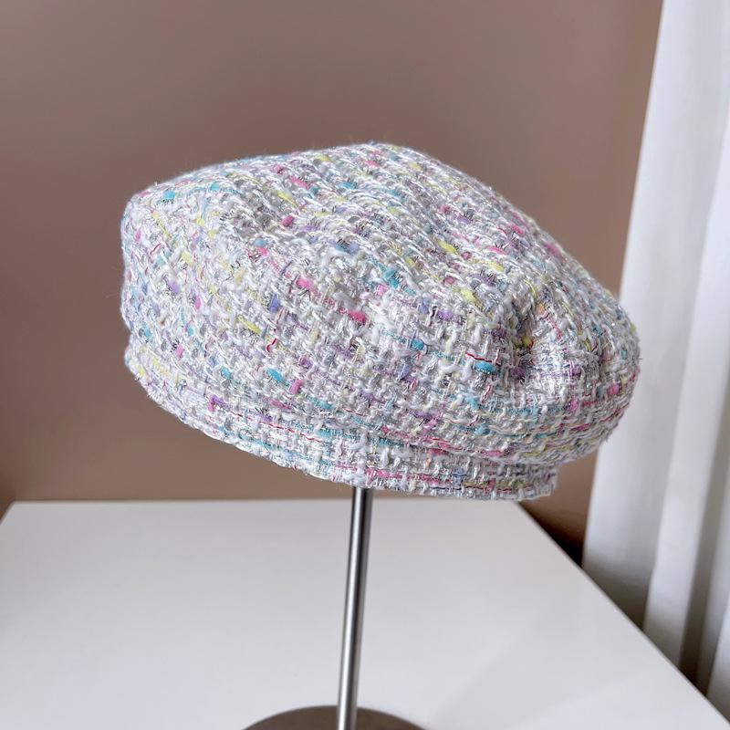 Boina de tweed estilo Chanel para mujer, otoño e invierno, cálida, sombrero de pintor, color mezclado, sombrero de azafata, boina europea y americana que combina con todo