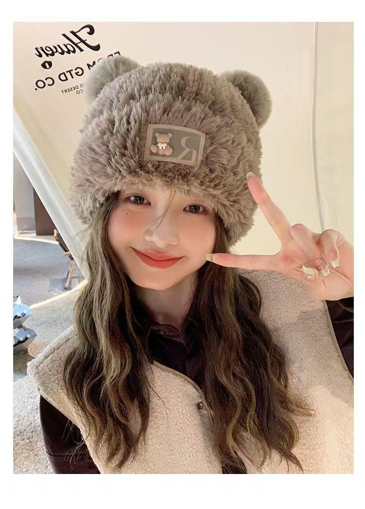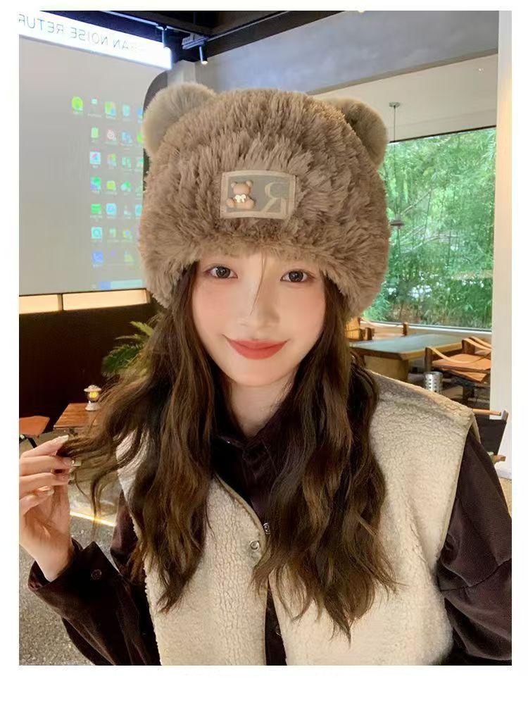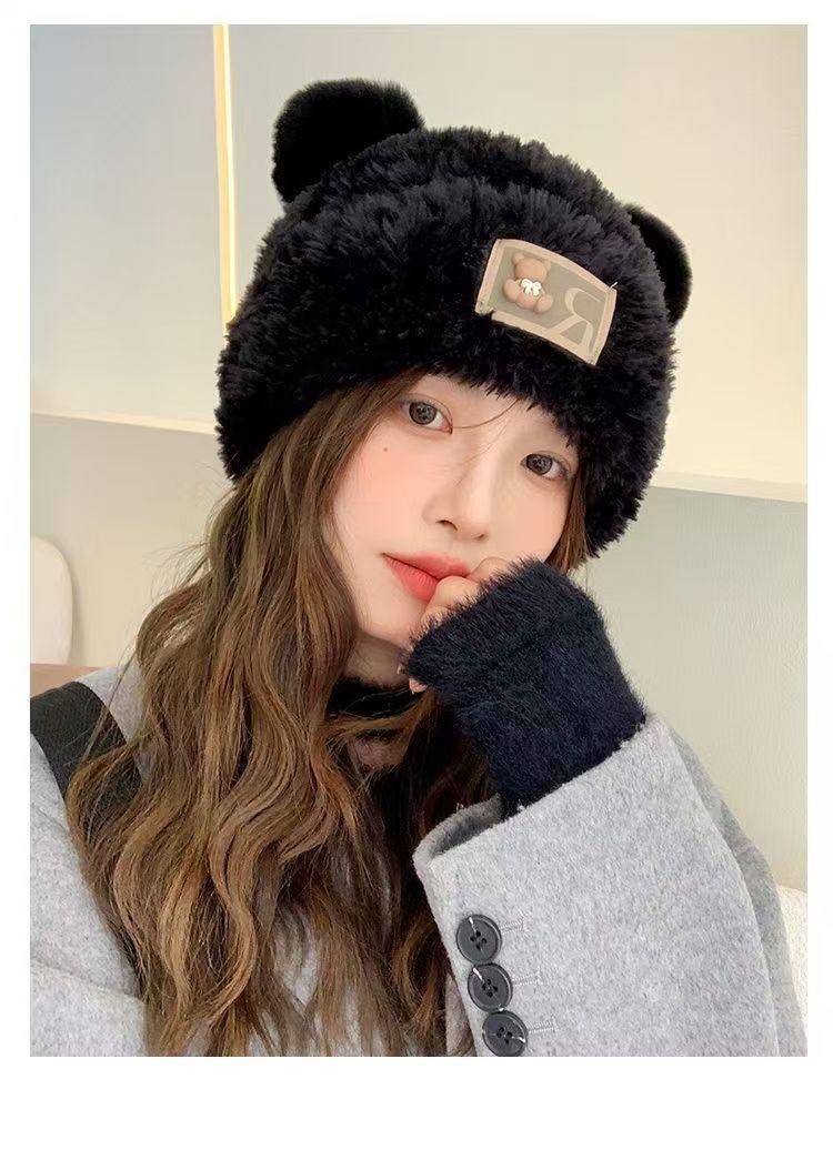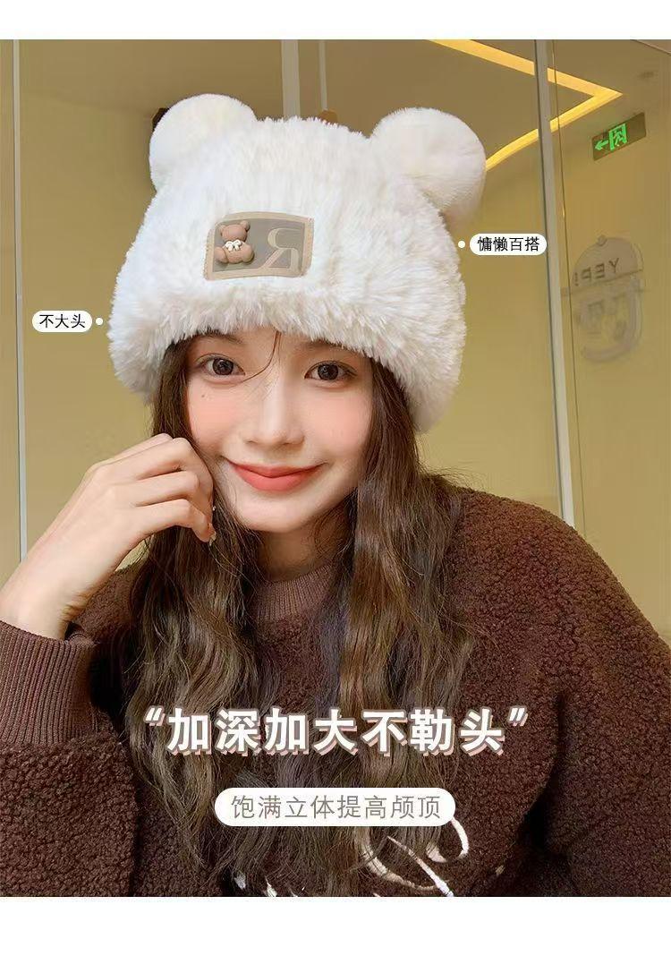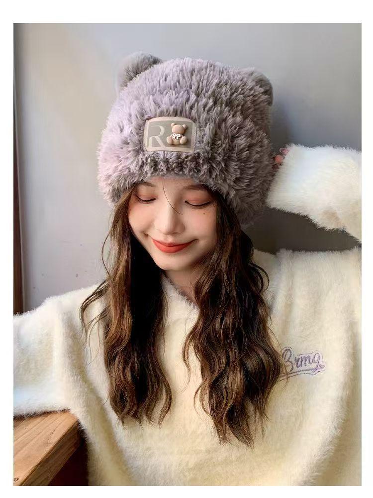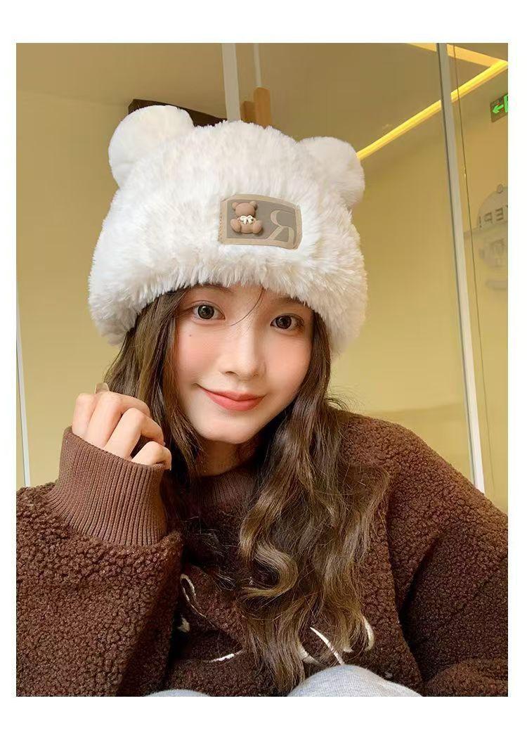 Gorro de lana con orejas de oso para mujer, moderno gorro de invierno con pelo, grueso y cálido, con protección para las orejas, de punto, para cabeza grande
