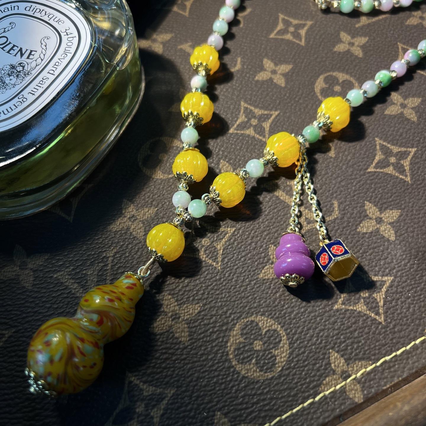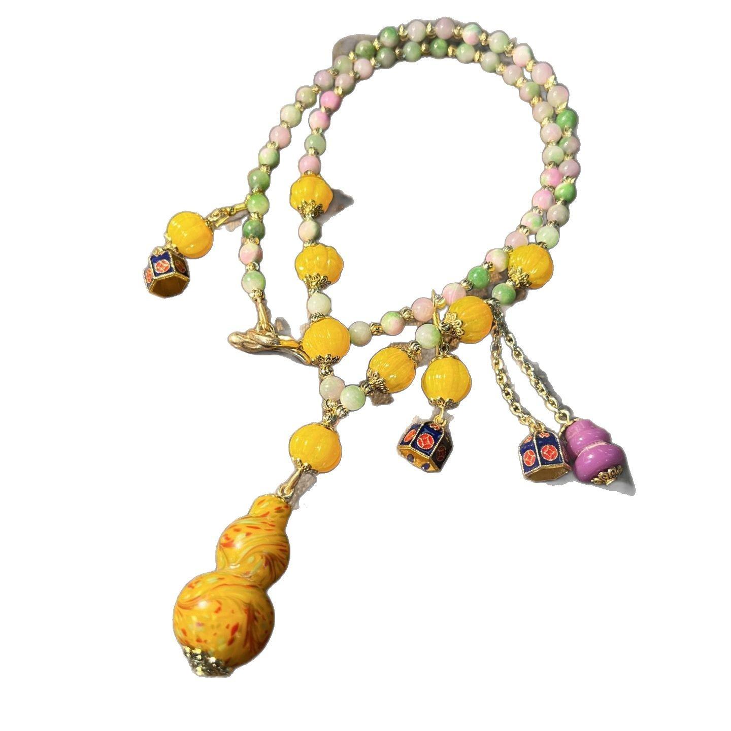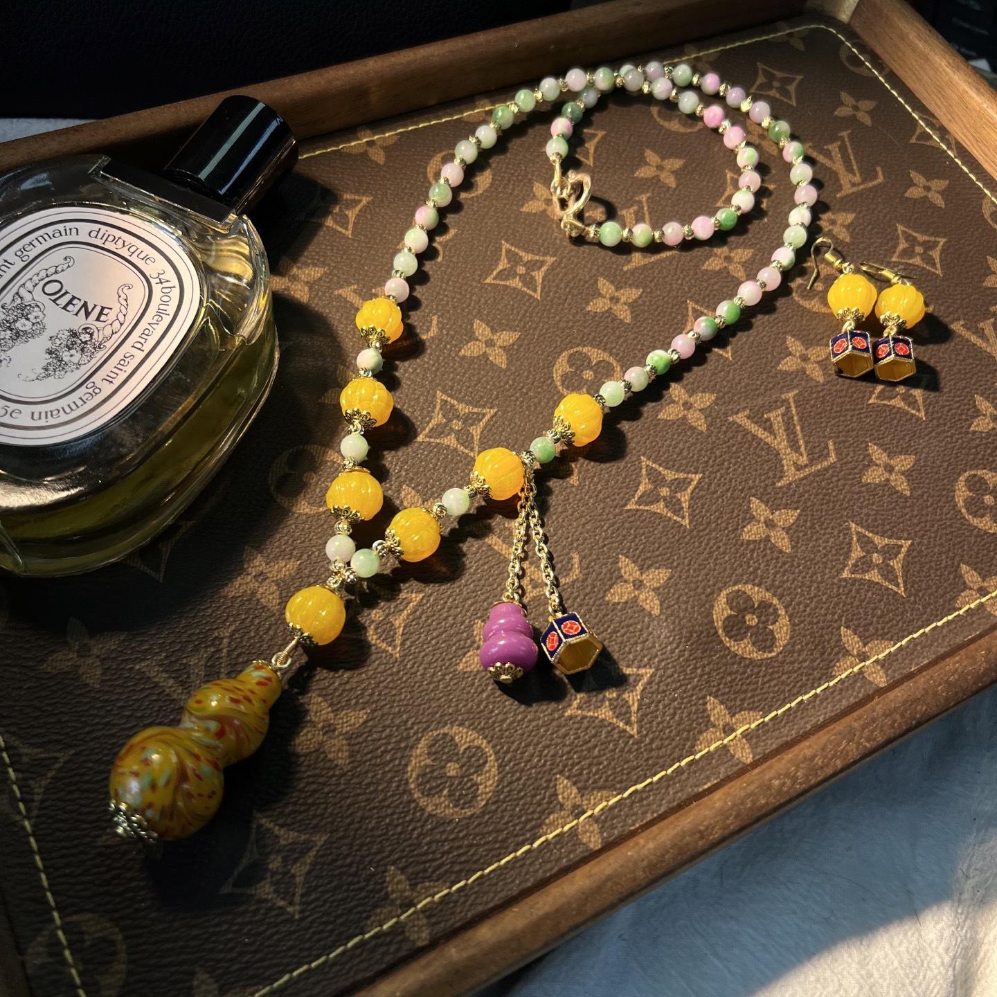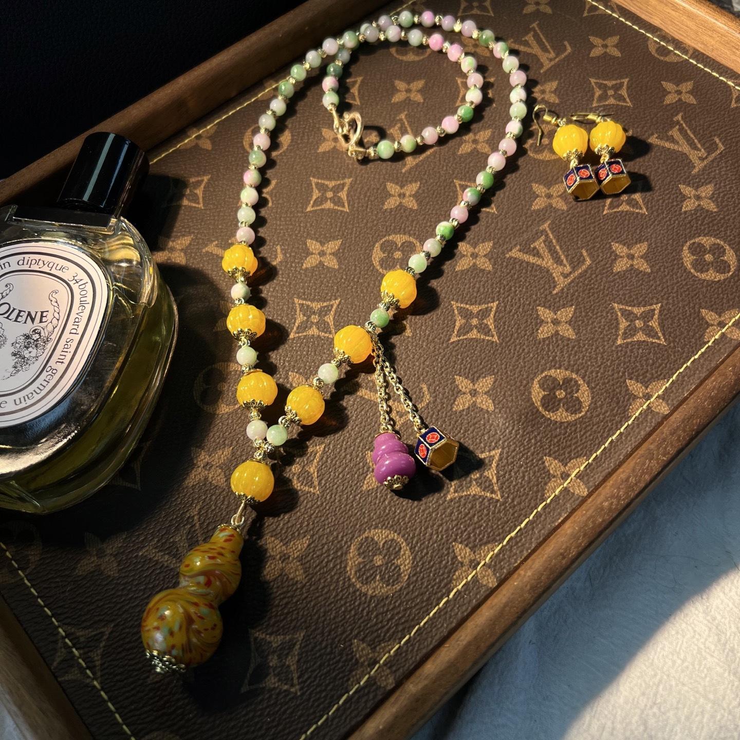 [Honey South] Suéter con cadena de calabaza de cristal de turmalina exquisita de moda vintage, collar y pendientes tipo Joker.