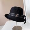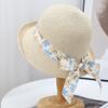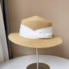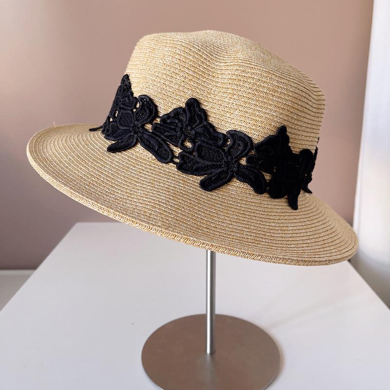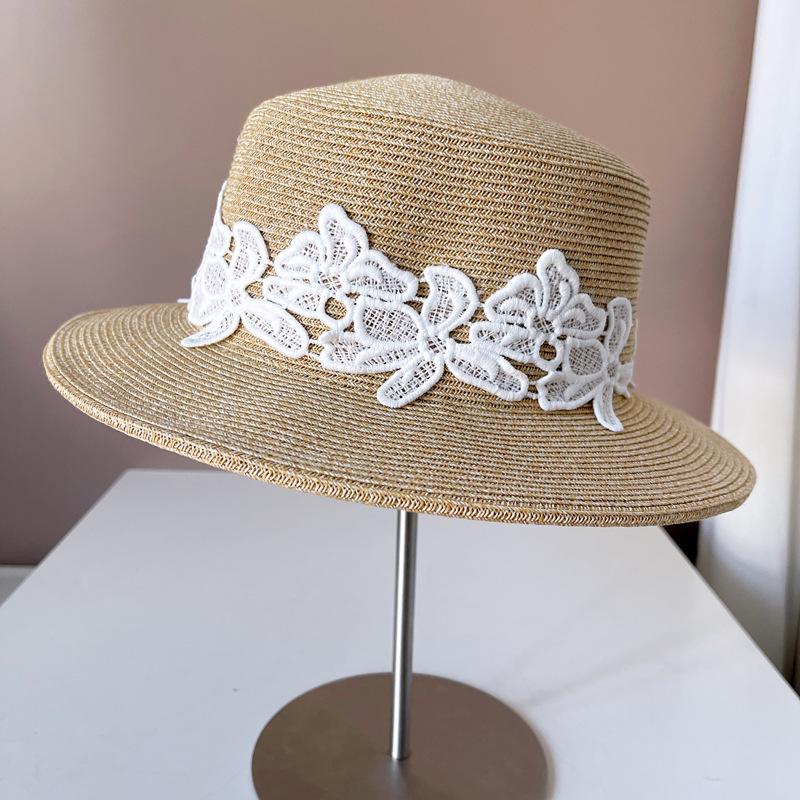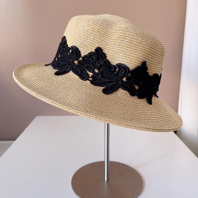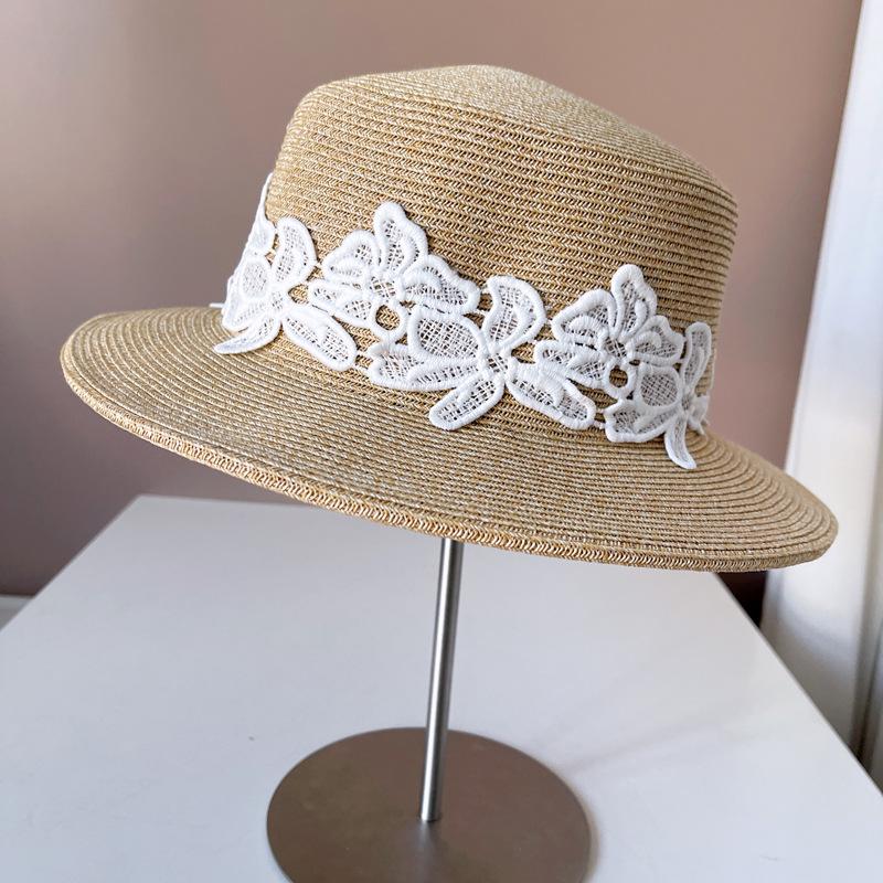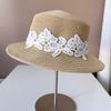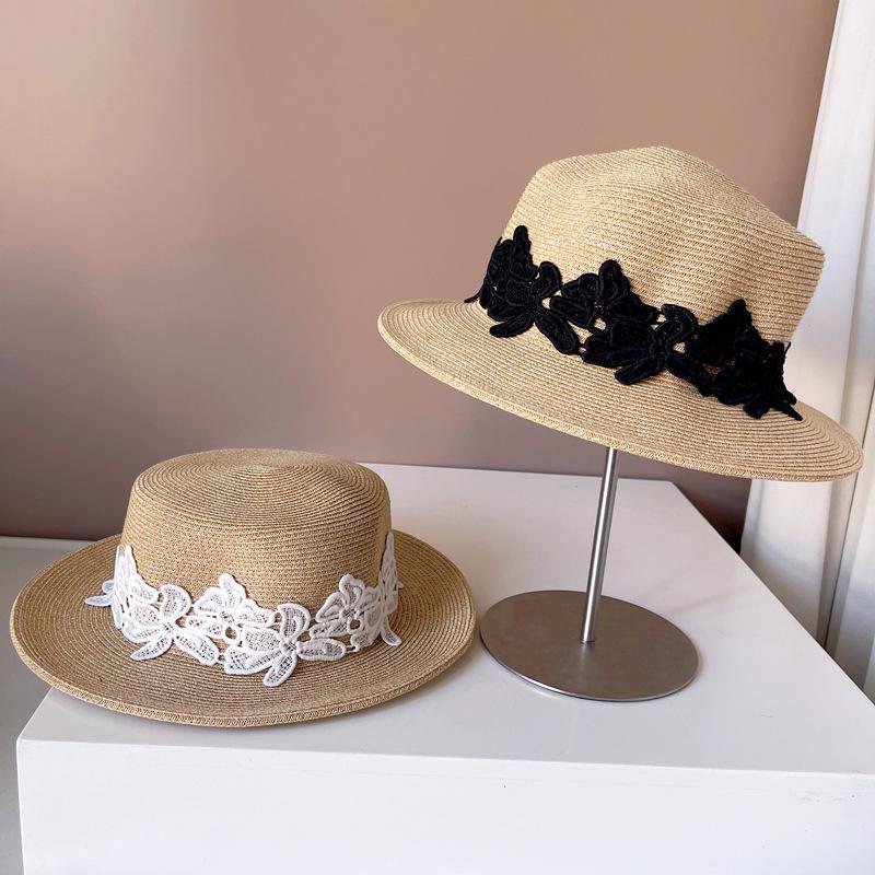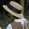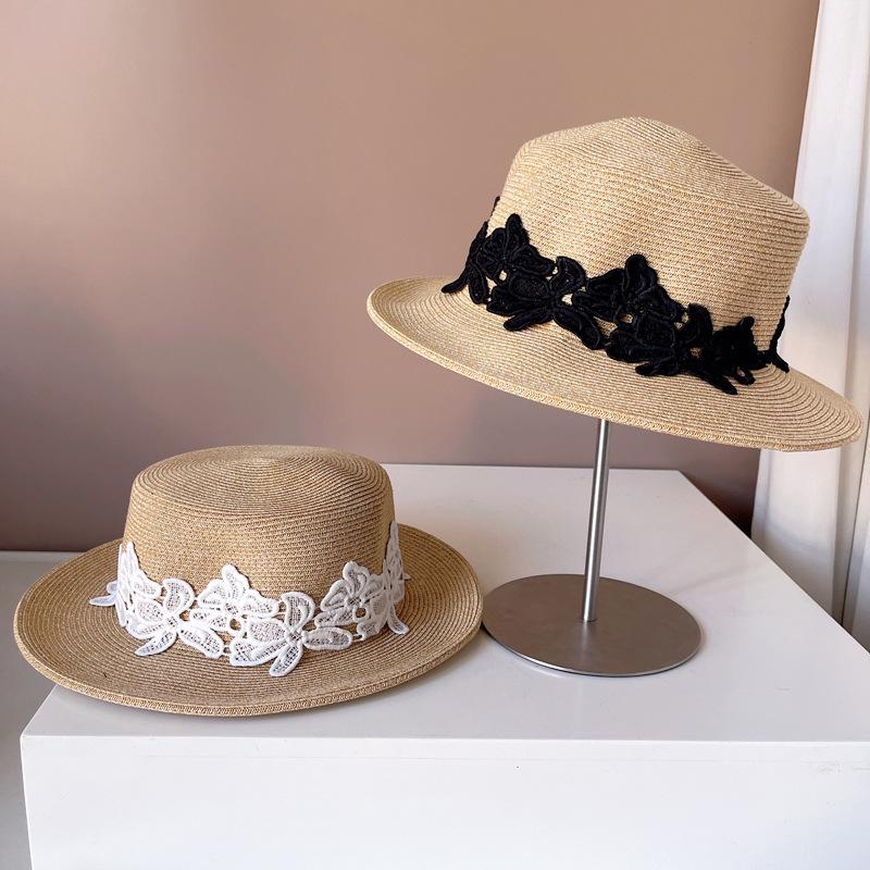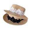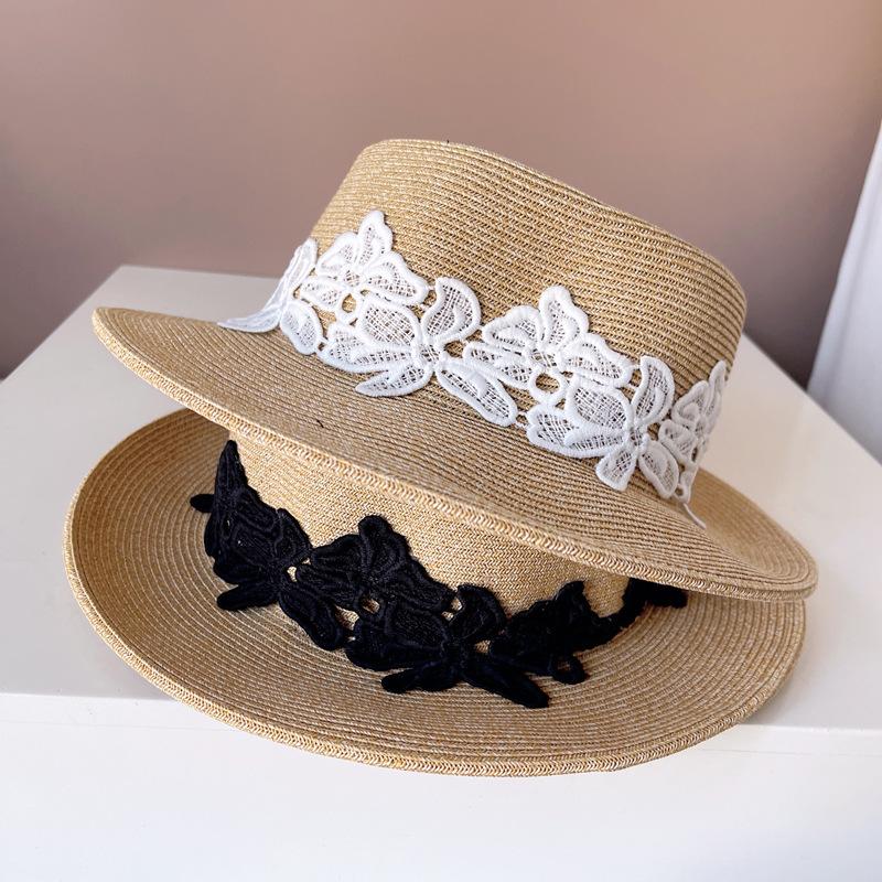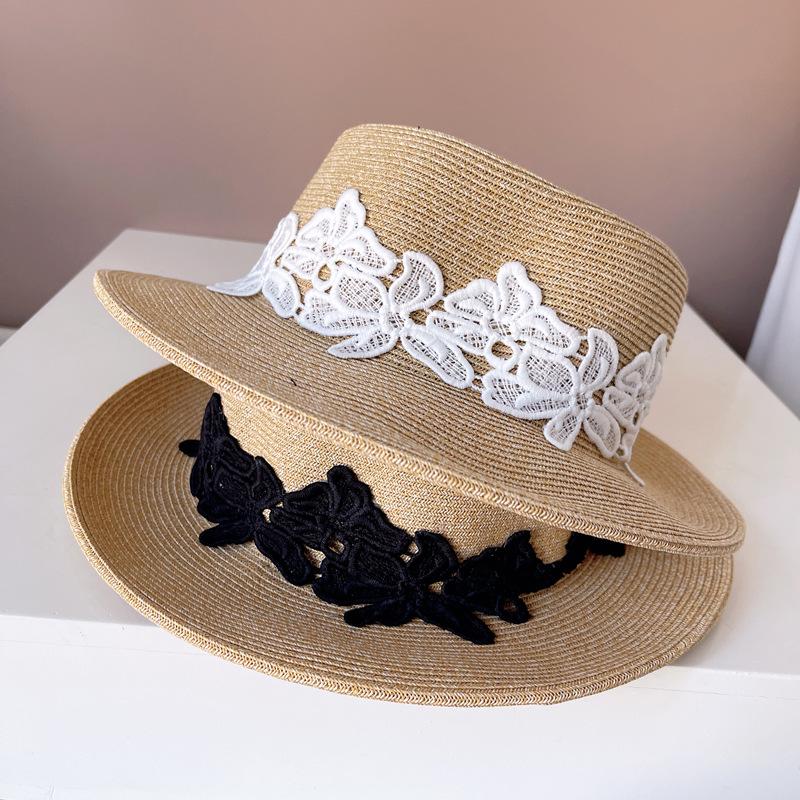 Sombrero de paja elegante de estilo japonés con cinta de encaje y ala plana para mujer, sombrero de paja con protección solar de verano, sombrero de ala plana sencillo y combinable con todo.