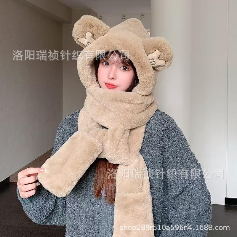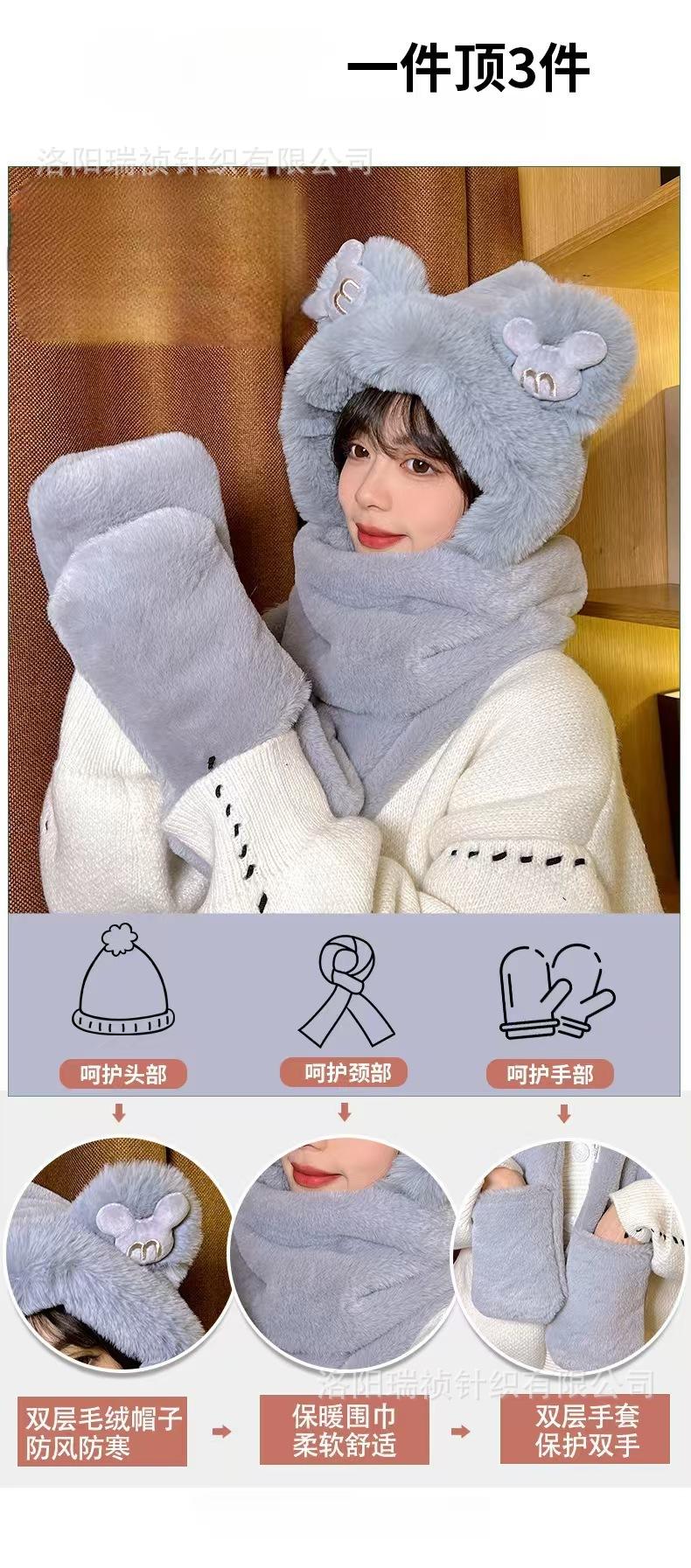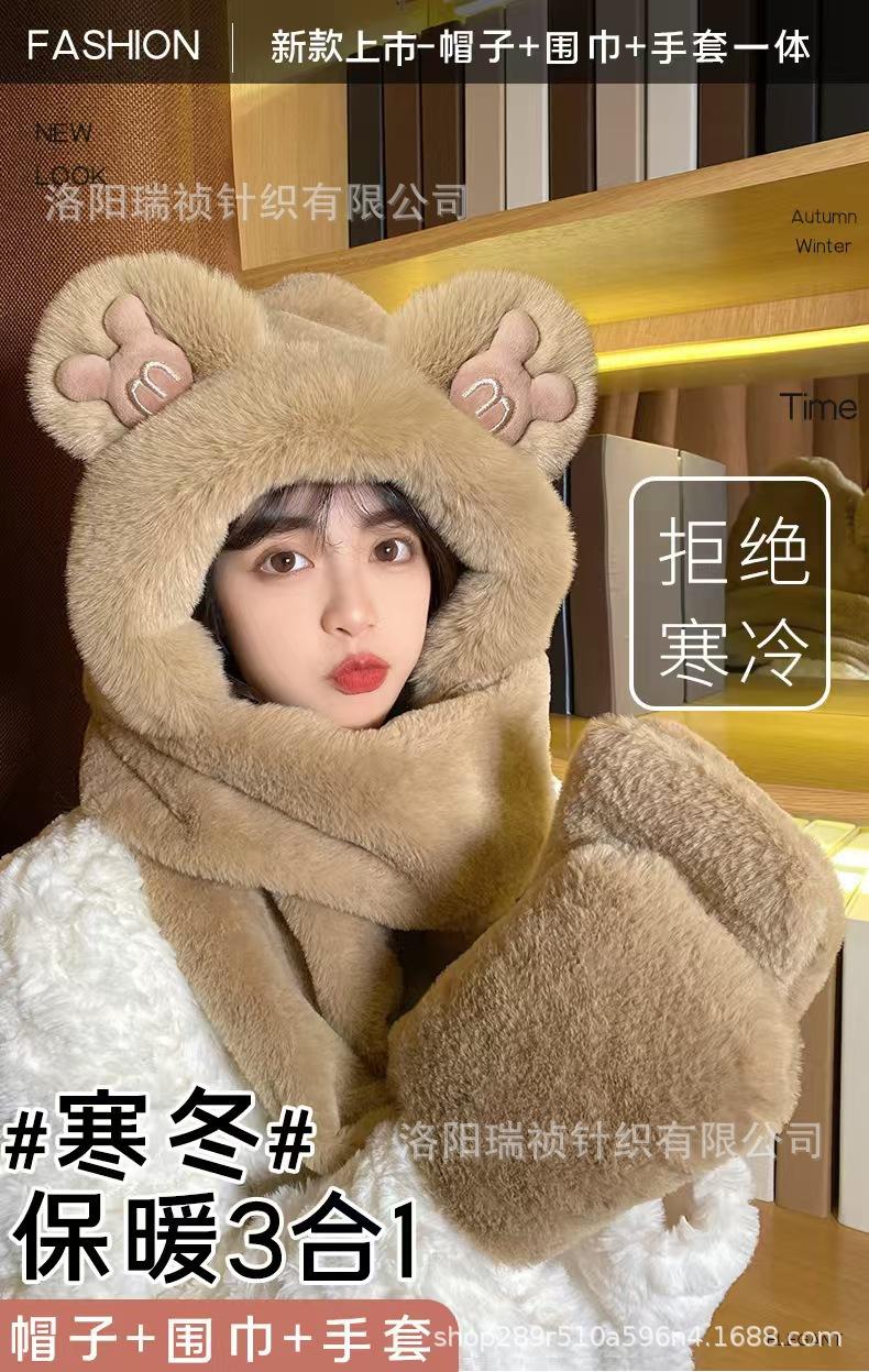 Invierno Sombrero de Oso Bufanda Guantes Un Conjunto de Tres Piezas Moda Coreana Versátil Cálido para Montar Cubre Cara