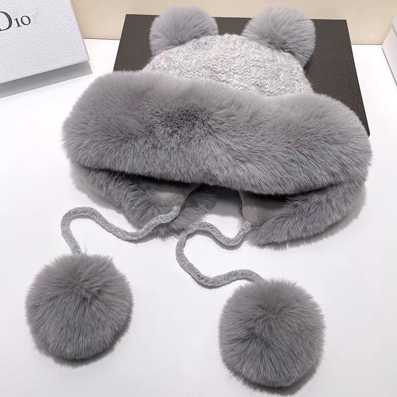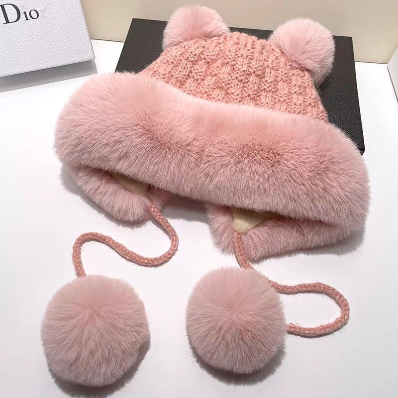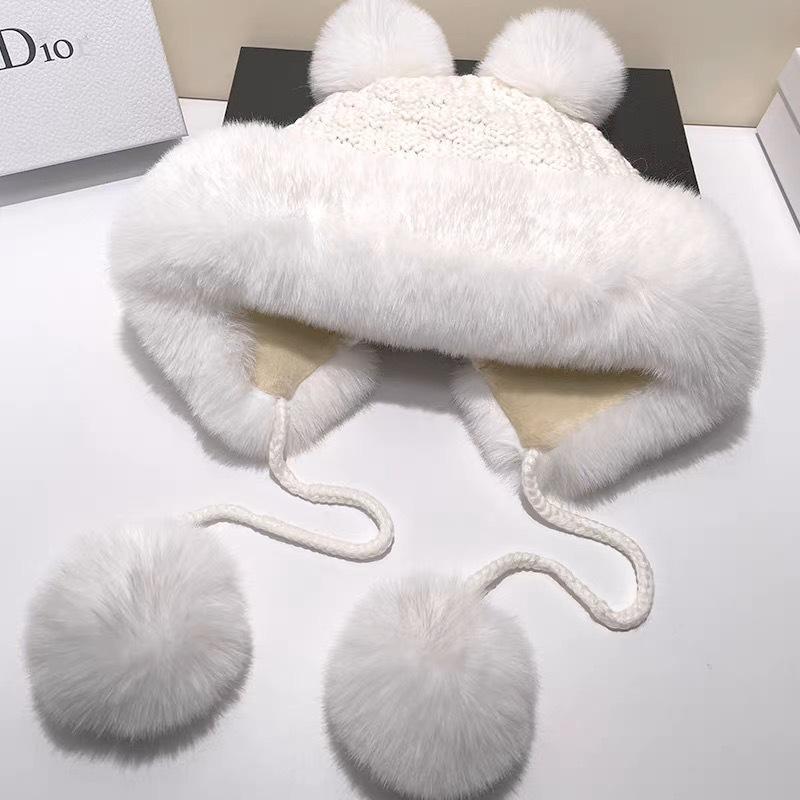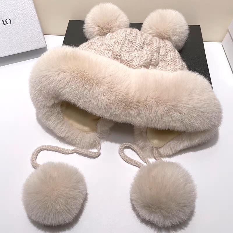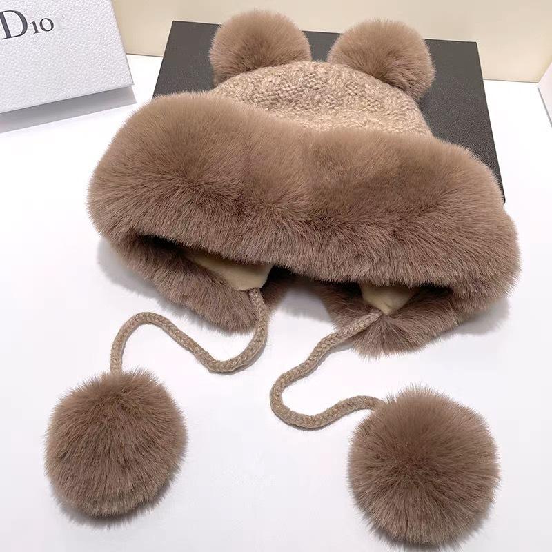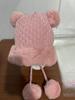Gorro de punto con protección para los oídos, grueso y moderno, con bonito oso de peluche, gorro Lei Feng, gorro de viaje para mujer, jersey de lana, gorro frío.