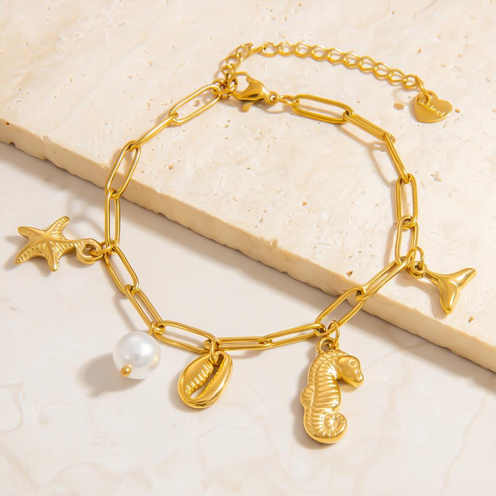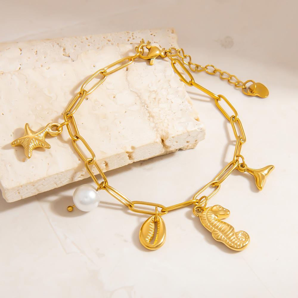 Pulsera de Perlas Transfronteriza Sentido de Lujo Ligero de Alta Gama No se Desvanece Colgante de Estrella de Mar Pulsera de Colgante Único Pulsera de Acero Inoxidable Chapada en Oro de 18k