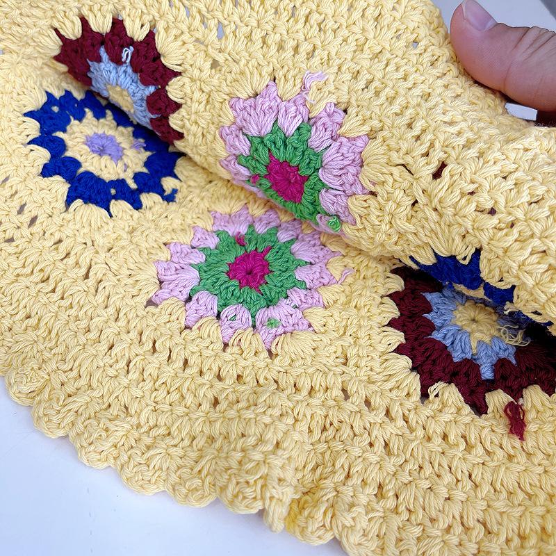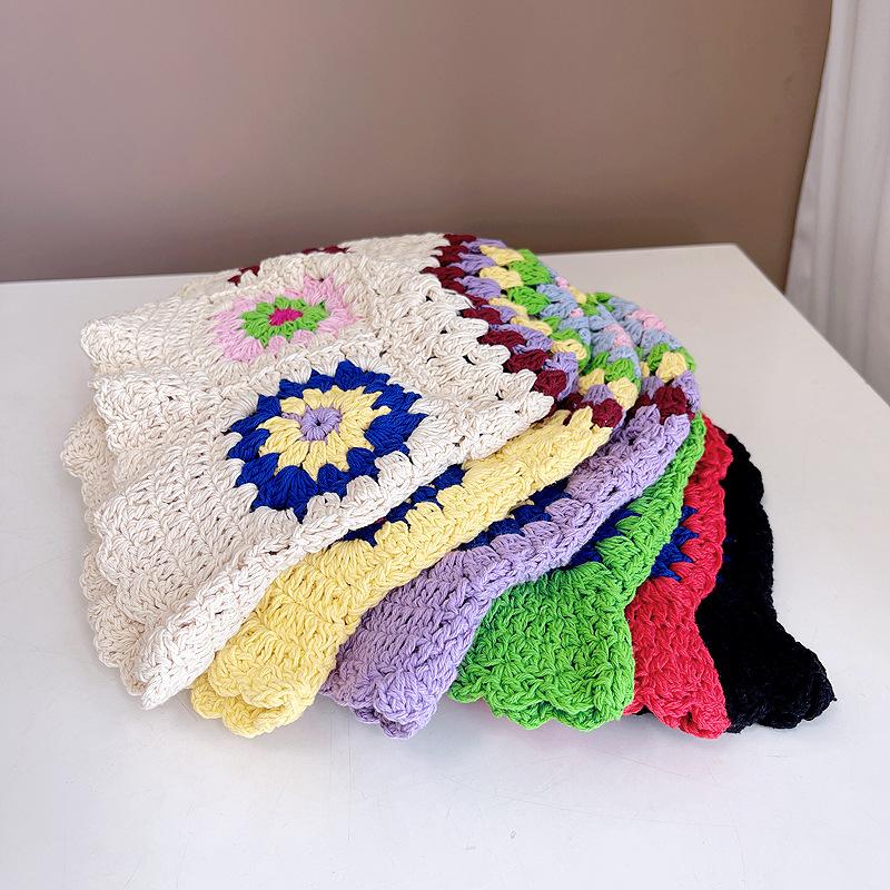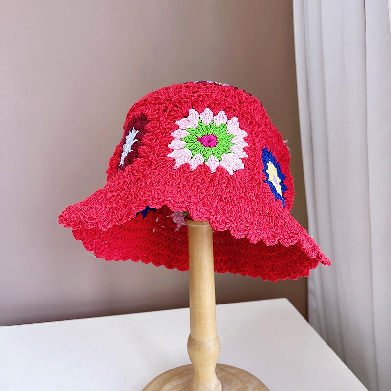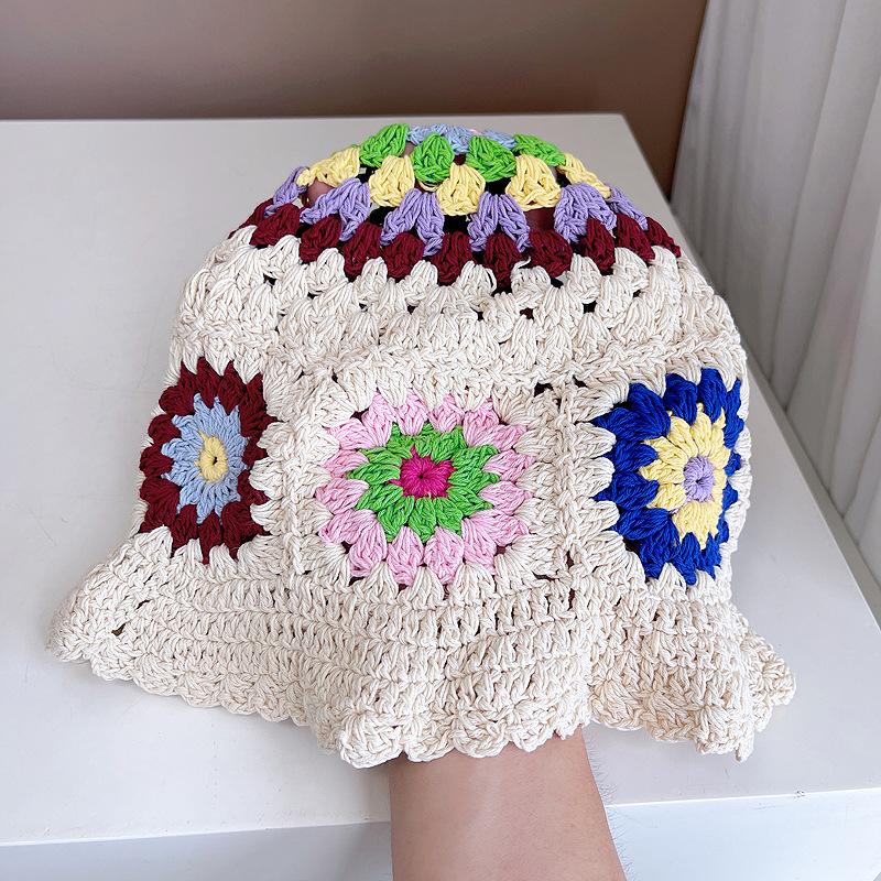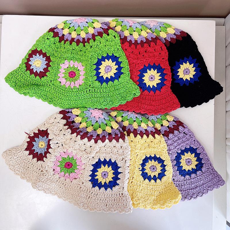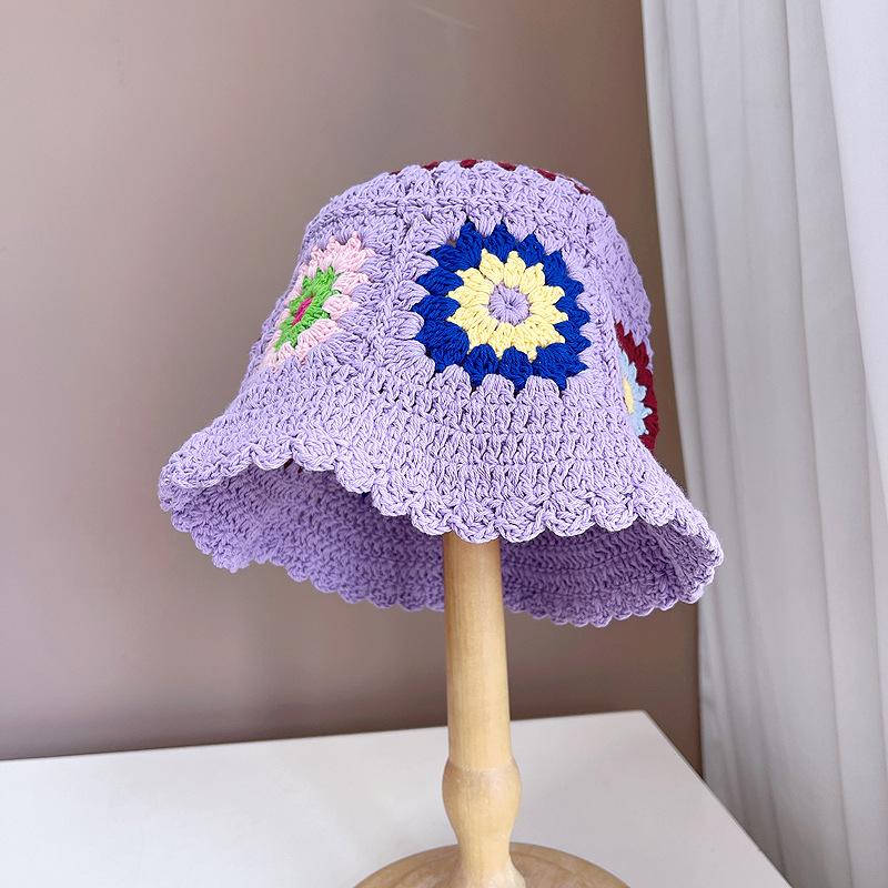 Sombrero de pescador de lana vintage hecho a mano con color de nicho para mujer, tejido con flores para otoño, estilo Hyun Ya, color contrastante, moderno.