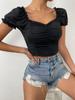 Camiseta corta de manga corta con cuello cuadrado y encaje ajustado, nueva moda europea y americana de Amazon, diseño plisado, color liso.