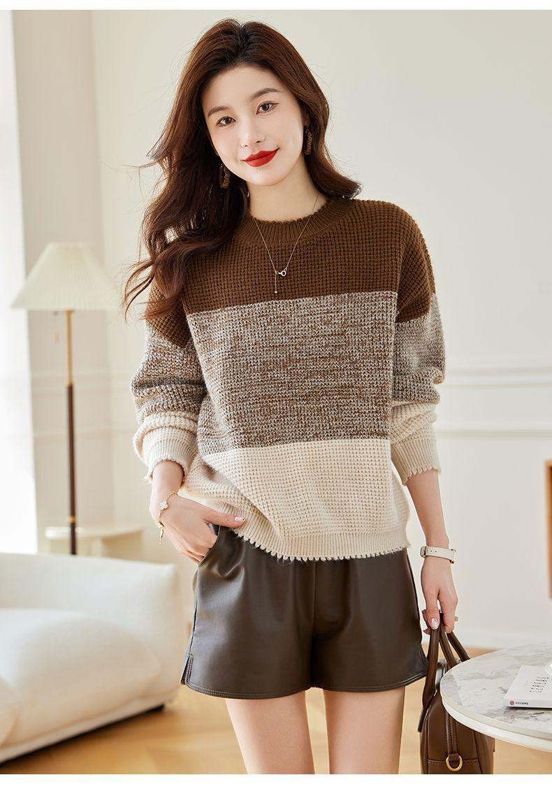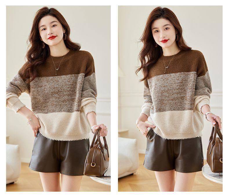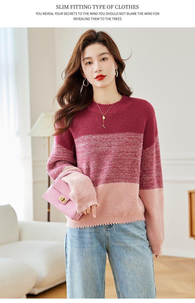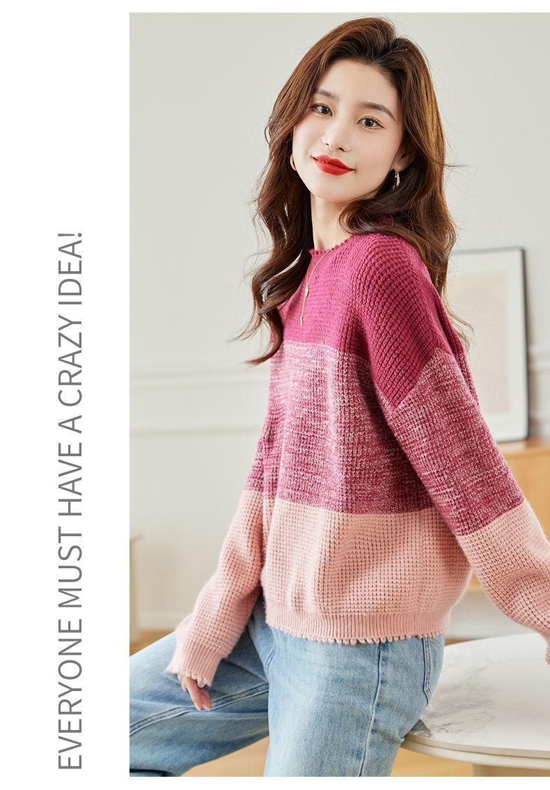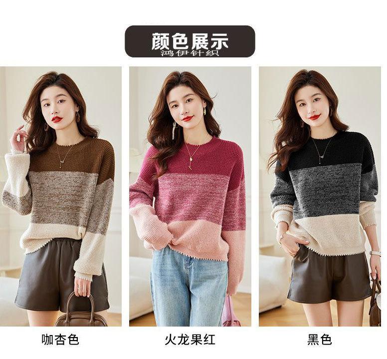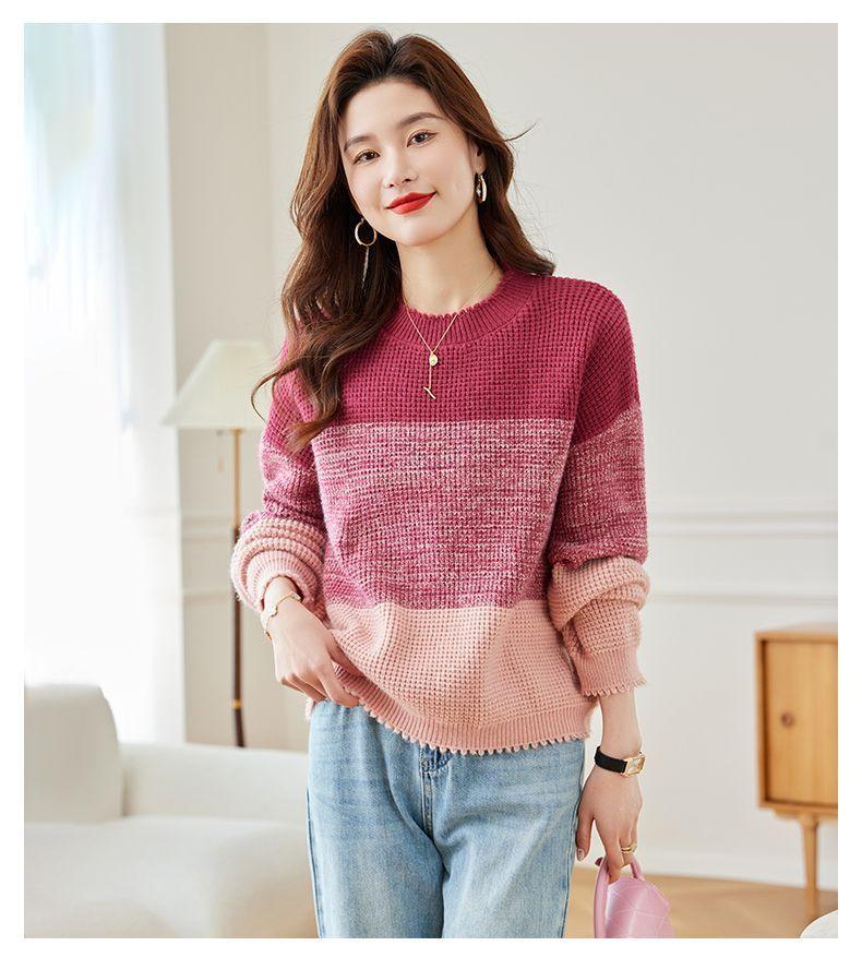 Suéter de Estambre Floral a Rayas de Color Contrastante para Mujer Otoño e Invierno 24 Nuevo Estilo Coreano Estilo Lazy Holgado Talla Grande Suéter con Camisa Interior