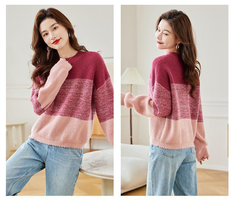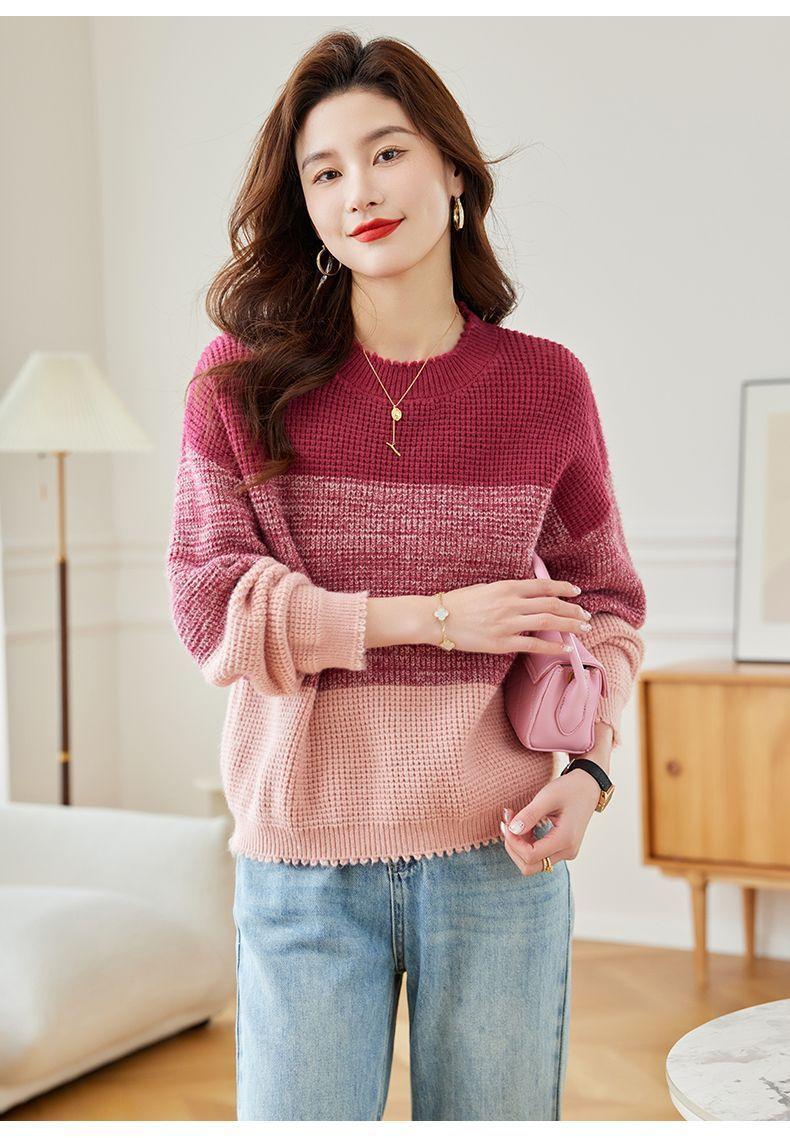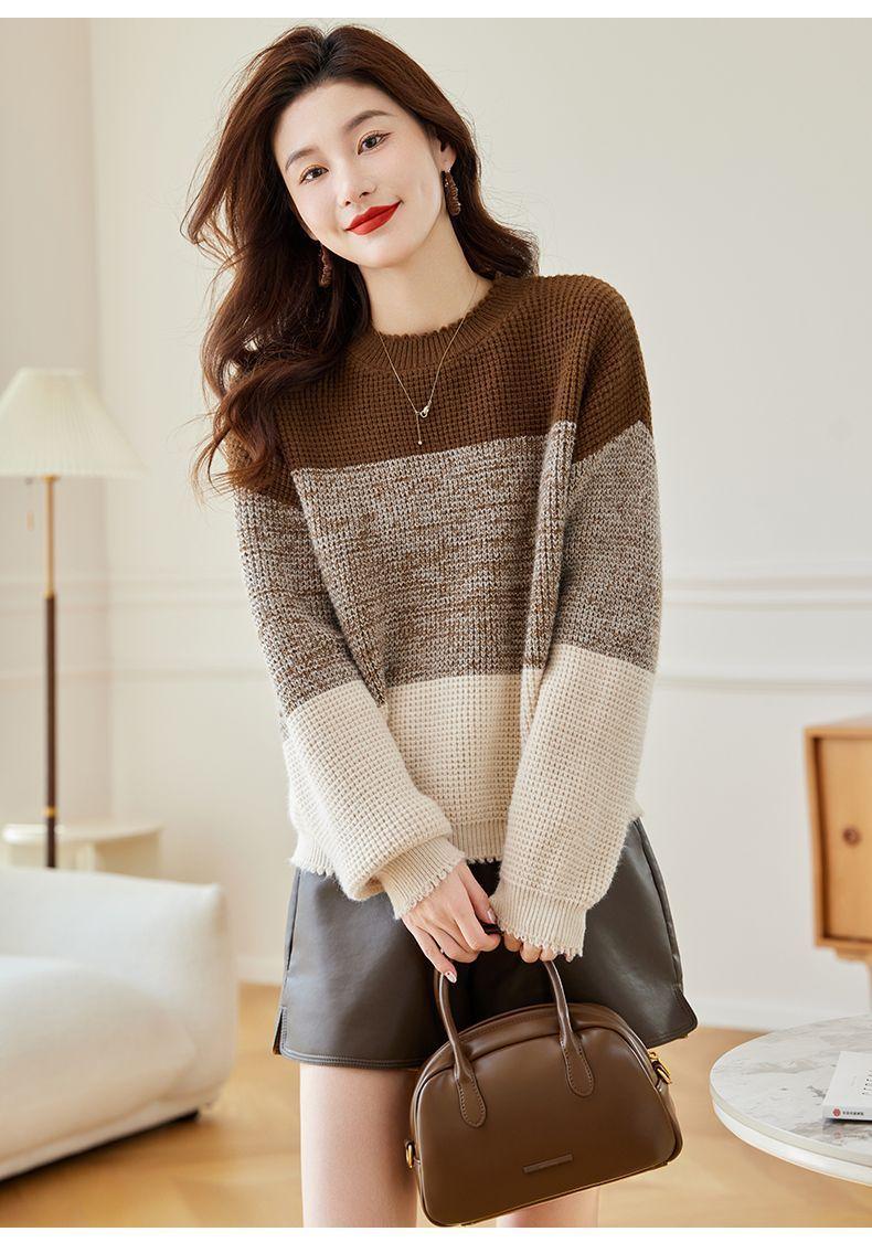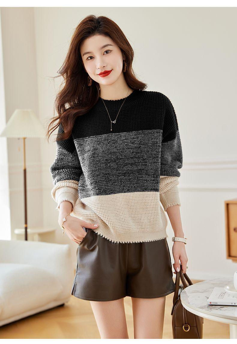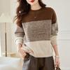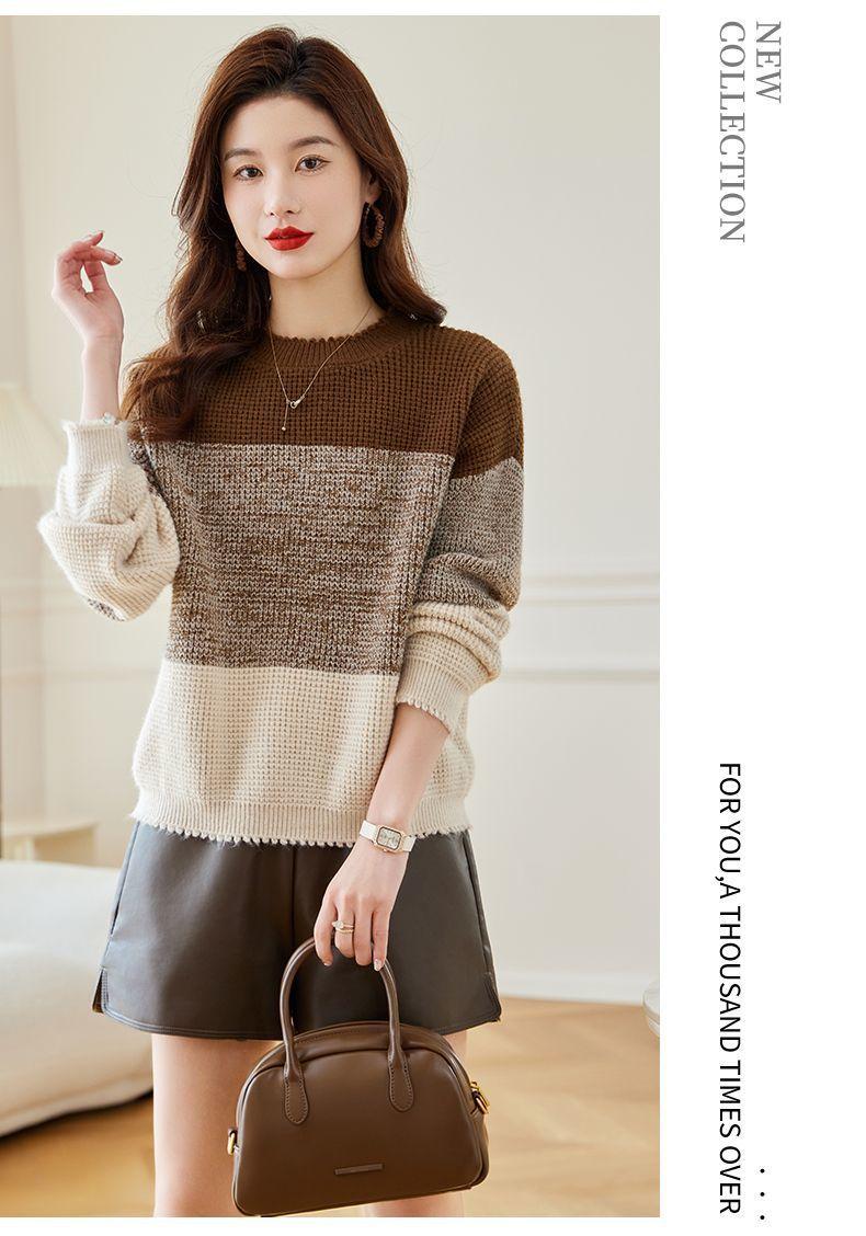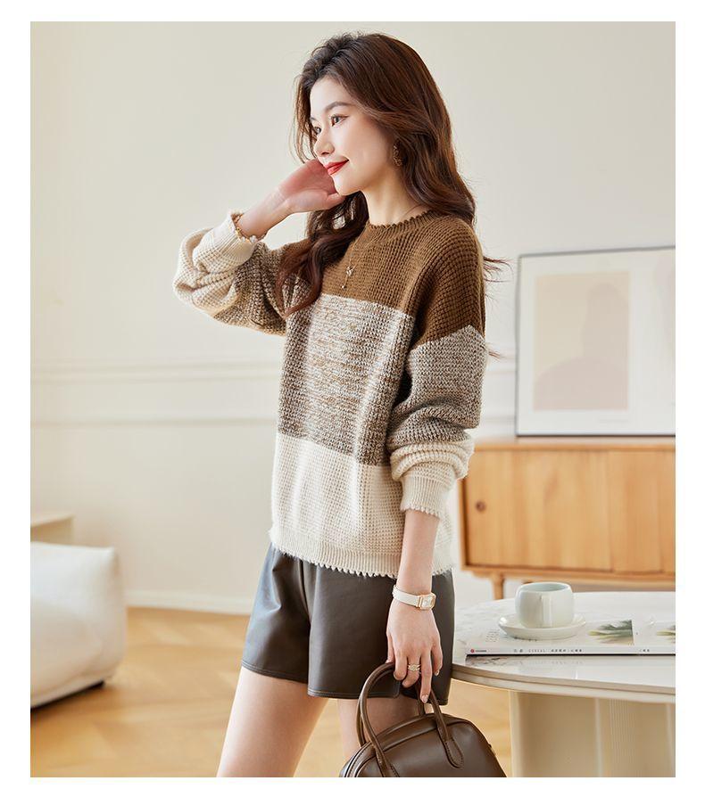 Suéter de Estambre Floral a Rayas de Color Contrastante para Mujer Otoño e Invierno 24 Nuevo Estilo Coreano Estilo Lazy Holgado Talla Grande Suéter con Camisa Interior