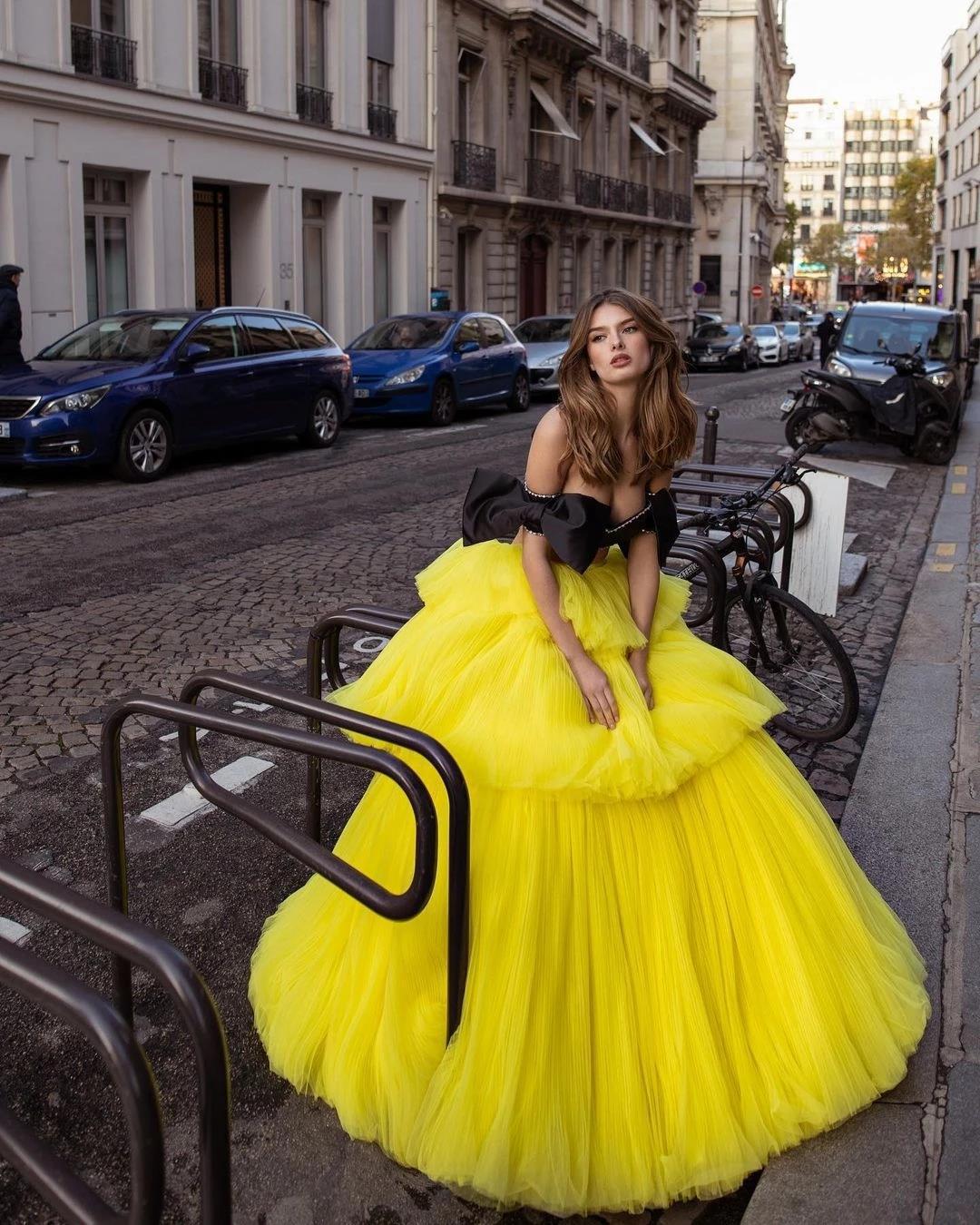 Tema Fotografía Vestido Amarillo Abullonado Strapless Lujo Ligero de Alta Gama Vestido Francés de Pastel Estudio Fotográfico Foto de Viaje Estilo Princesa Vestido de Novia