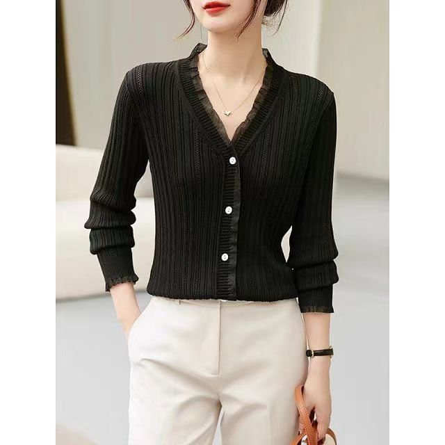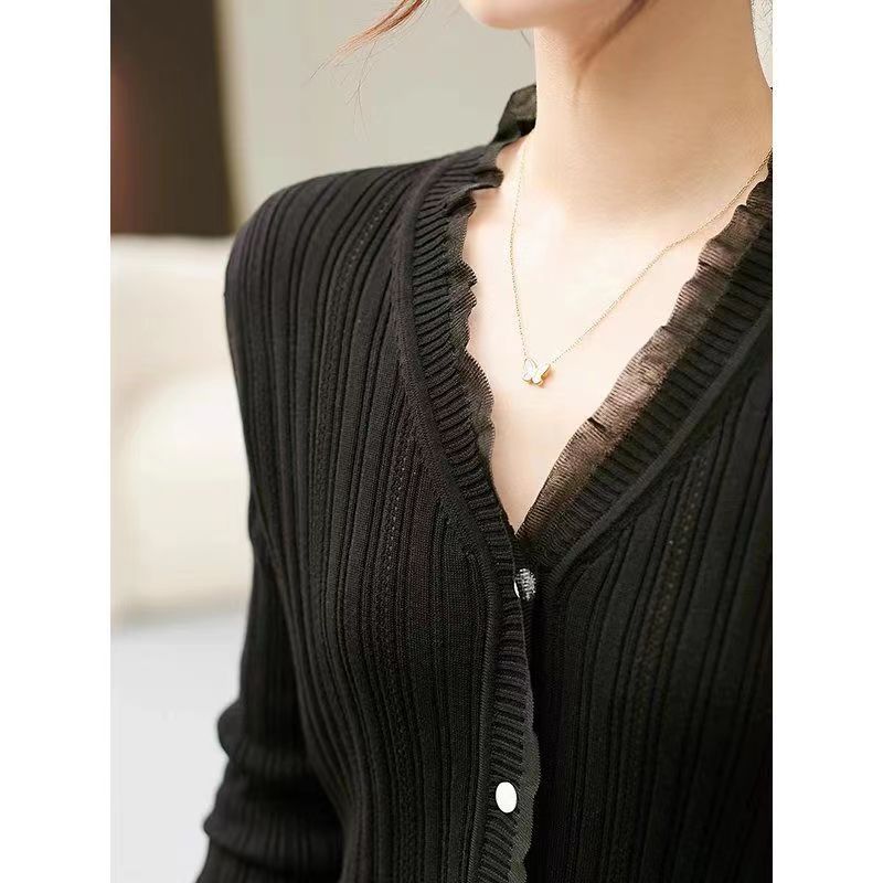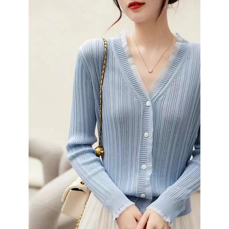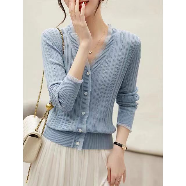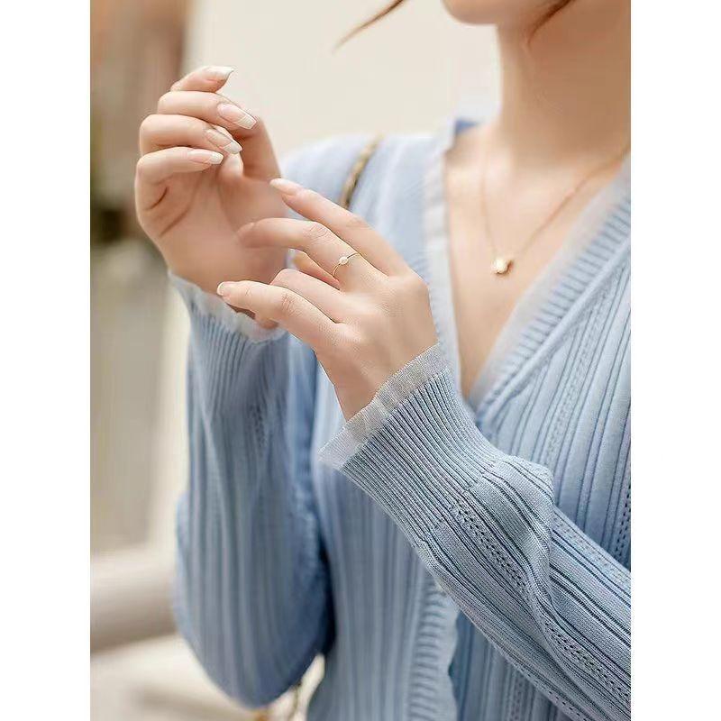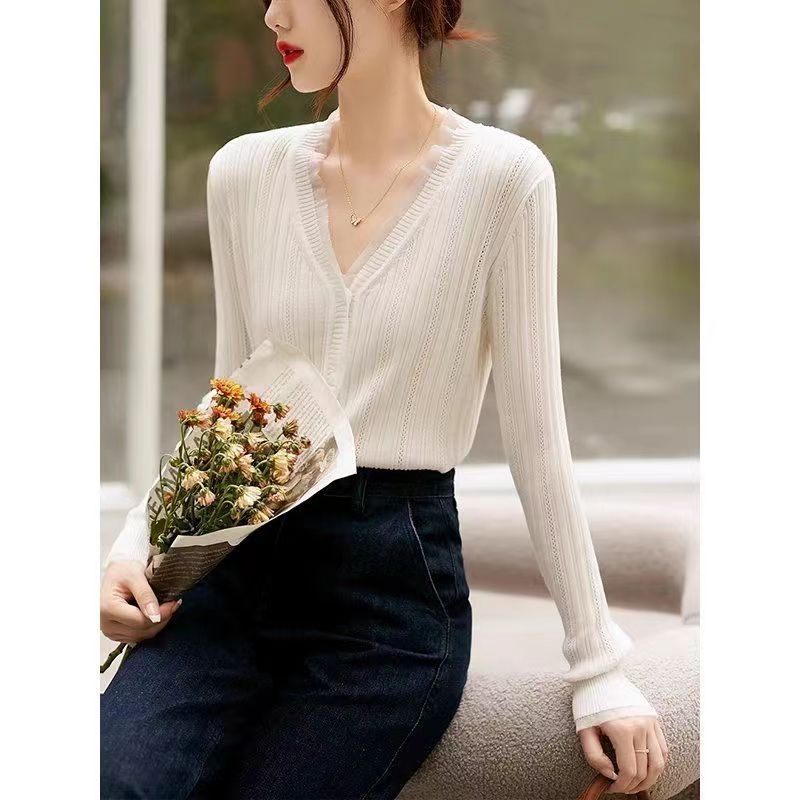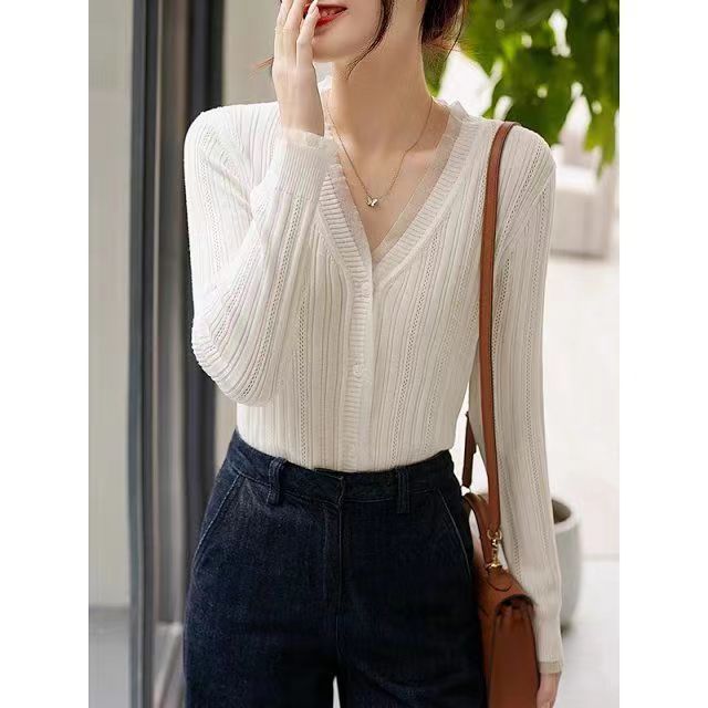 Cárdigan de punto con cuello en V blanco retro francés de primavera y otoño para mujer, diseño de nicho, prenda exterior fina de manga larga.