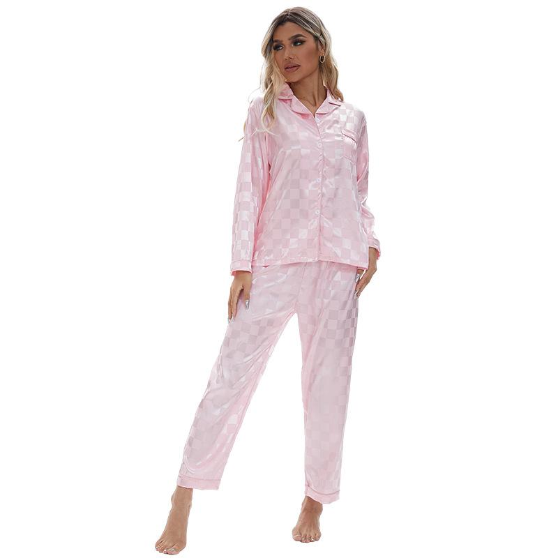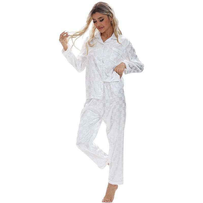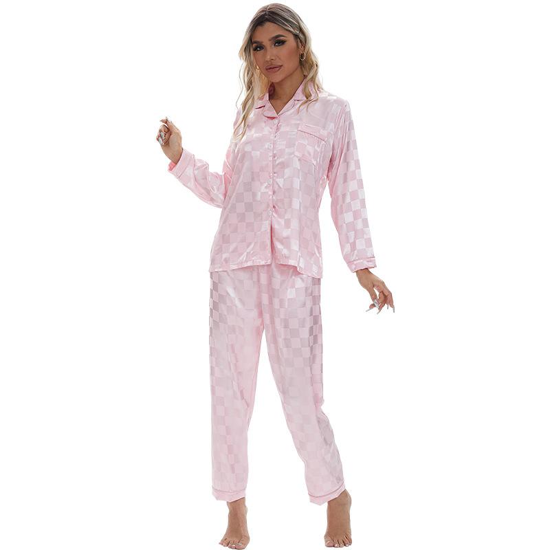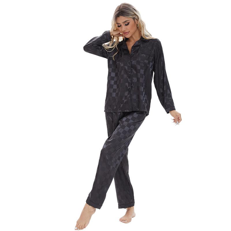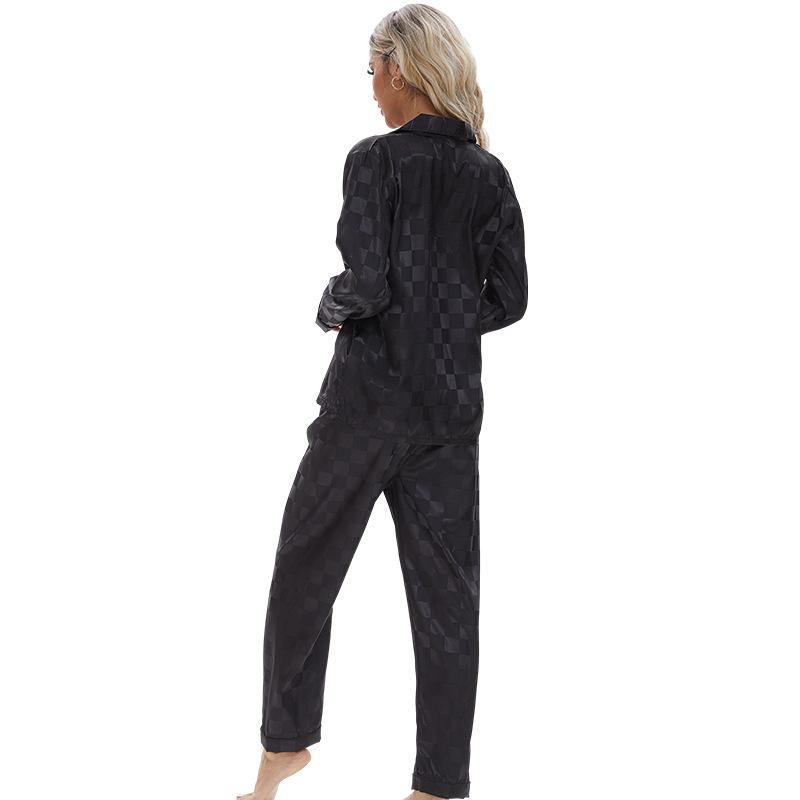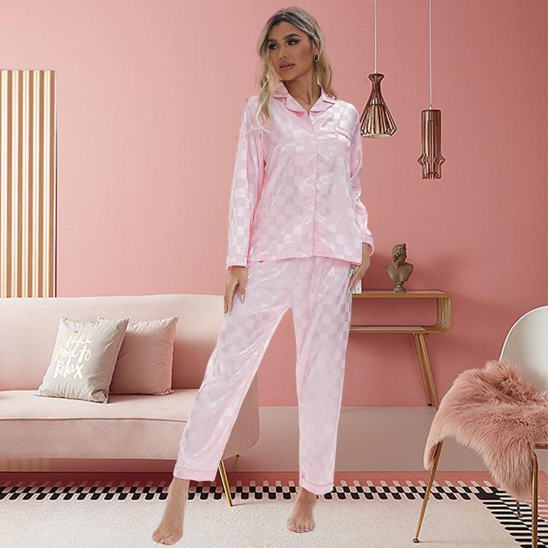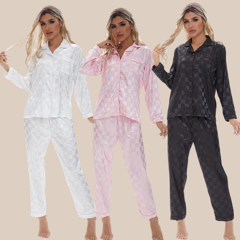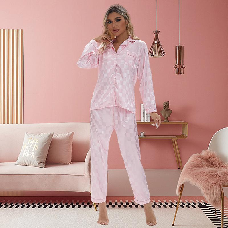 Pijama de Cuadros Jacquard, Ropa de Dormir Larga con Patrón de Tablero de Ajedrez de Seda Sintética, Set Multicolor en Stock, Estilo Europeo y Americano