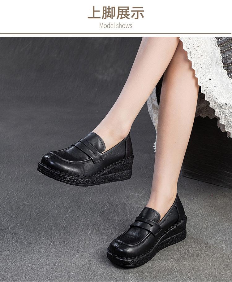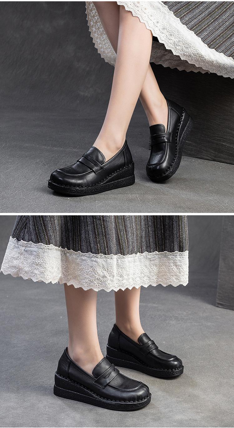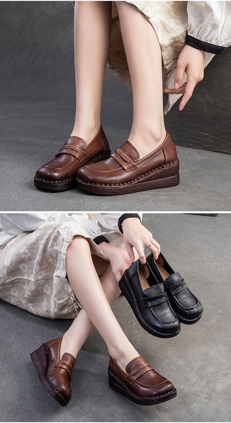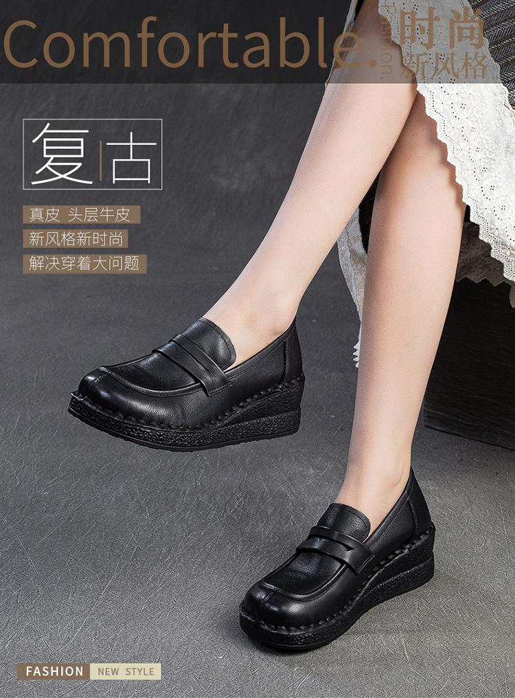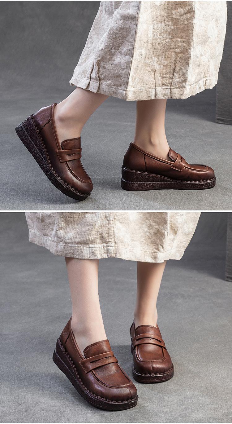 Shanghai Jiejie 2025 Primavera/Verano Nuevo Estilo Retro Cómodo Zapato Madre Capa Superior Zapatos de Cuña de Piel de Vaca Zapatos de Mujer de Viaje