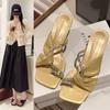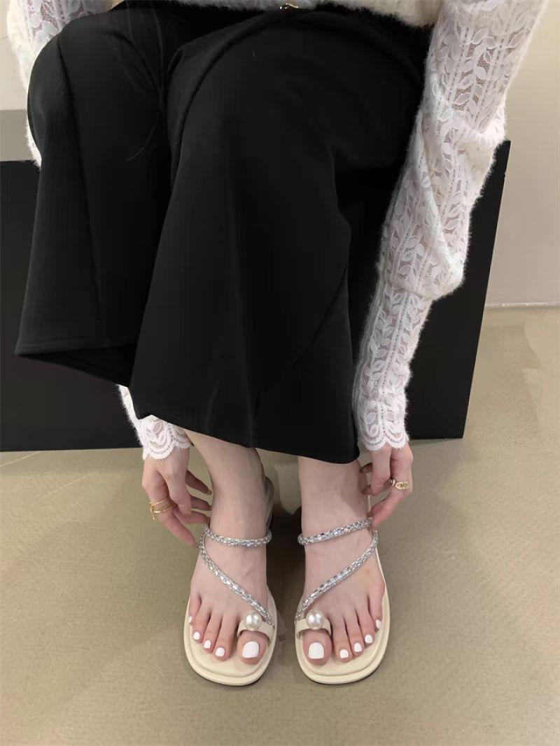 Sandalias y Pantuflas de Tacón Grueso con Punta Descubierta y Perlas para Mujer Verano 2025 Nuevo Sandalias de Vacaciones con Pedrería con Falda de Punta Cuadrada
