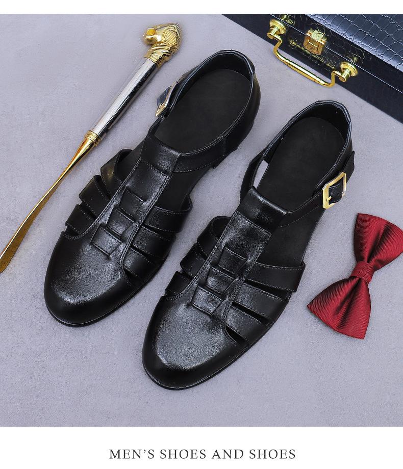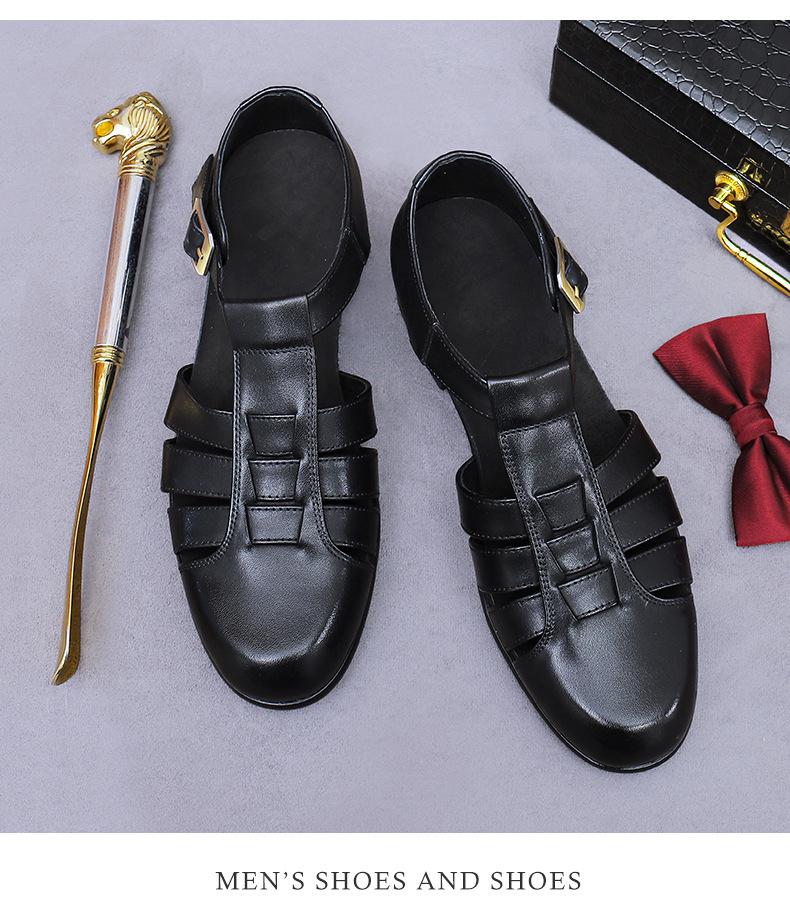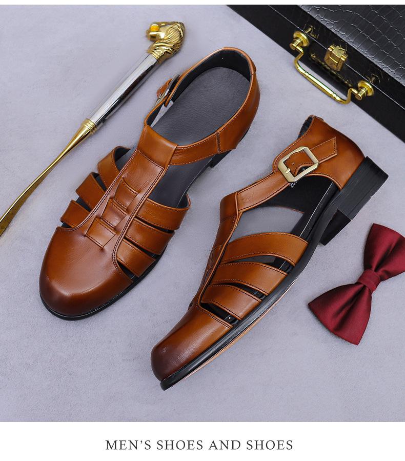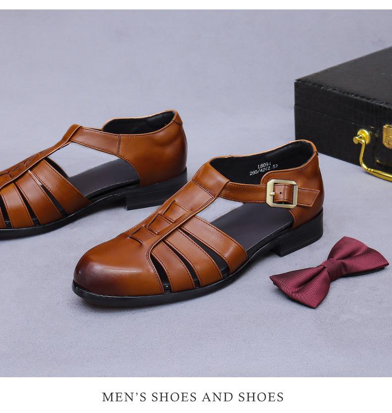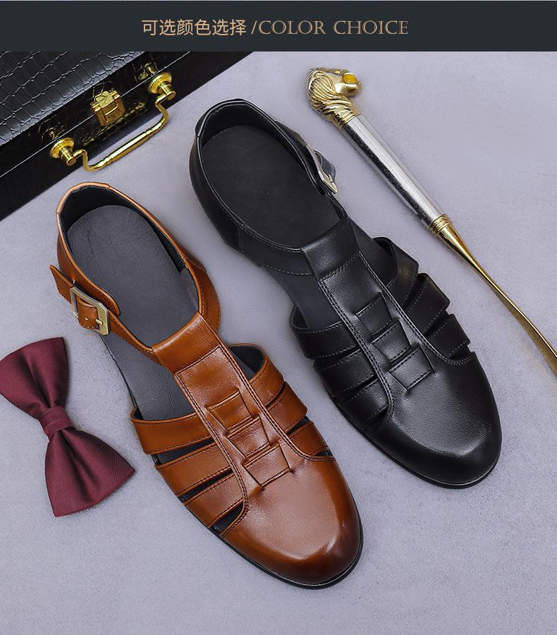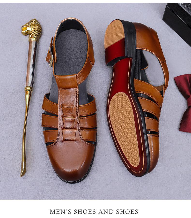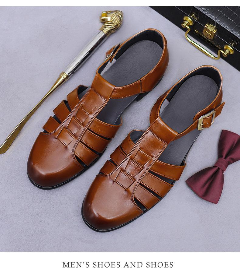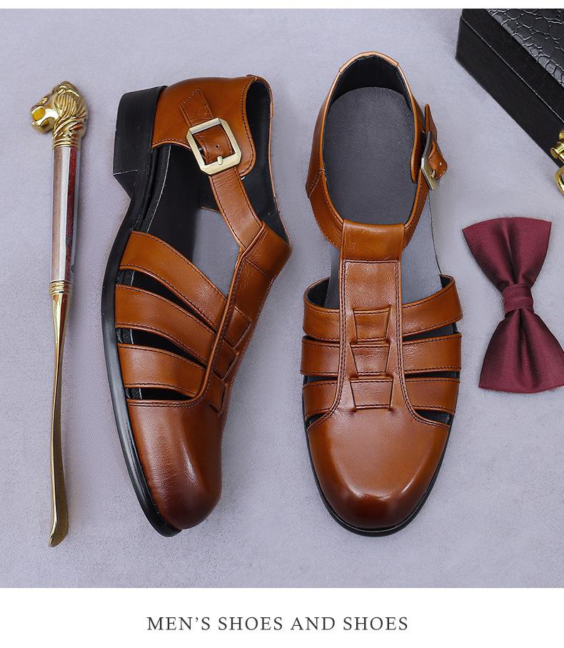 Sandalias de cuero para hombre, estilo retro, con puntera superior, de piel de vaca auténtica, para conducir, con hebilla, transpirables, para verano