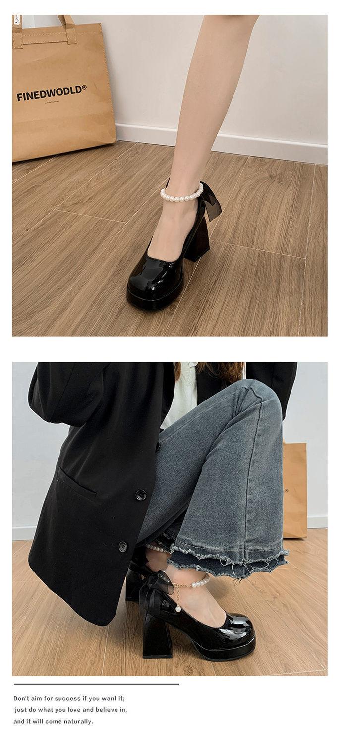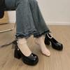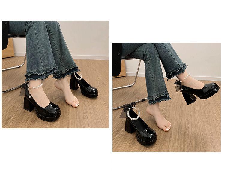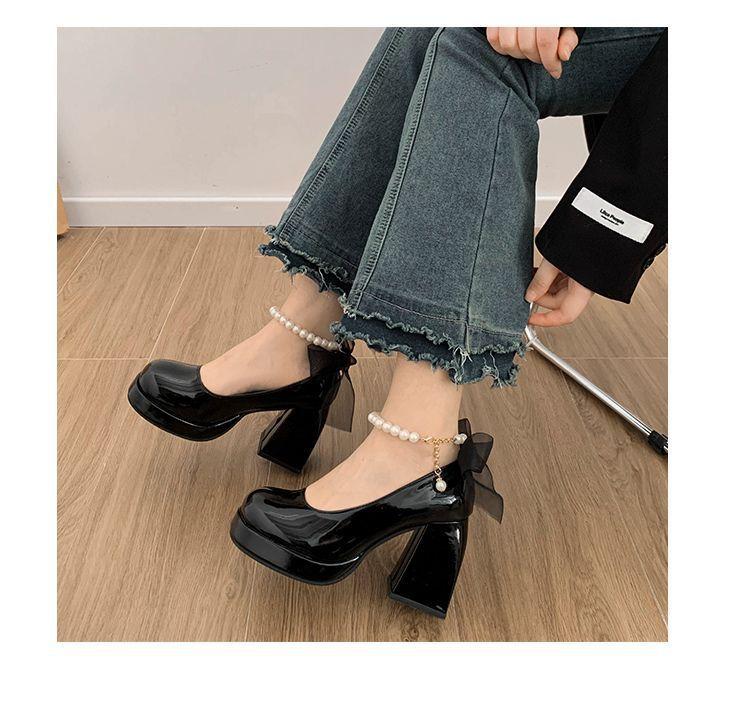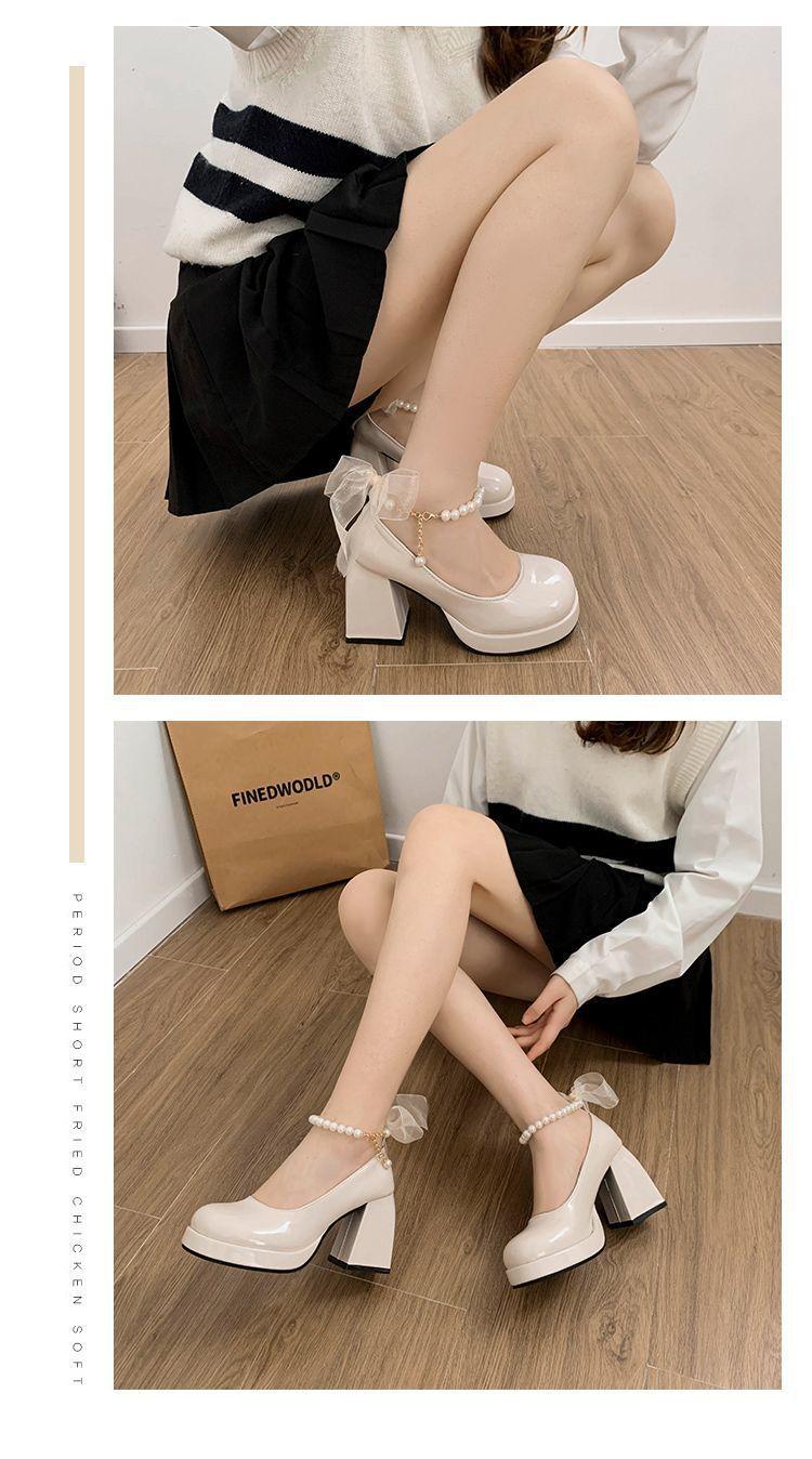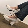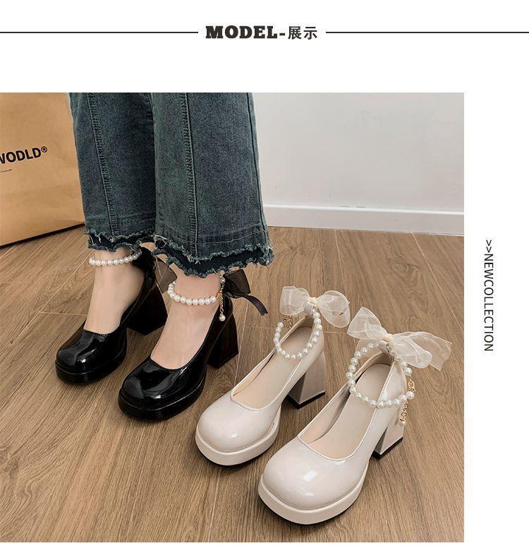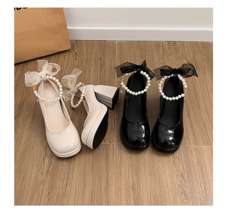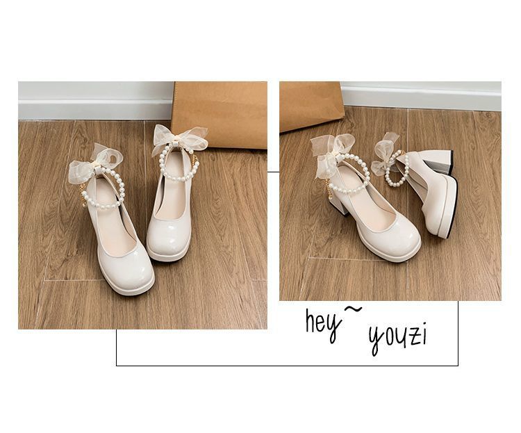Zapatos de Tacón Mary Jane para Mujer 2025 Primavera y Otoño Nuevo Estilo Lazo Punta Redonda Francesa Blanco Perla Retro Tacón Grueso