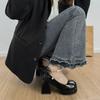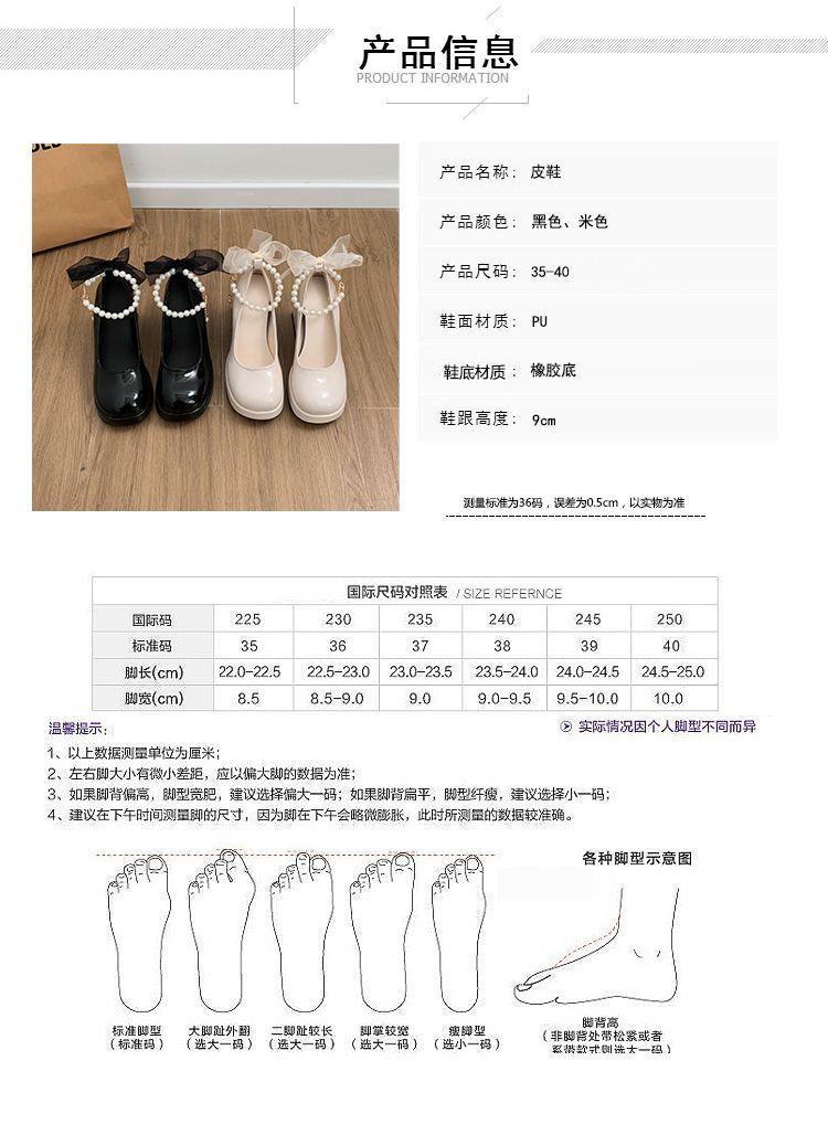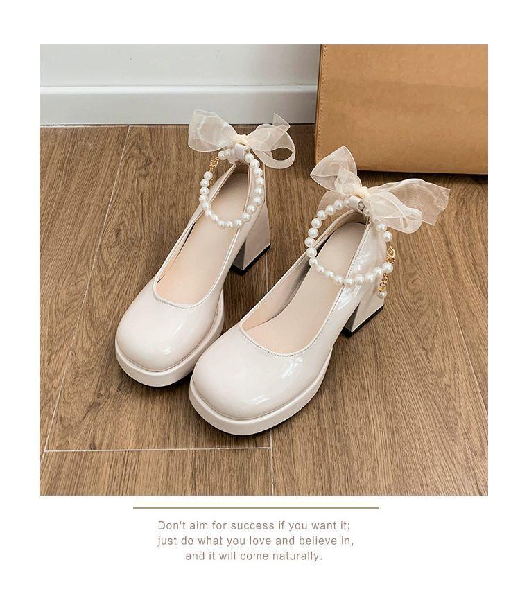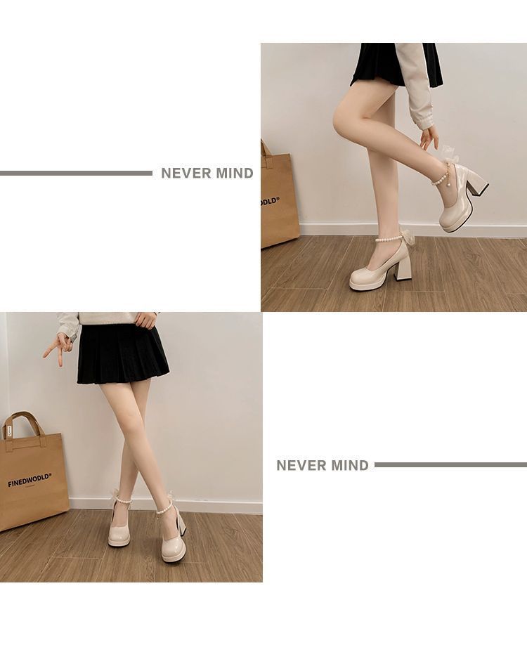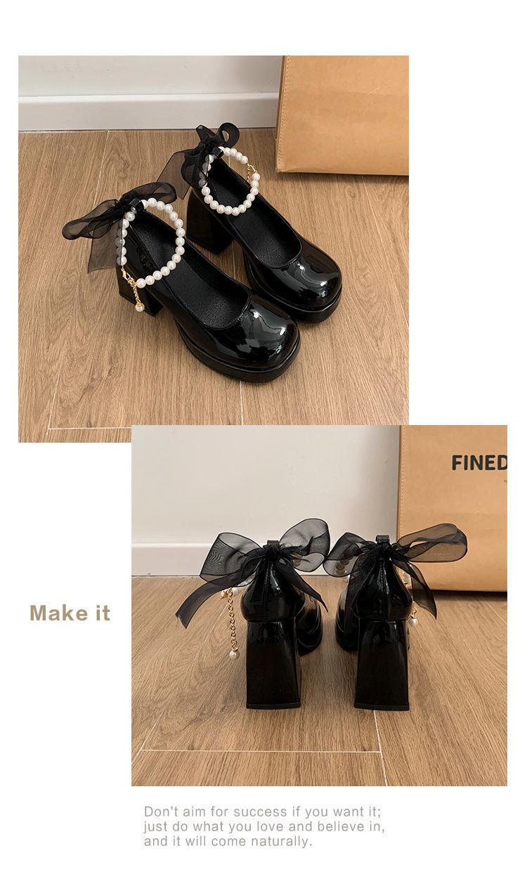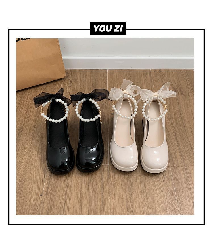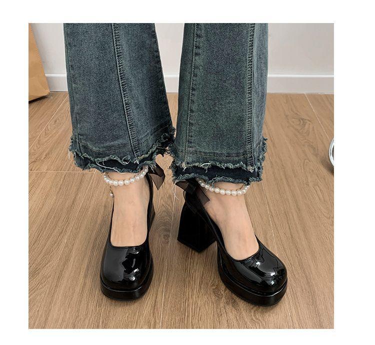 Zapatos de Tacón Mary Jane para Mujer 2025 Primavera y Otoño Nuevo Estilo Lazo Punta Redonda Francesa Blanco Perla Retro Tacón Grueso