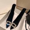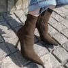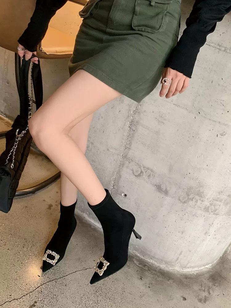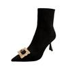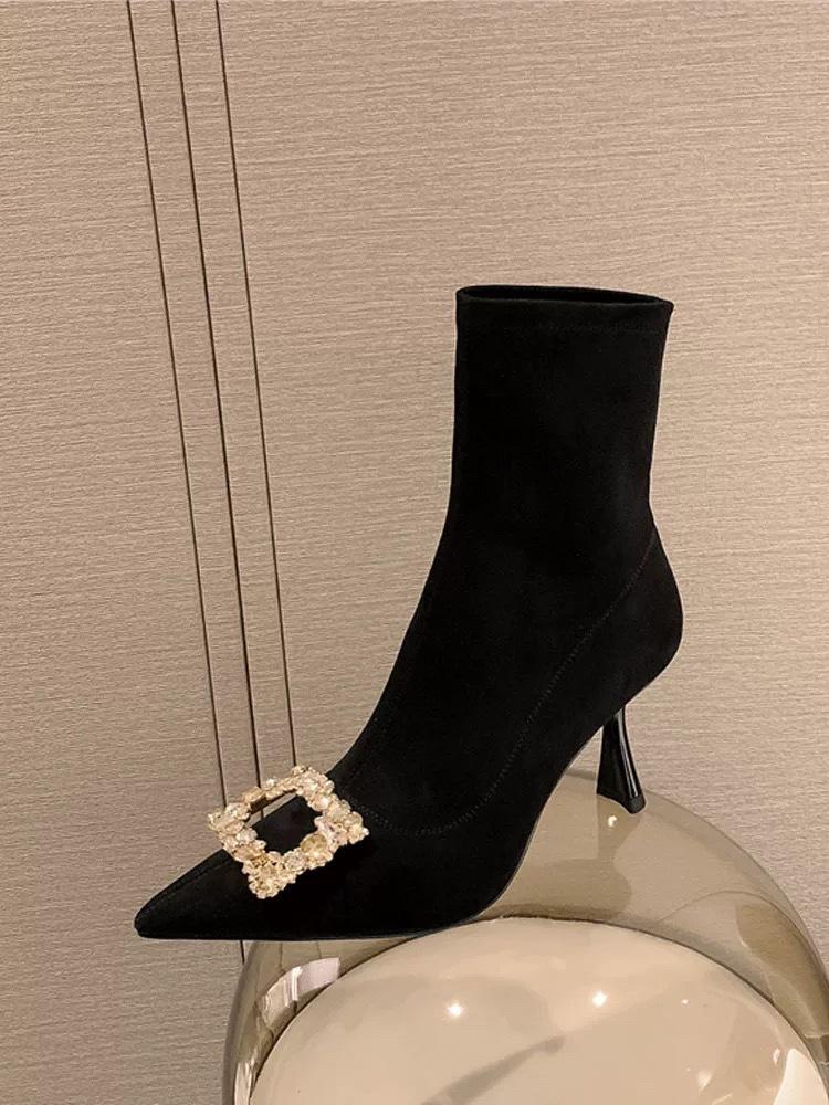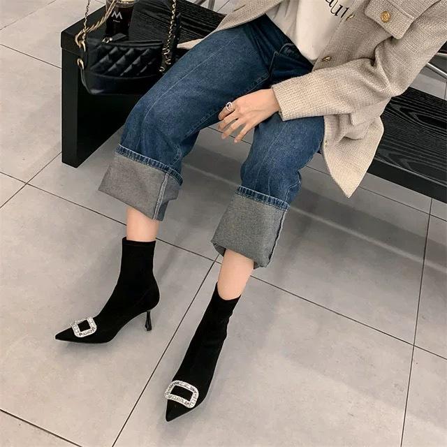 Botas de Otoño e Invierno 2024 para Mujer Tacones de Aguja Botas Elásticas de Ante Negro Hebilla Cuadrada de Pedrería Punta Afilada Botas de Moda
