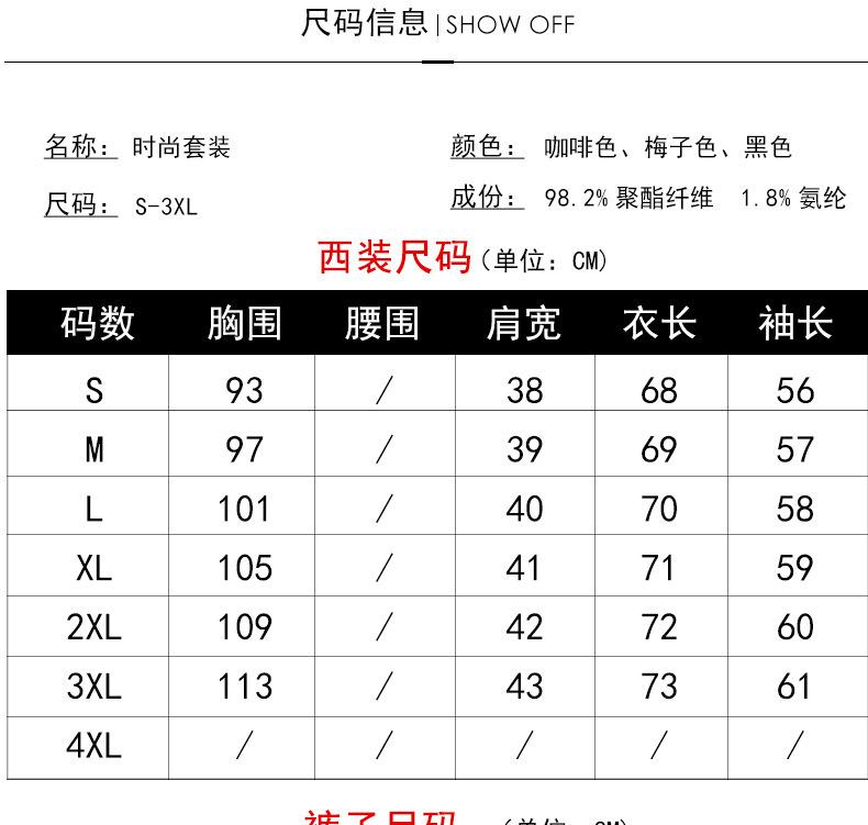 Black one piece suit, Plum color one piece suit, Brown one piece suit, Black suit + pants, Plum suit + pants, Brown suit + pants