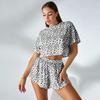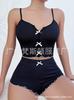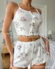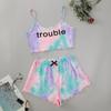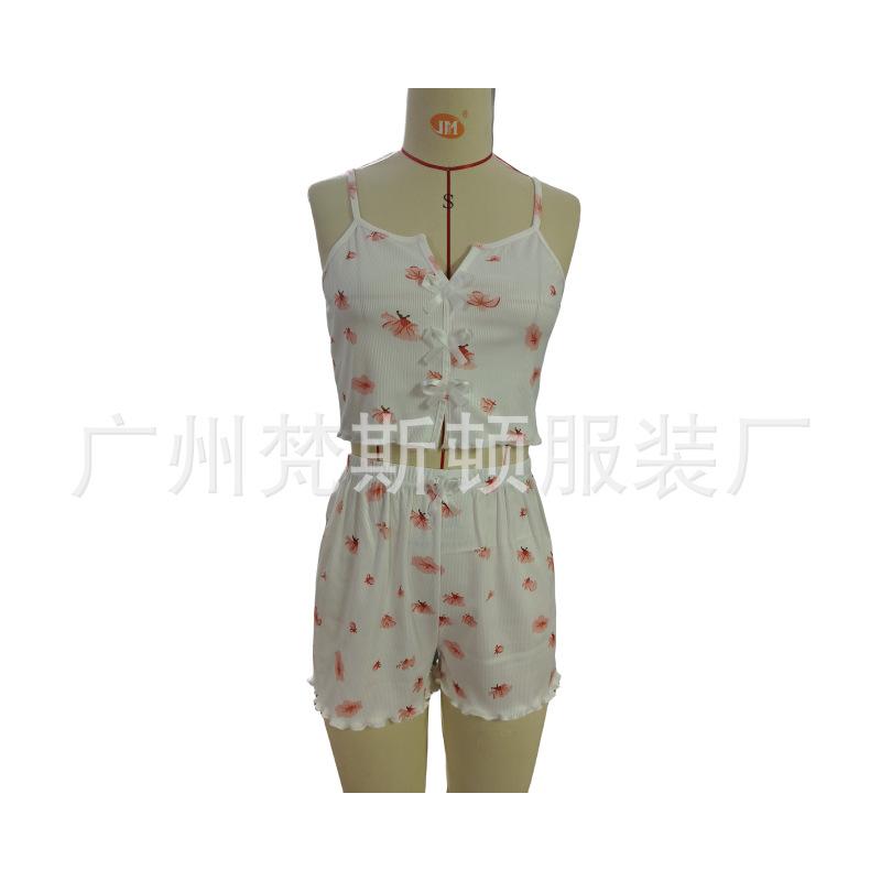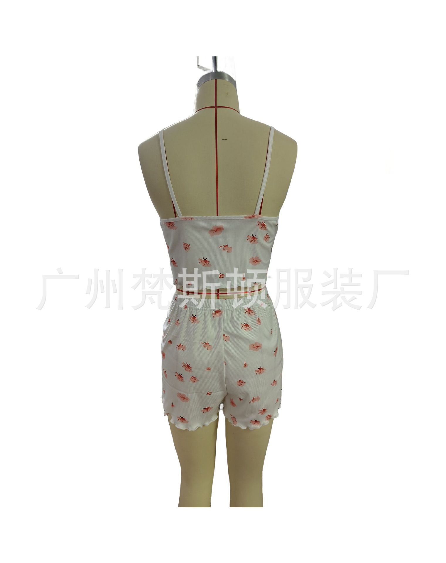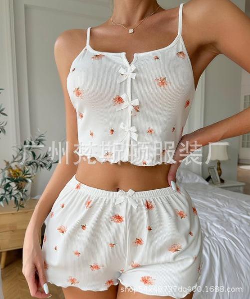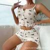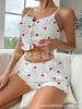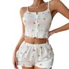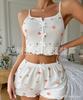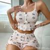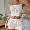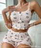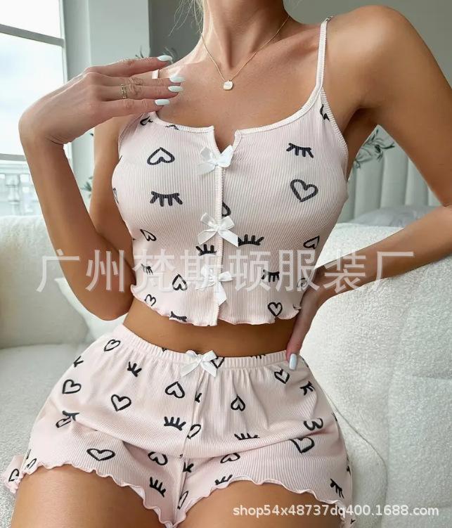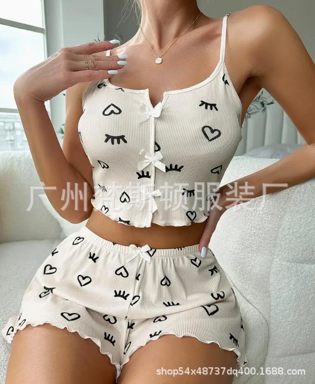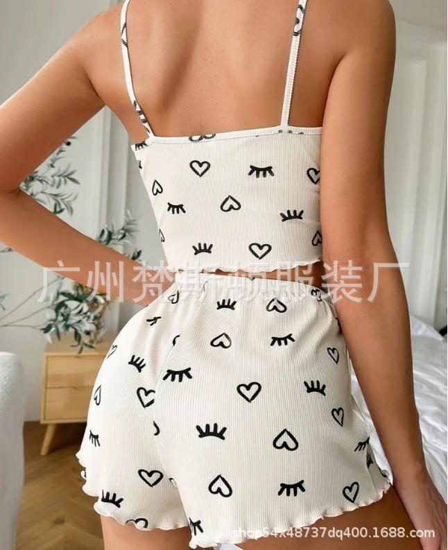 Conjunto de pijama europeo y americano 2023 con estampado de pestañas en forma de corazón, top de tirantes con cuello en V, shorts con ribete de lechuga, pijama para mujer